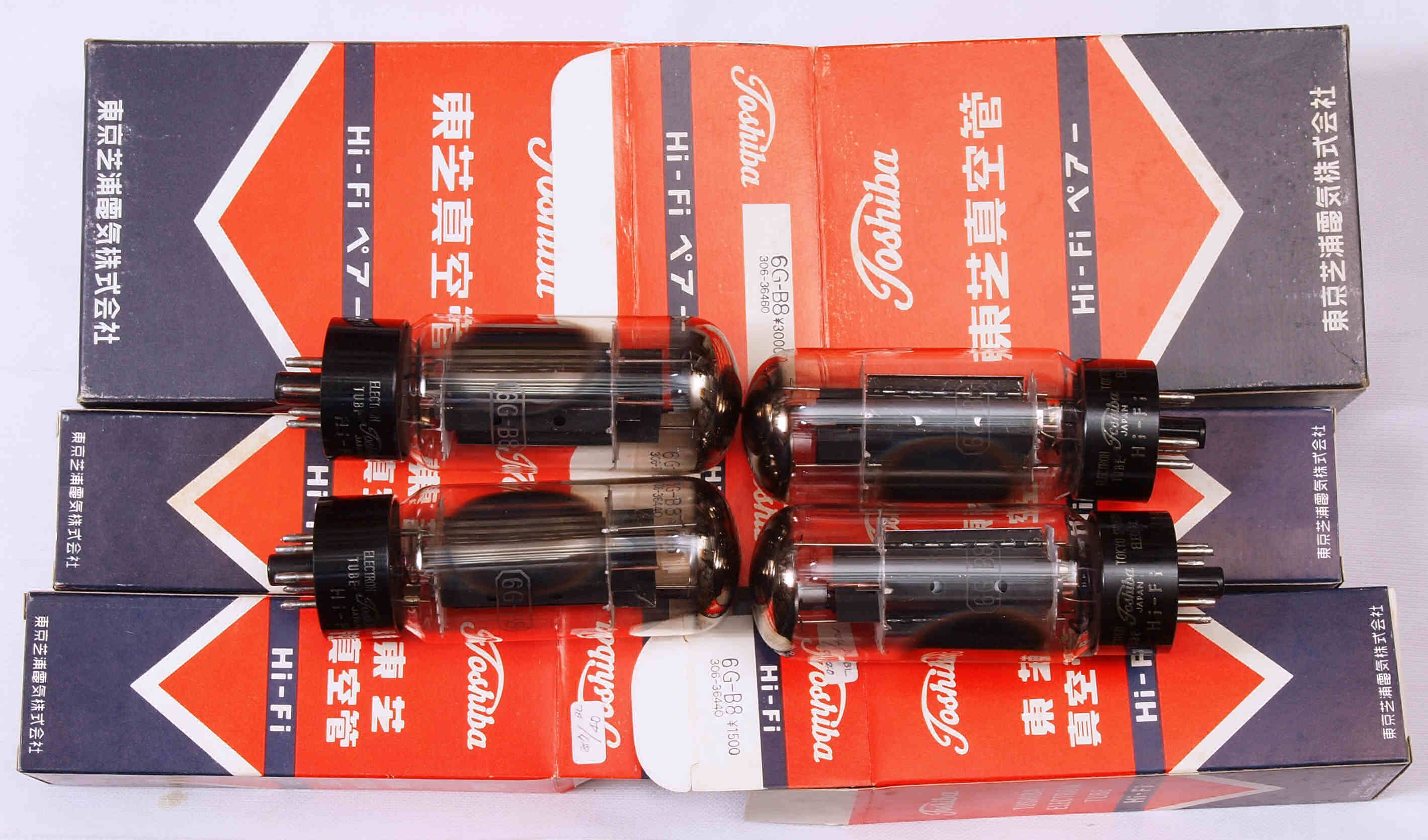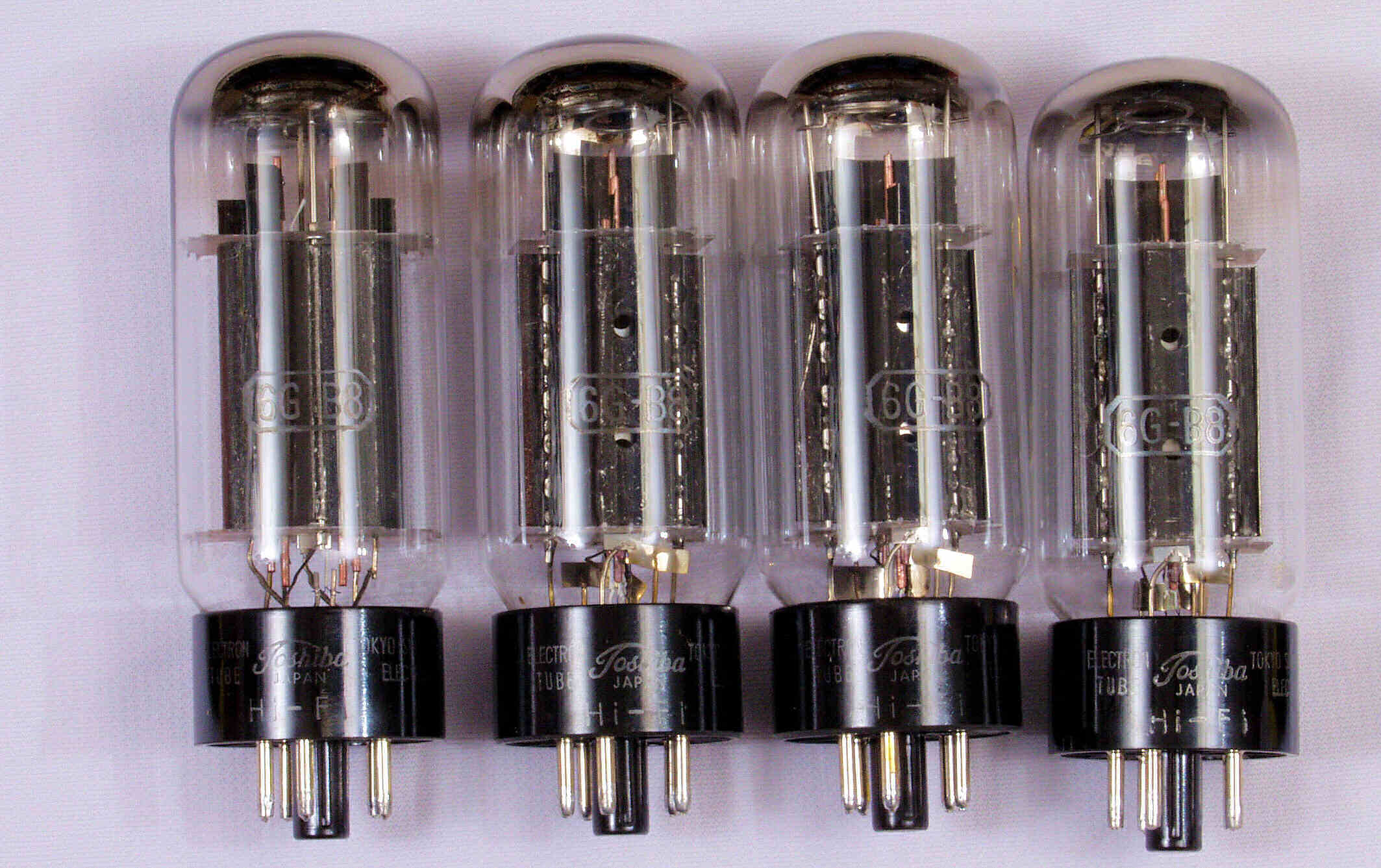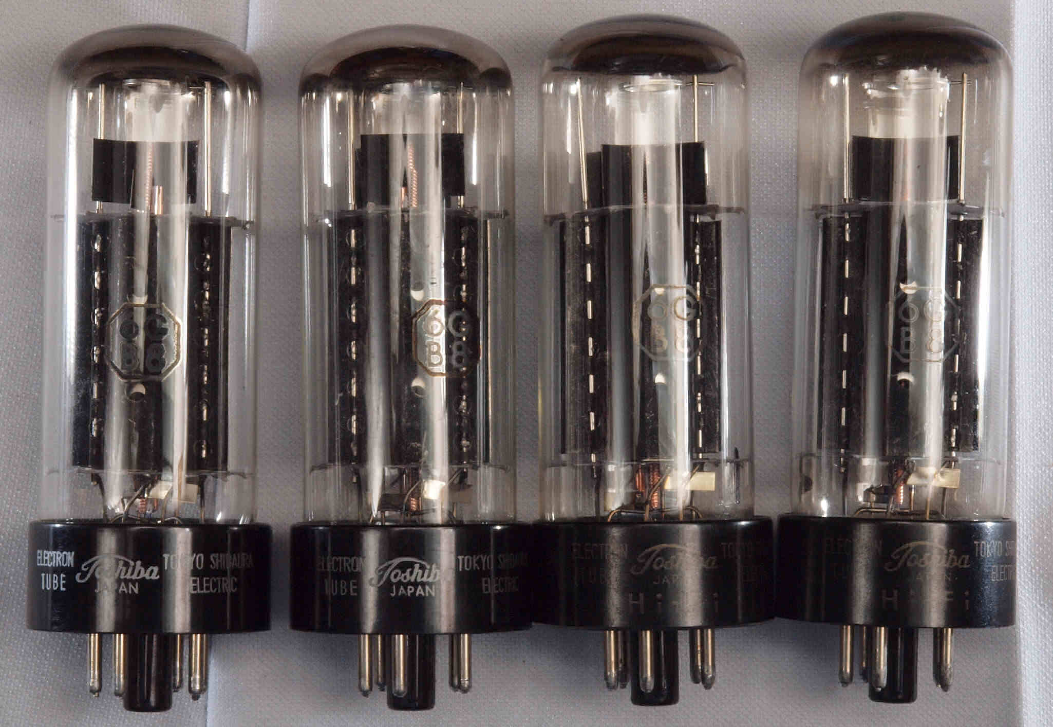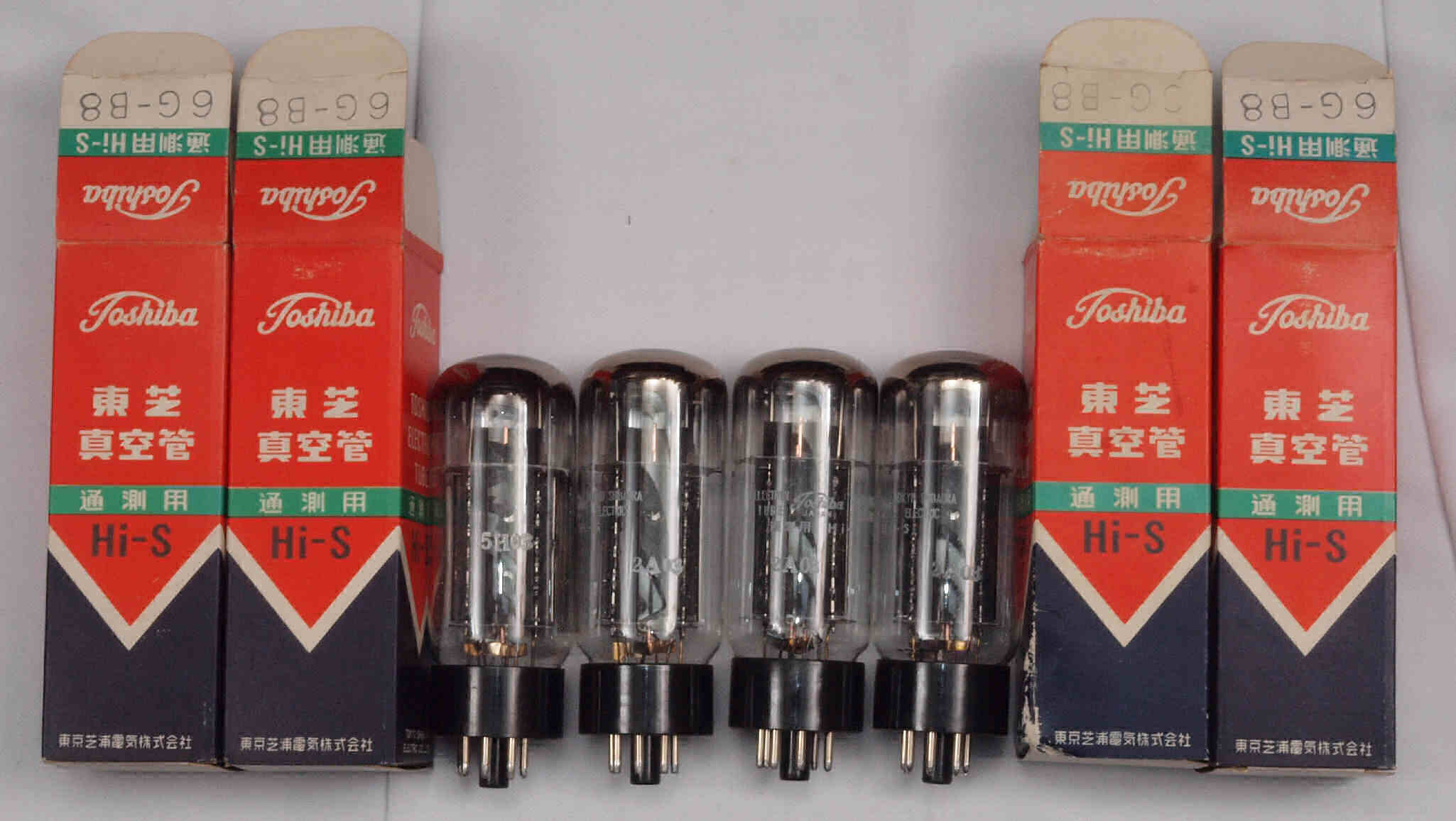 | 左から 1本目 6G-B8 測定。 Gm=20000μmho、Ip=97.6mA。 2本目 6G-B8 測定。 Gm=20000μmho、Ip=98.2mA。 3本目 6G-B8 測定。 Gm=21000μmho、Ip=102.7mA。 4本目 6G-B8 測定。 Gm=19000μmho、Ip=99.2mA。 |