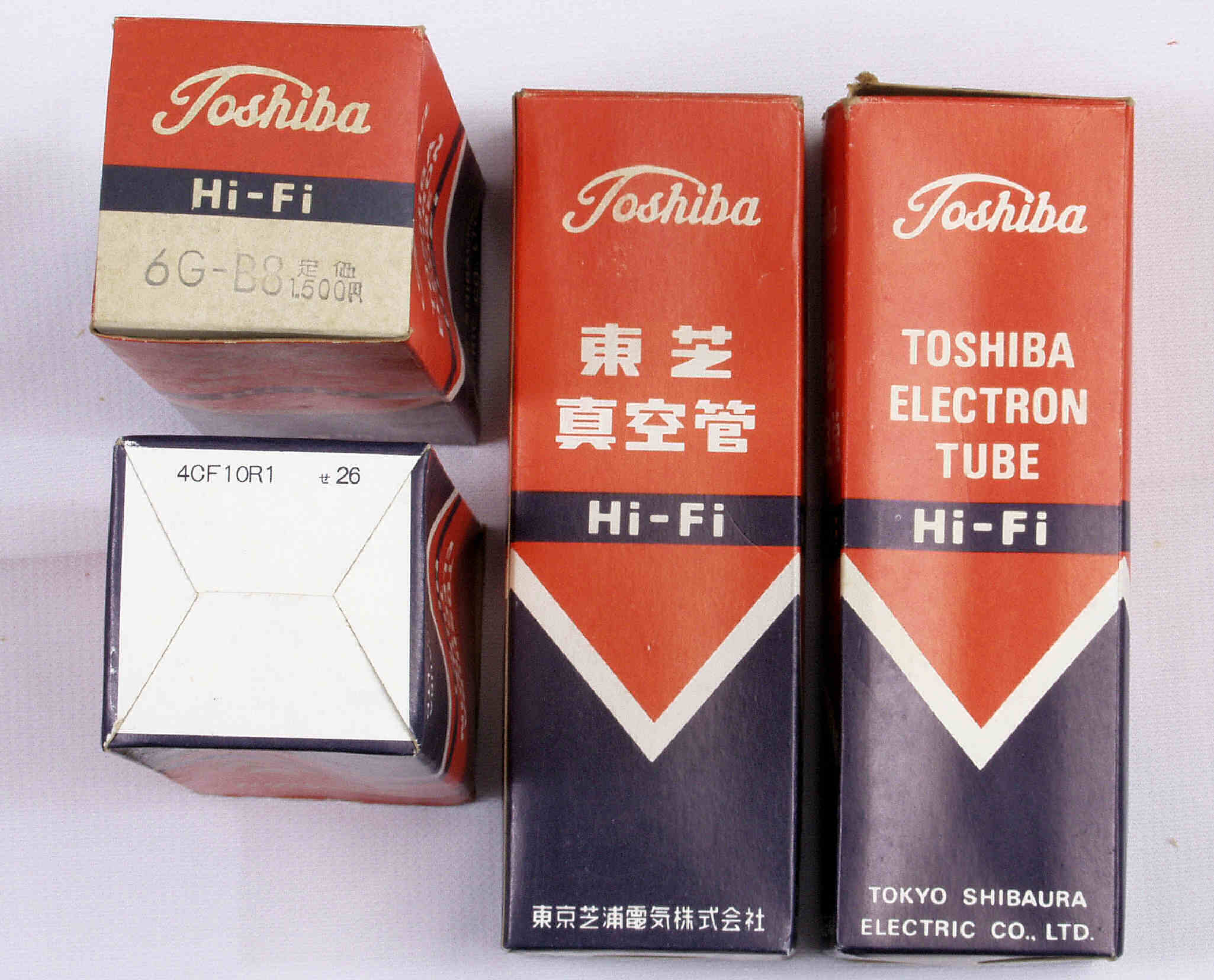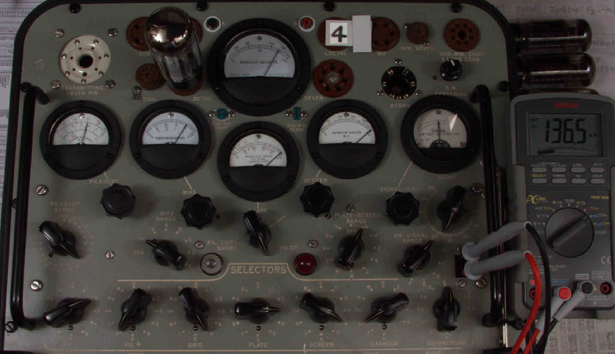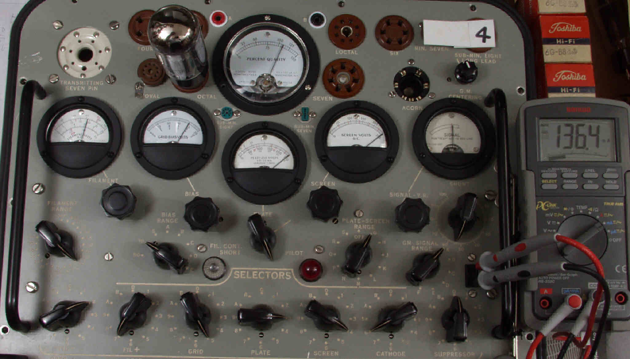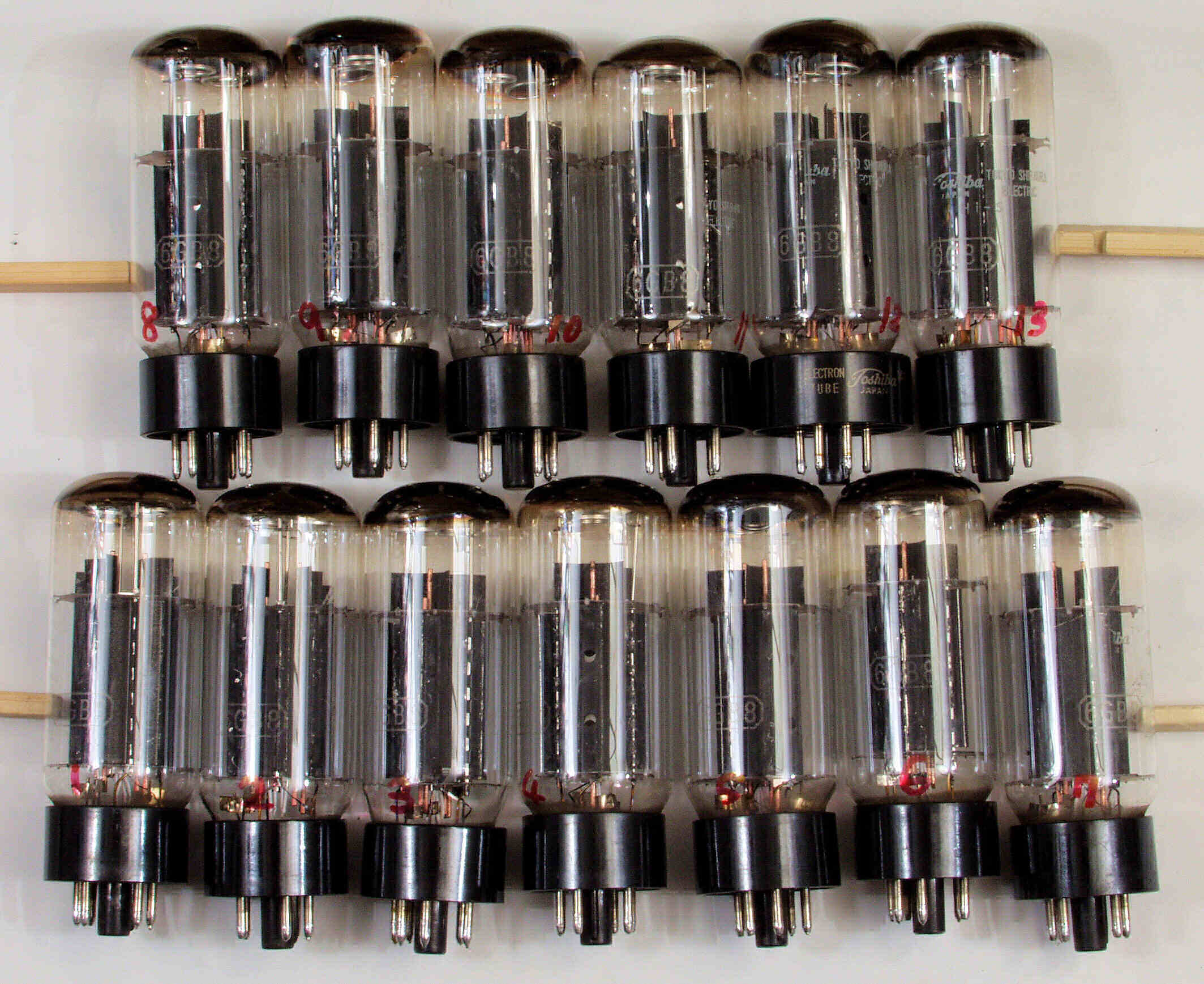 | 左から 1本目 6G-B8 測定。 Gm=20000μmho、Ip=97.6mA。 2本目 6G-B8 測定。 Gm=20000μmho、Ip=98.2mA。 3本目 6G-B8 測定。 Gm=21000μmho、Ip=102.7mA。 4本目 6G-B8 測定。 Gm=19000μmho、Ip=99.2mA。 |