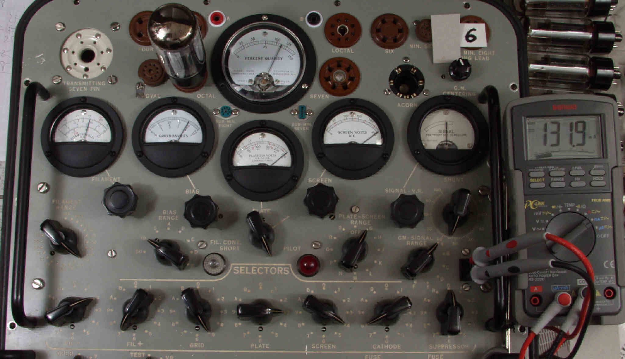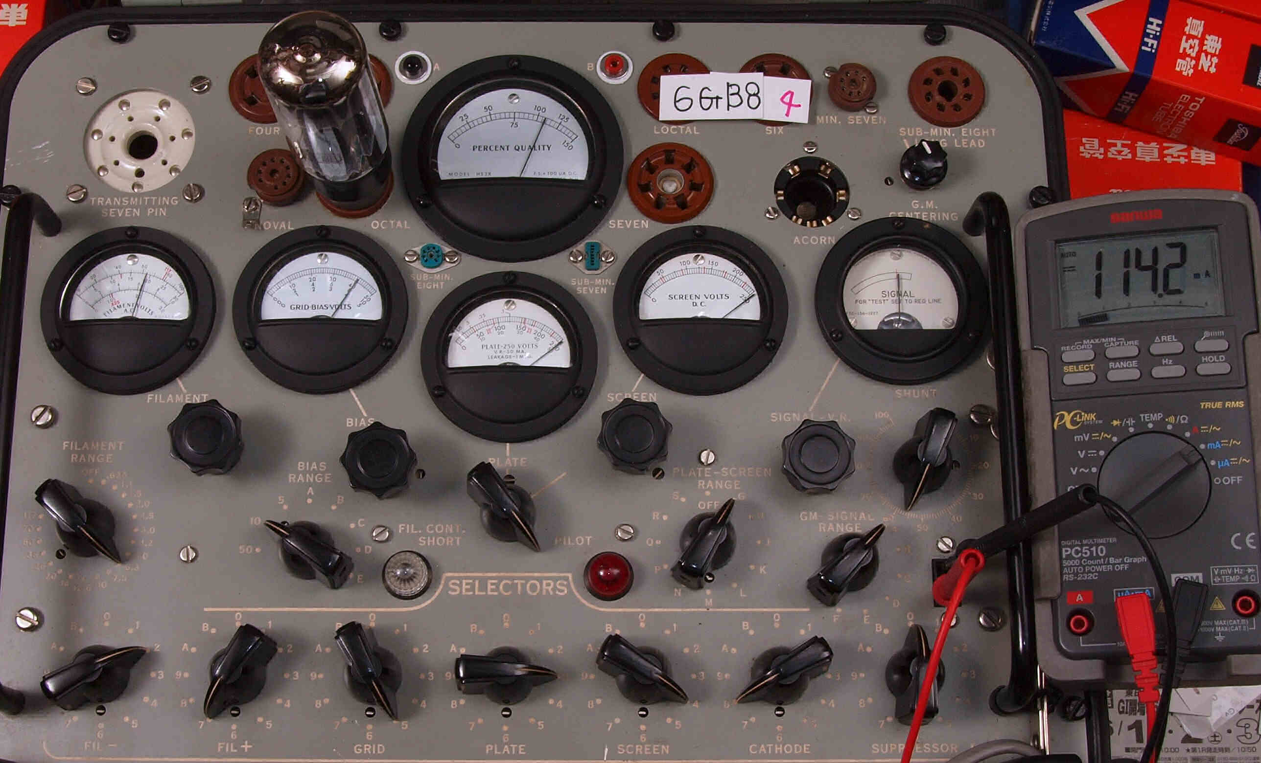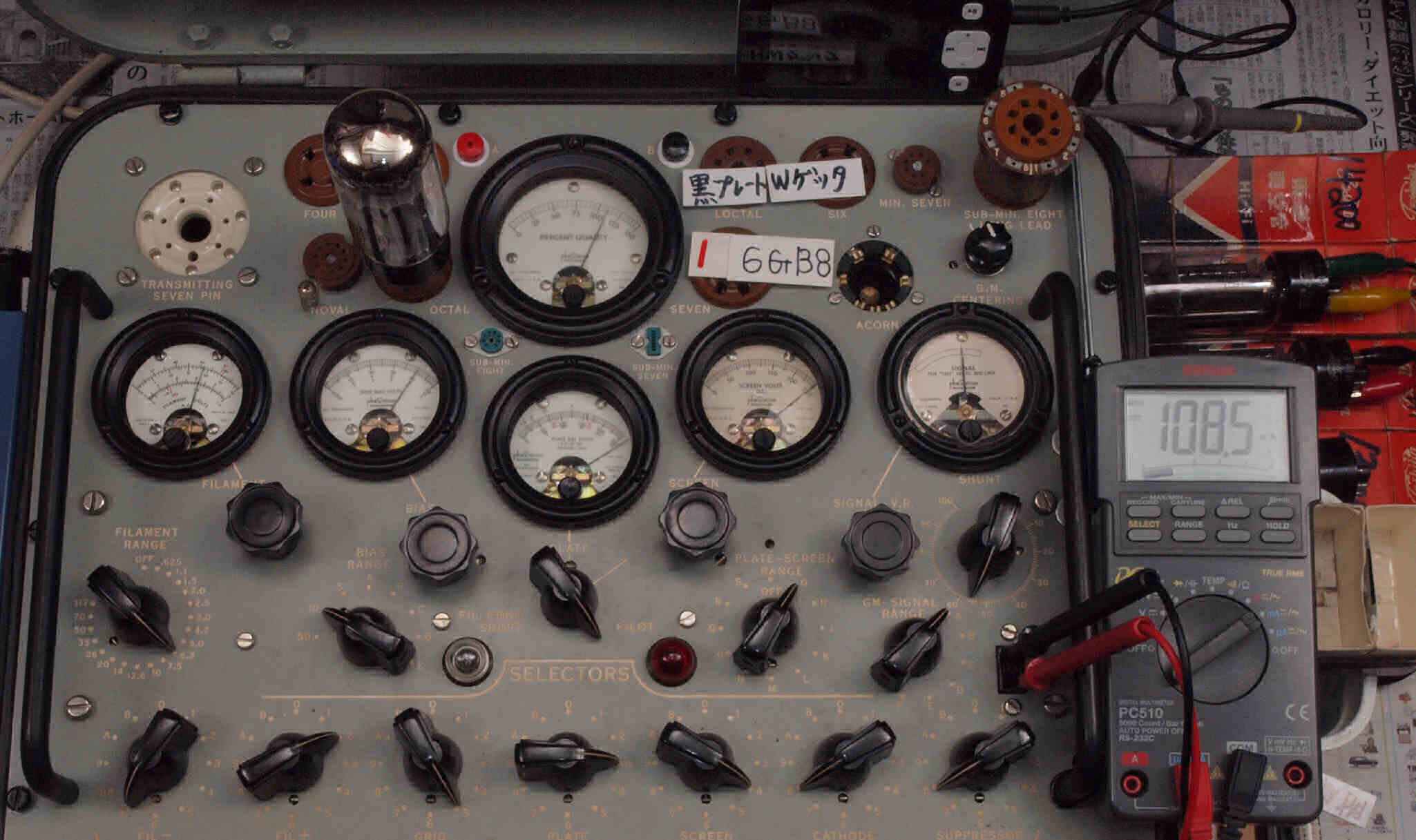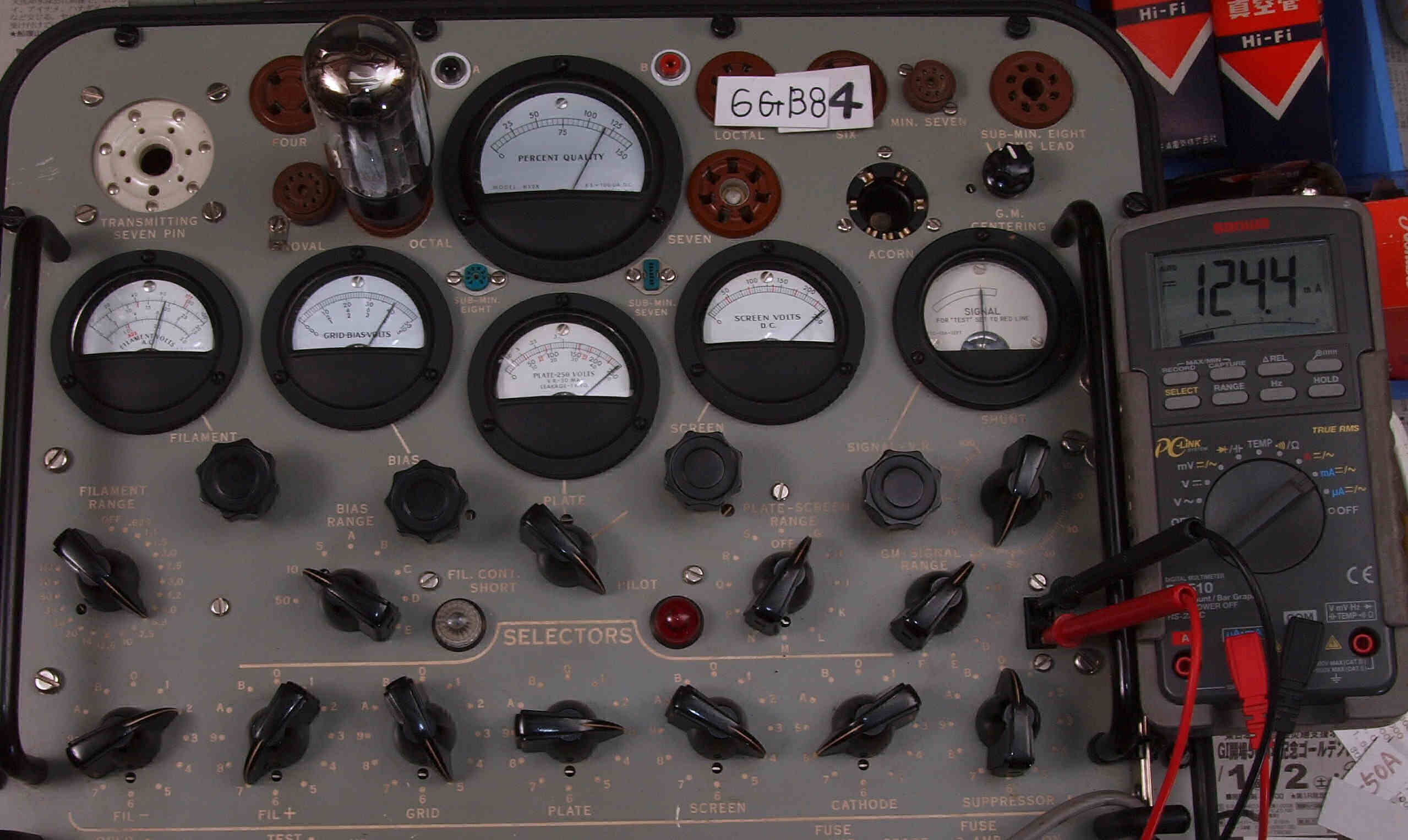 | J1. 1本目 6G-B8 測定。 Gm=24000μmho、Ip=111.8mA。RangeSW=A、FullScale=30000μmho。 測定条件、 「Ep=250V、Esg=250V、Eg1=−8V」 |