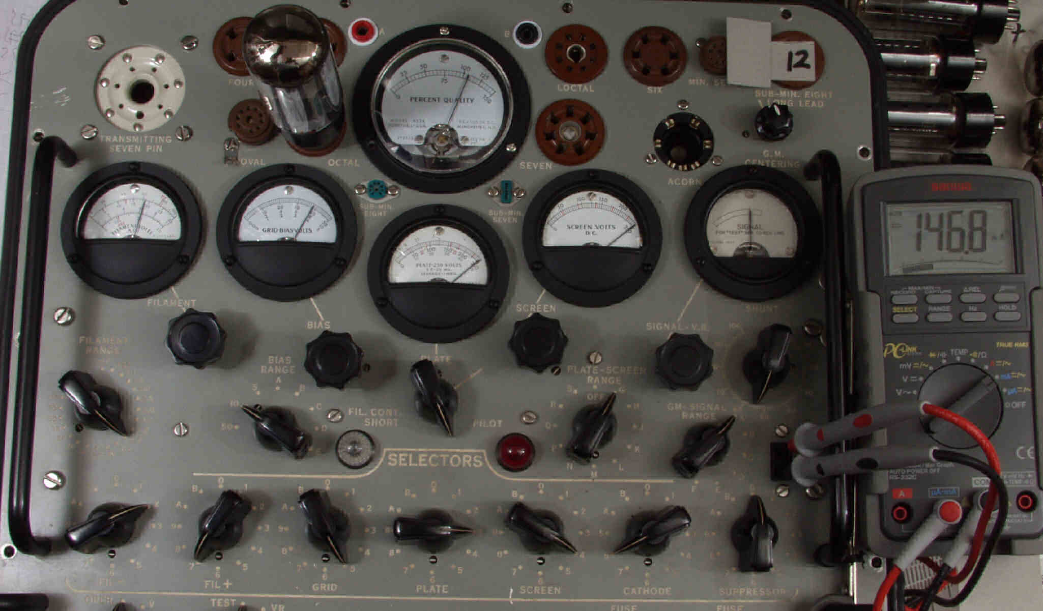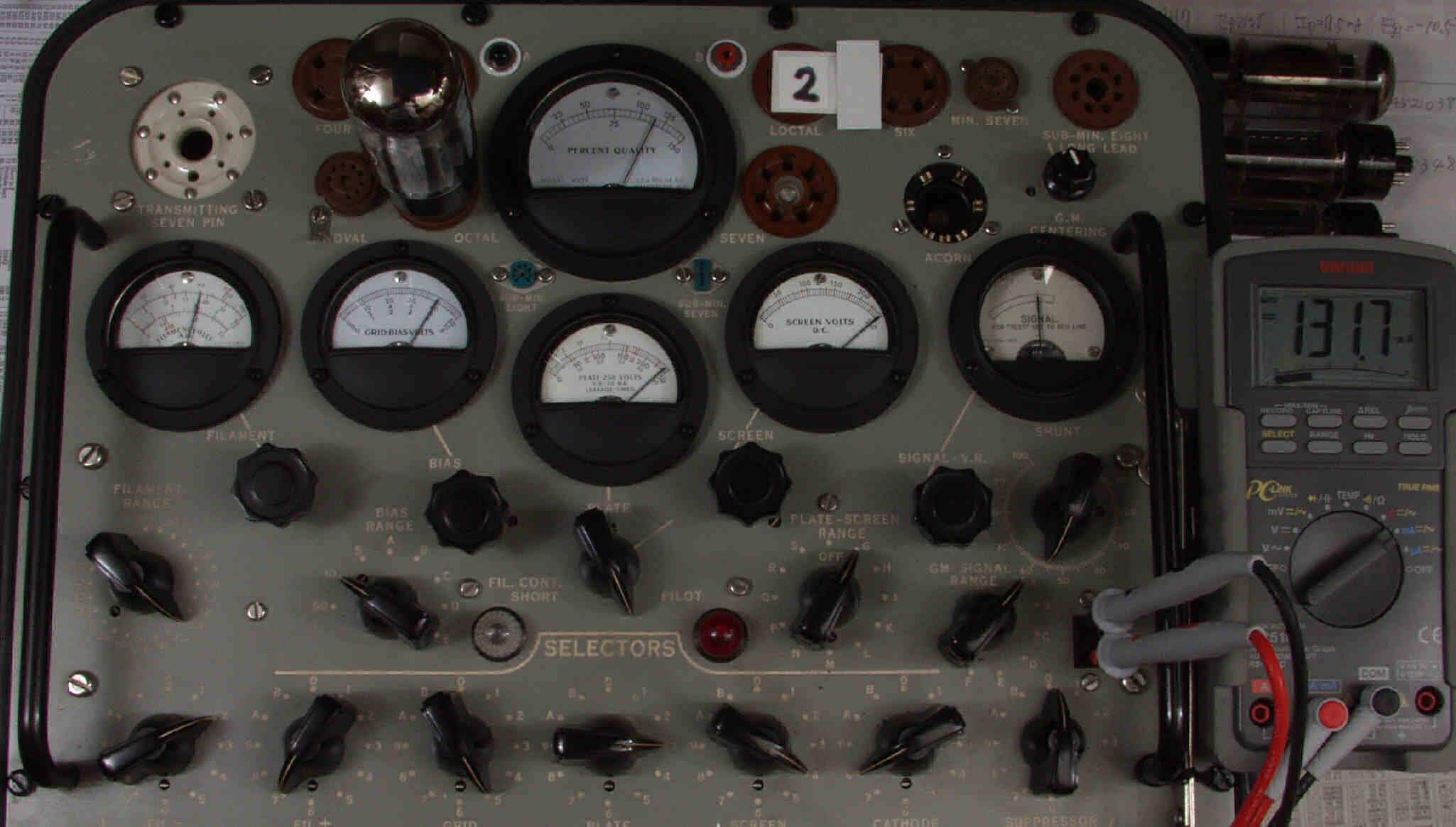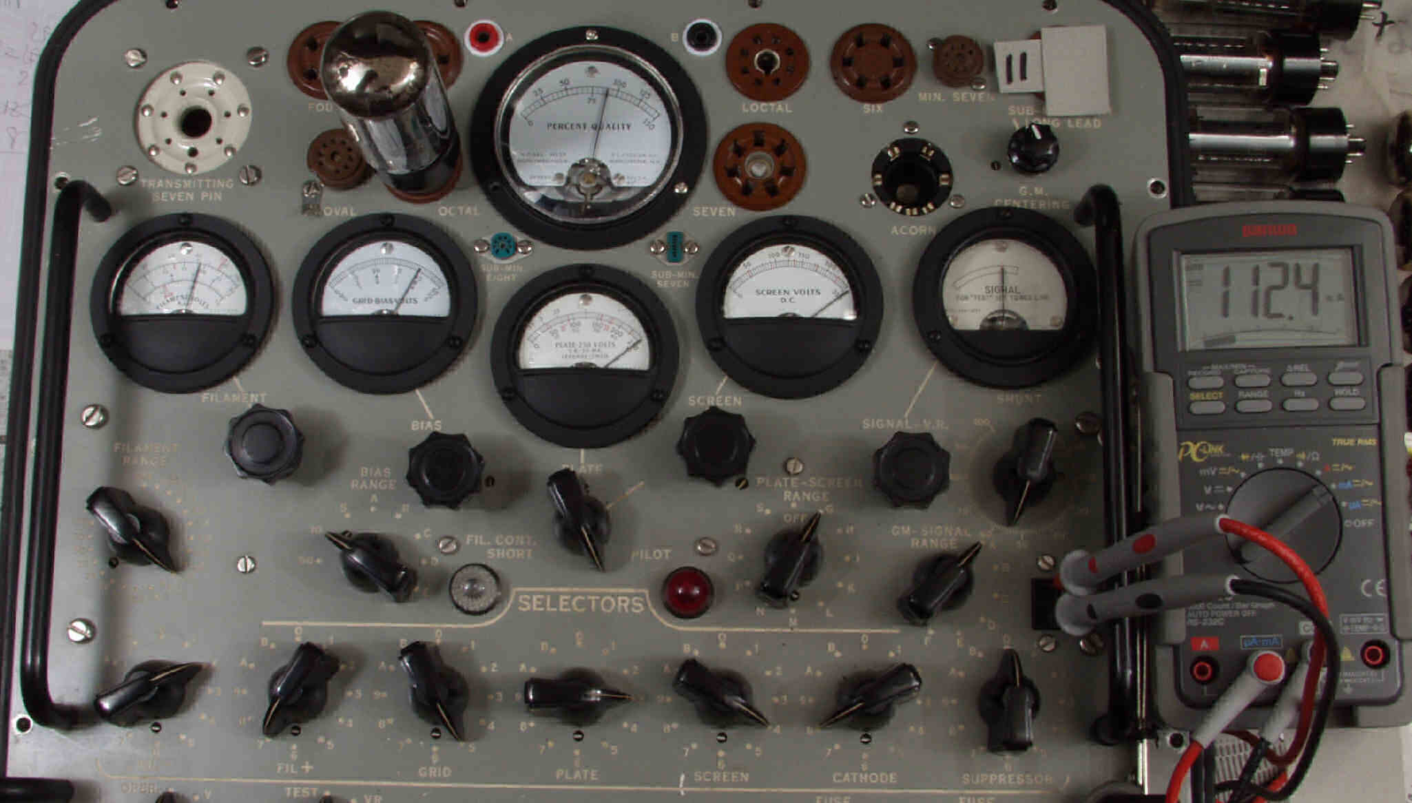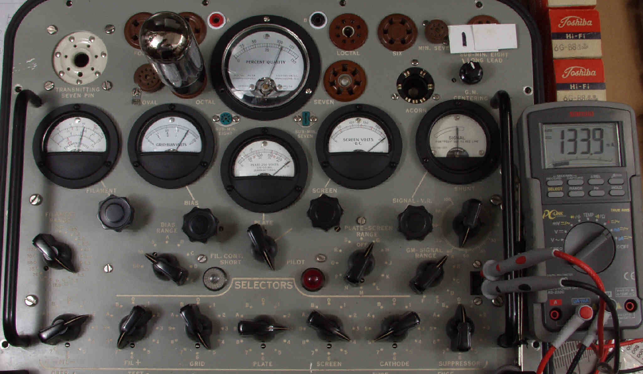 | J1. 1本目 6G-B8 測定。 Gm=24000μmho、Ip=111.8mA。RangeSW=A、FullScale=30000μmho。 測定条件、 「Ep=250V、Esg=250V、Eg1=−8V」 |