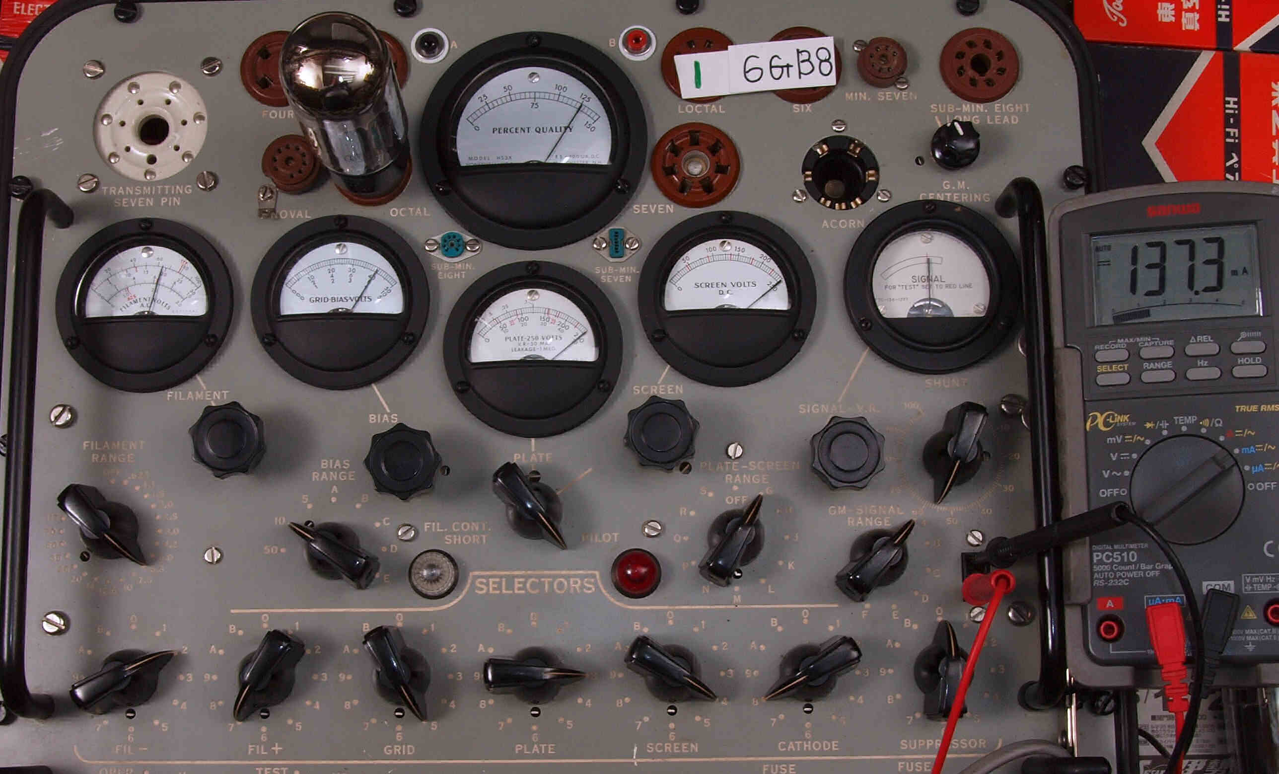 | G1. 1本目 6G-B8 測定。 Gm=25000μmho、Ip=137.3mA。RangeSW=A、FullScale=30000μmho。 測定条件、 「Ep=250V、Esg=250V、Eg1=−8V」 |