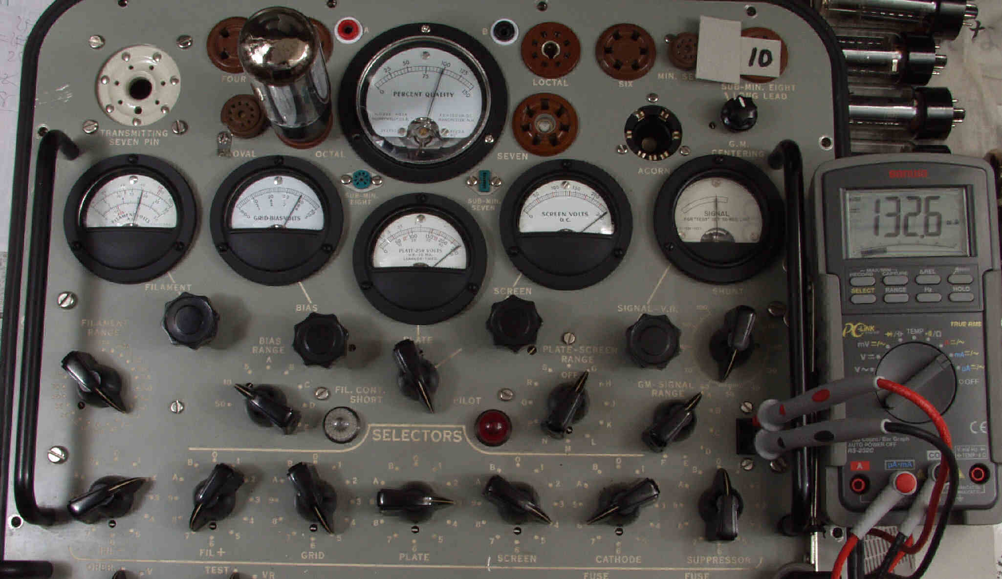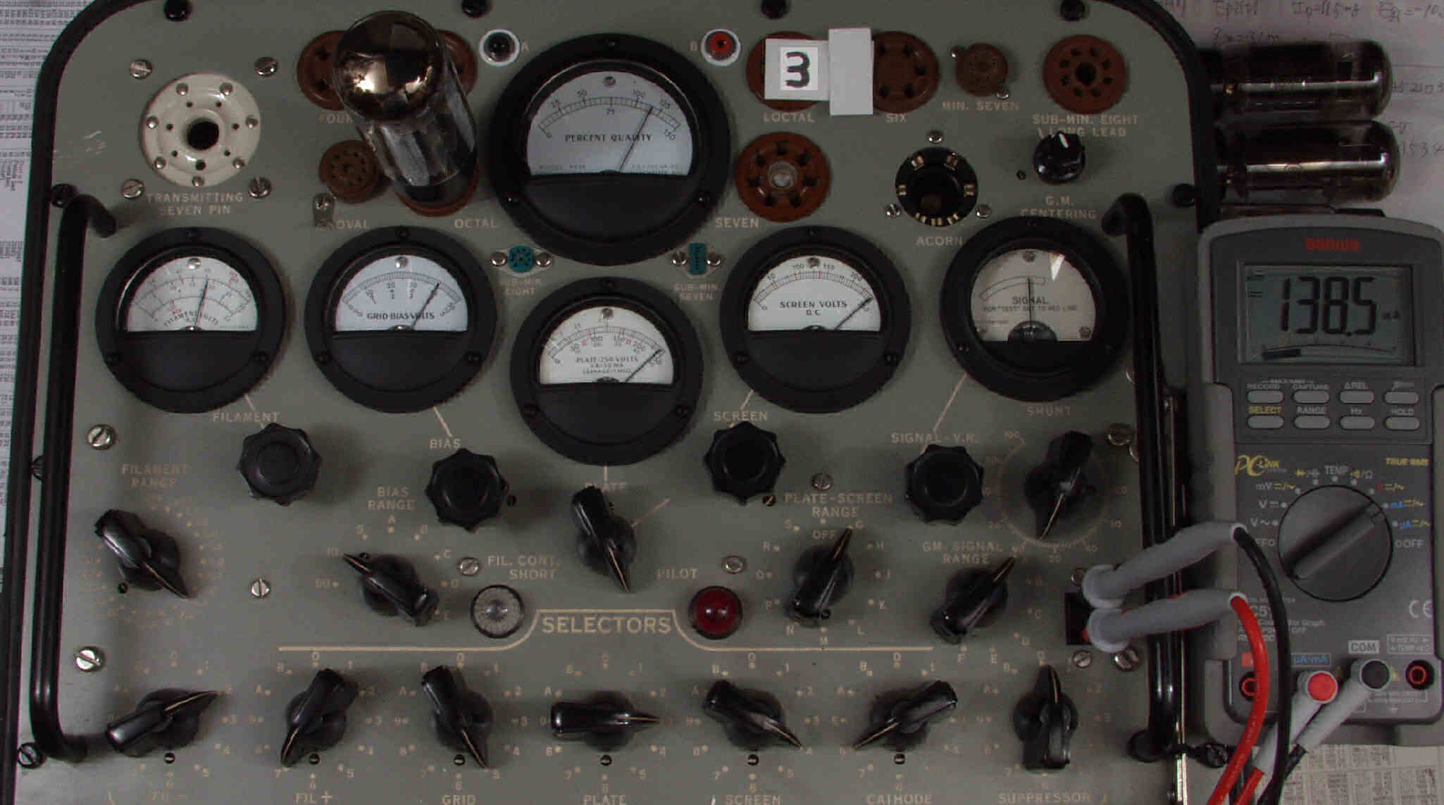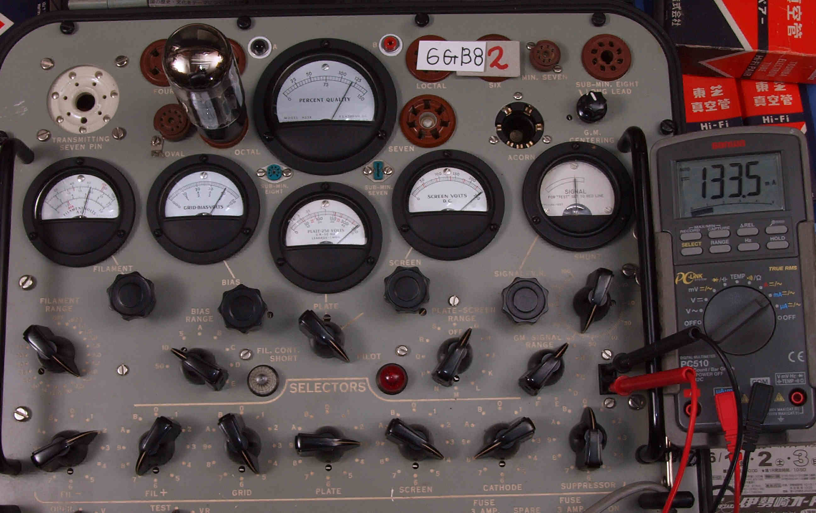 | L1. 1本目 6G-B8 測定。 Gm=21000μmho、Ip=135.2mA。RangeSW=A、FullScale=30000μmho。 測定条件、 「Ep=250V、Esg=250V、Eg1=−8V」 |