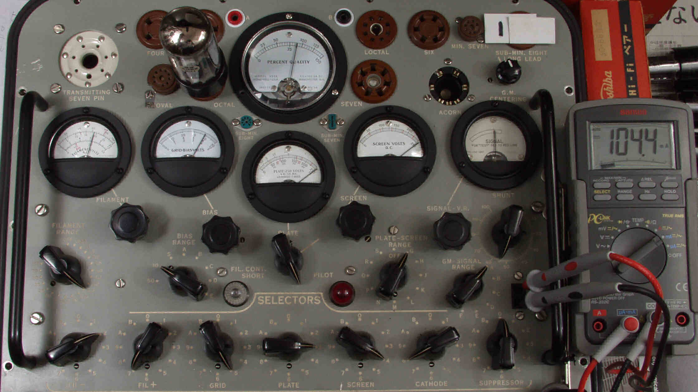 | A1. 1本目 6G-B8 測定。 Gm=18000μmho、Ip=104.4mA。RangeSW=A、FullScale=30000μmho。 測定条件、 「Ep=250V、Esg=250V、Eg1=−8V」 |