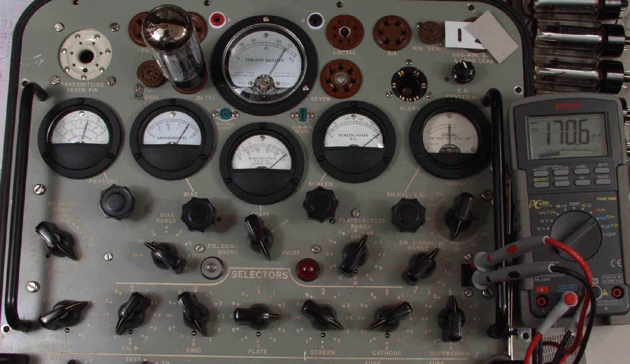 | M1. 1本目 6G-B8 測定。 Gm=24000μmho、Ip=170.6mA。RangeSW=A、FullScale=30000μmho。 測定条件、 「Ep=250V、Esg=250V、Eg1=−8V」 |