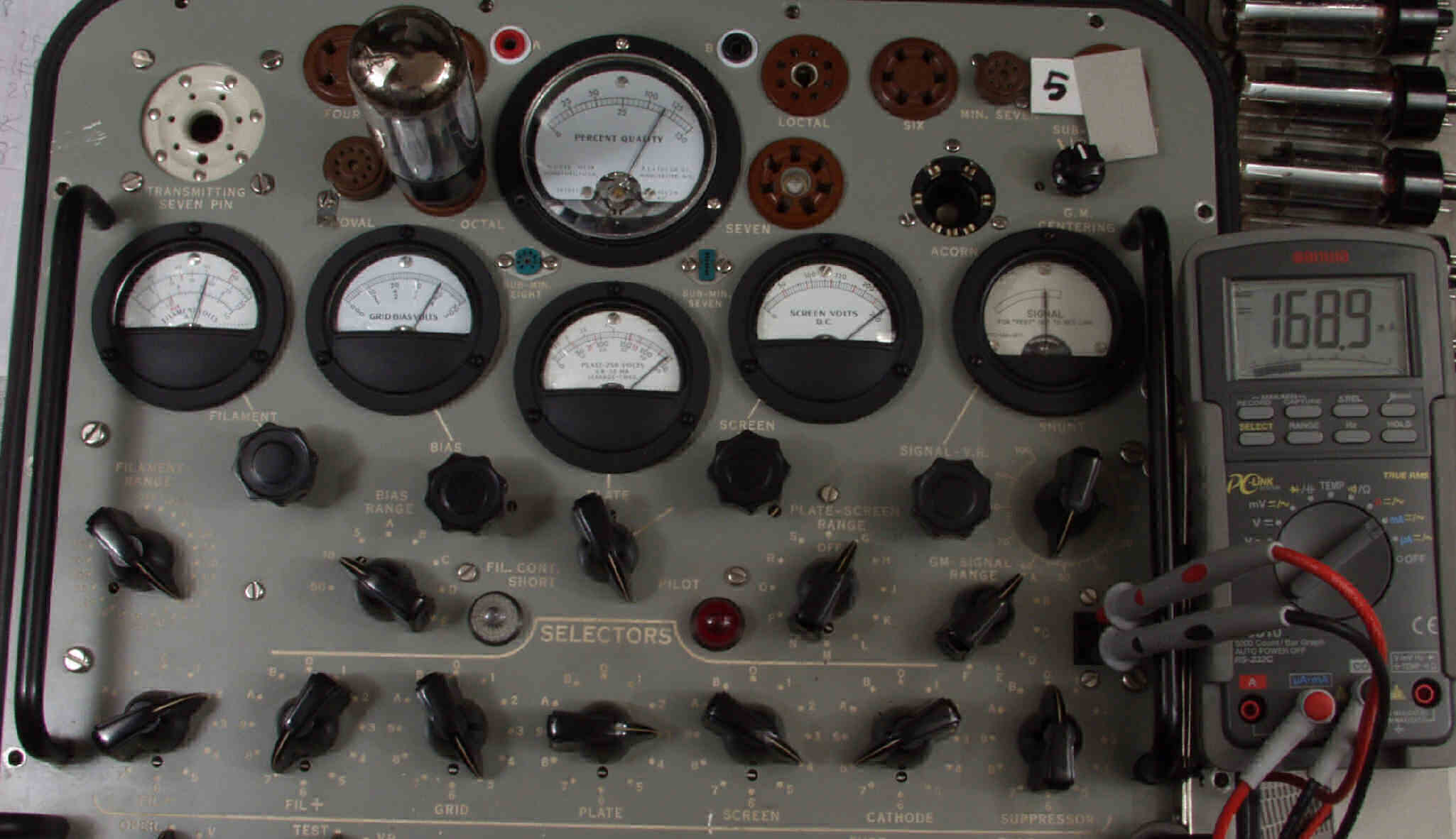 | M5. 5本目 6G-B8 測定。 Gm=23000μmho、Ip=168.9mA。RangeSW=A、FullScale=30000μmho。 測定条件、 「Ep=250V、Esg=250V、Eg1=−8V」 |