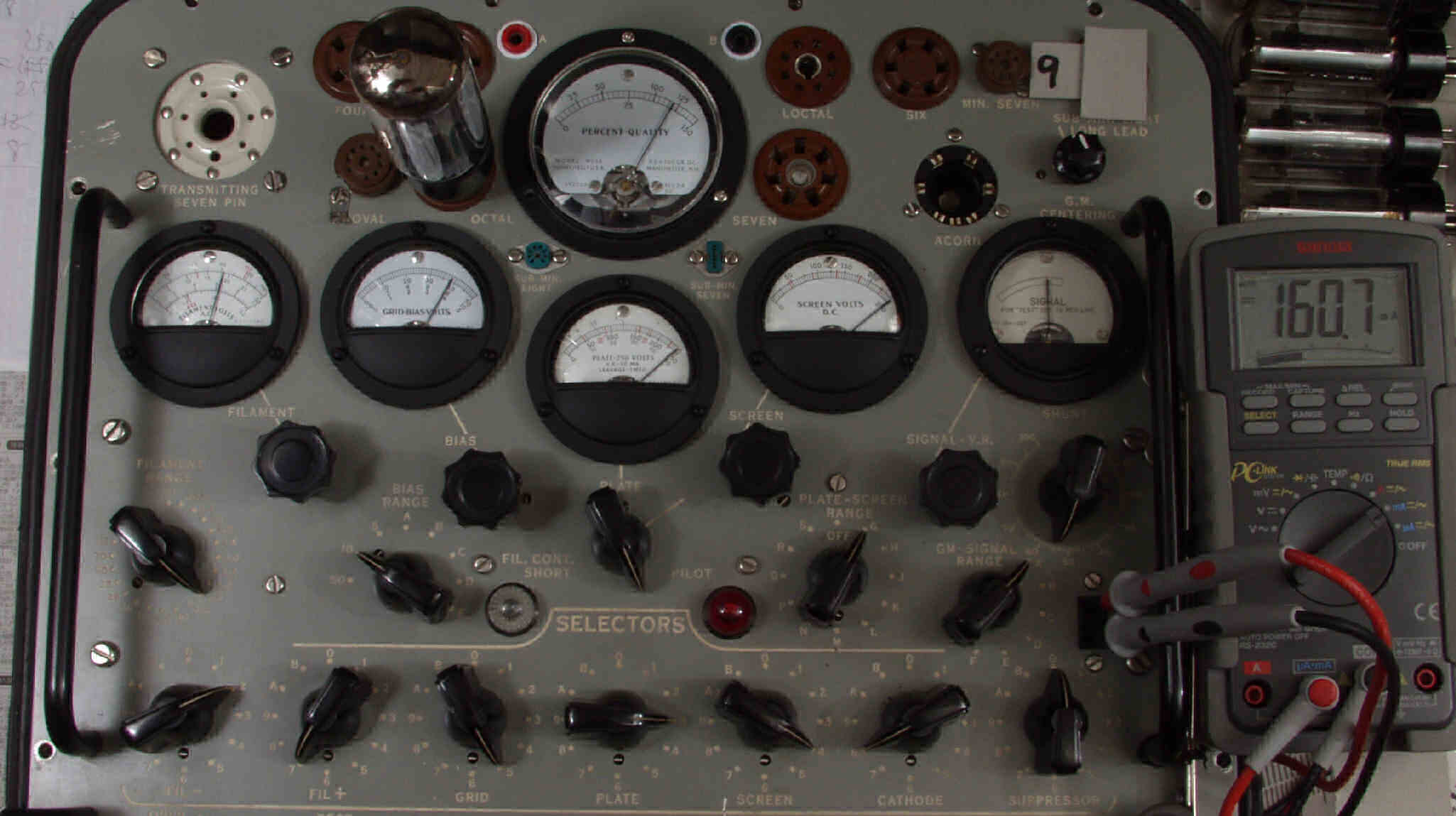 | M9. 9本目 6G-B8 測定。 Gm=24000μmho、Ip=160.7mA。RangeSW=A、FullScale=30000μmho。 測定条件、 「Ep=250V、Esg=250V、Eg1=−8V」 |