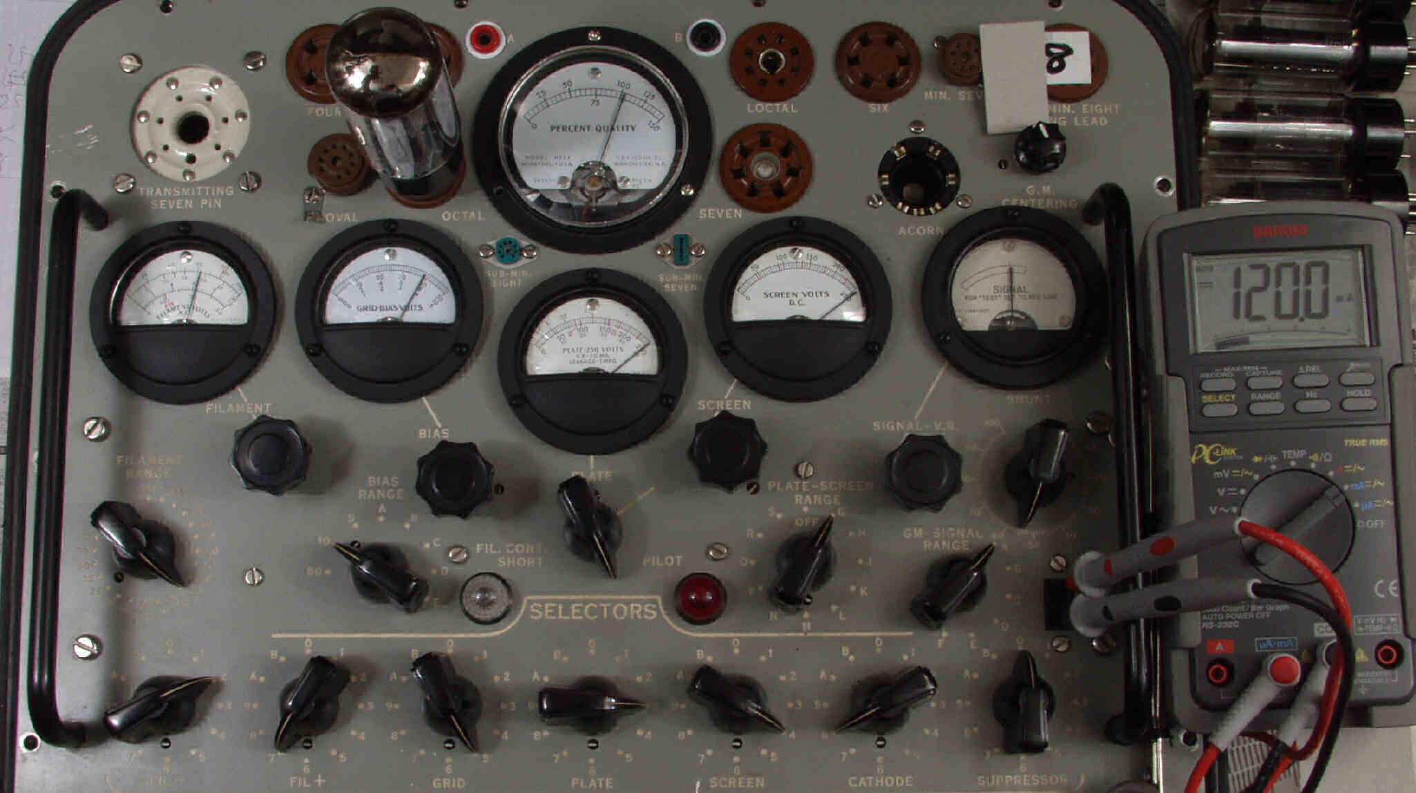 | E1. 1本目 6G-B8 測定。 Gm=23000μmho、Ip=119.5mA。RangeSW=A、FullScale=30000μmho。 測定条件、 「Ep=250V、Esg=250V、Eg1=−8V」 |