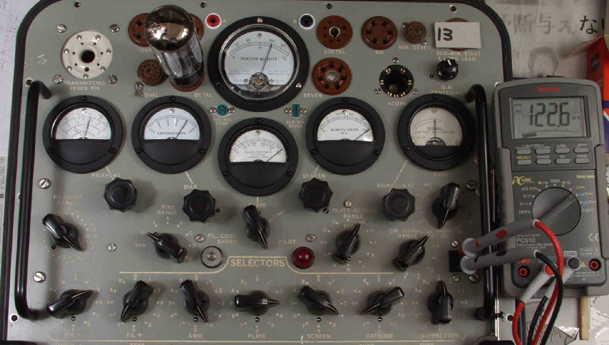 | M13. 13本目 6G-B8 測定。 Gm=20200μmho、Ip=122.6mA。RangeSW=A、FullScale=30000μmho。 測定条件、 「Ep=250V、Esg=250V、Eg1=−8V」 |