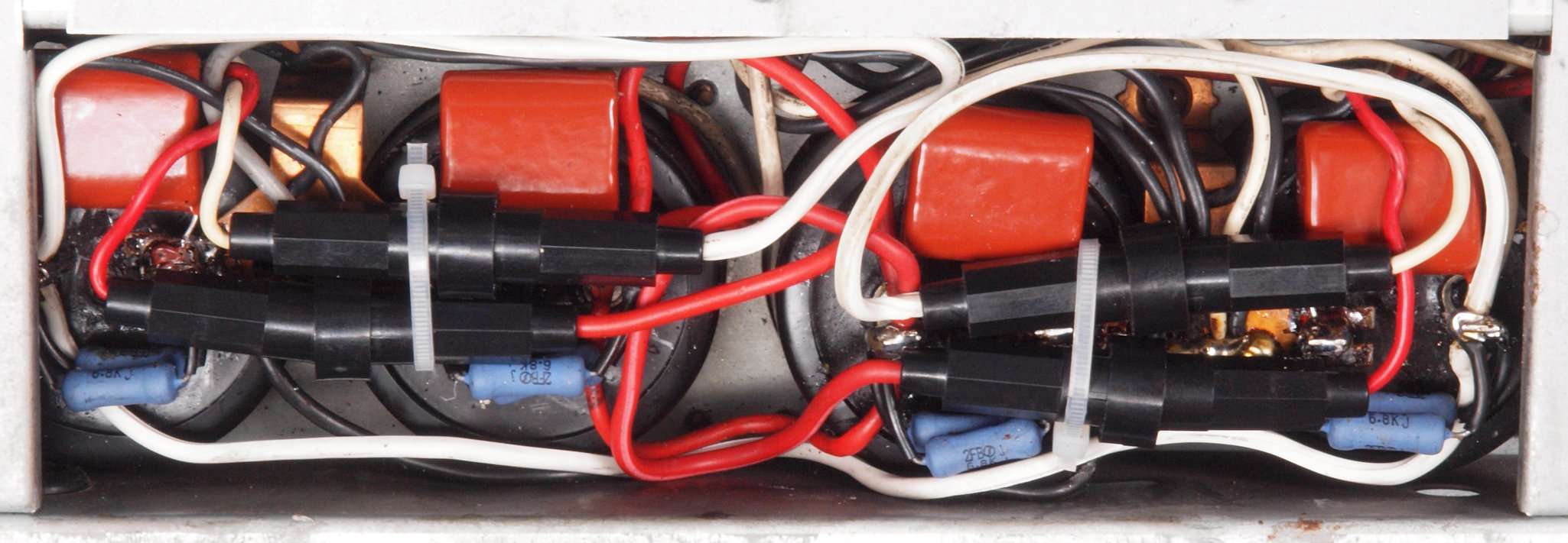 | 終段出力TR(トランジスター)にヒューズ挿入 終段出力FET(電界効果トランジスター)にヒューズ挿入 |