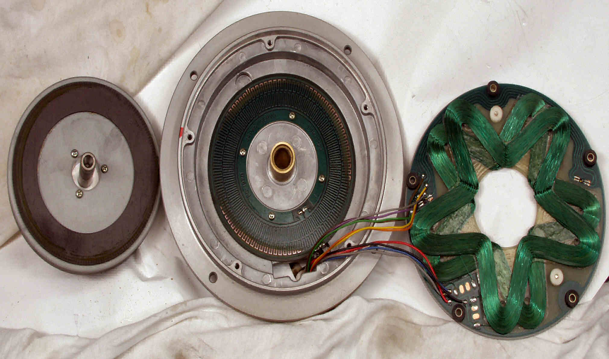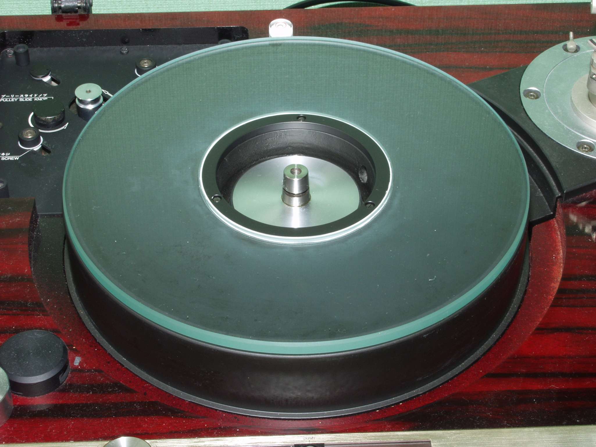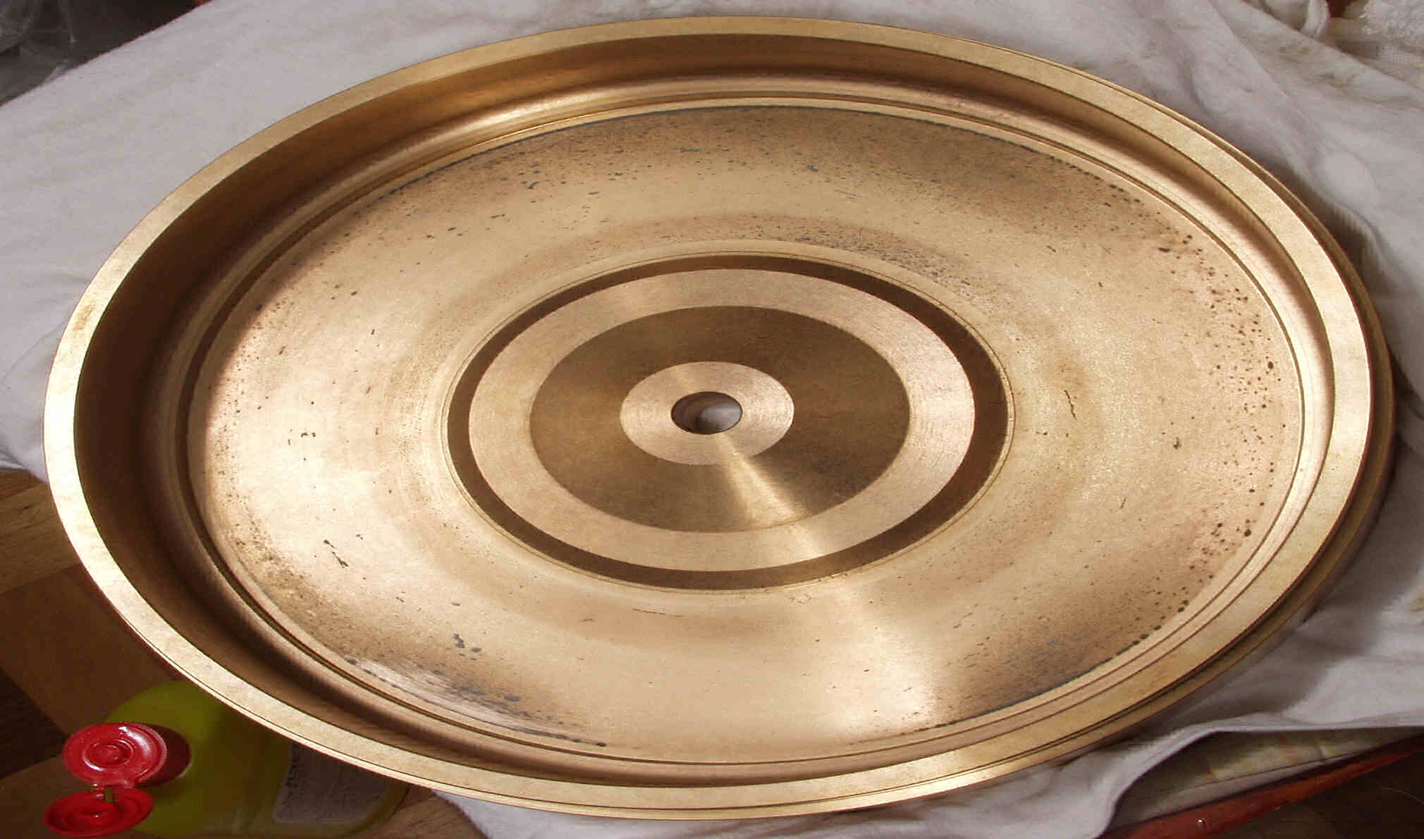 | 2.モーターは異音がしない場合。 タンテーブルが下のガラス面に接触した場合は「シャー シャー」と音がします。 外して見ると下記の様になっています、この様になると、ピーカール等の専用コンパウンドで磨くのにも、時間が掛かります。 |