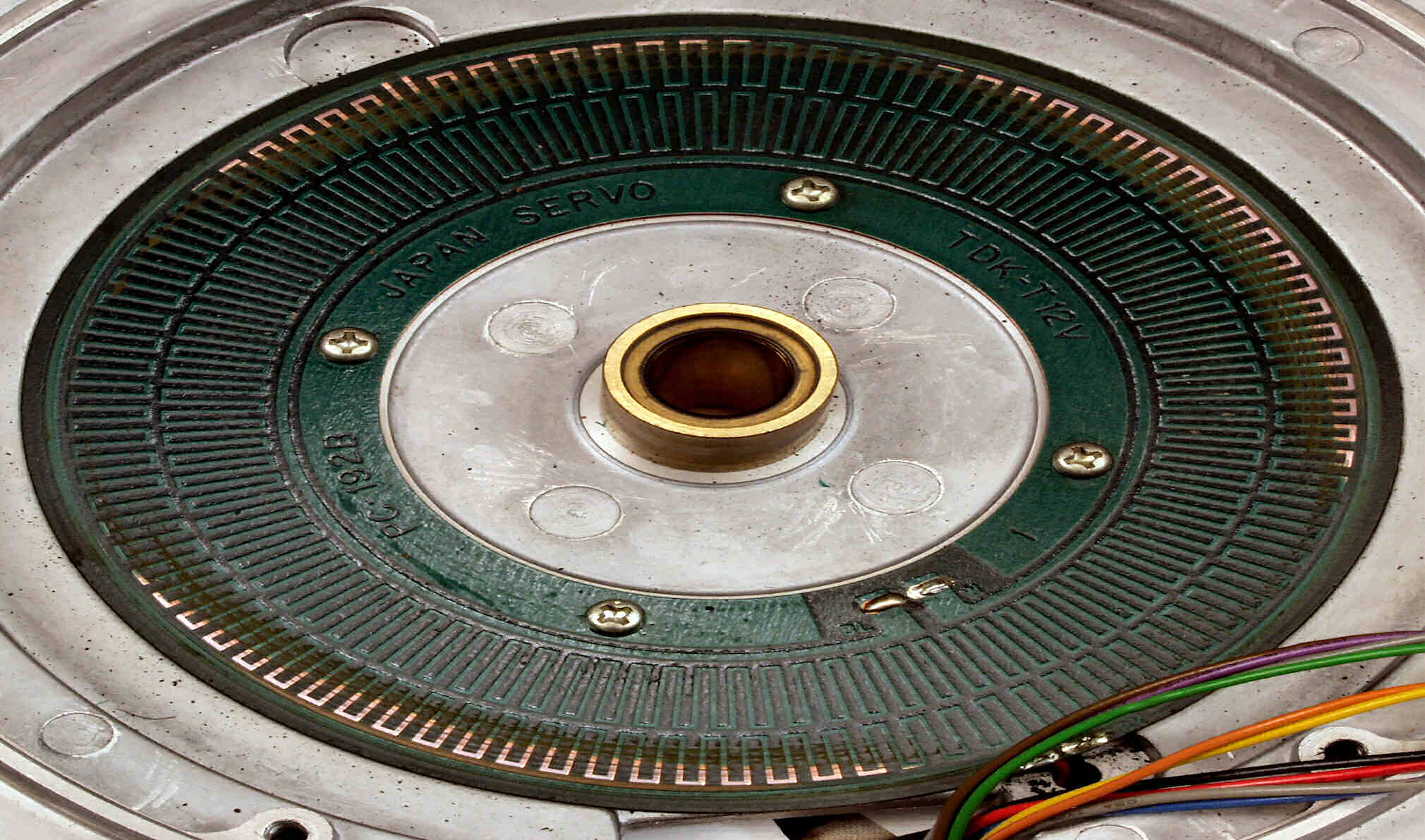 | 1A.下記の様に、大きな金属製のドライバーをタンテーブルの金属部分に「ドライバー等」を当て、音を聞いてください 1B.次にターンテーブルへのベルトを外して、モーターのみ回転させ、同じ様に音を聞いてください。 写真では「ストロボ撮影」の為、ターンテーブルの回転が止ま見えます。 |