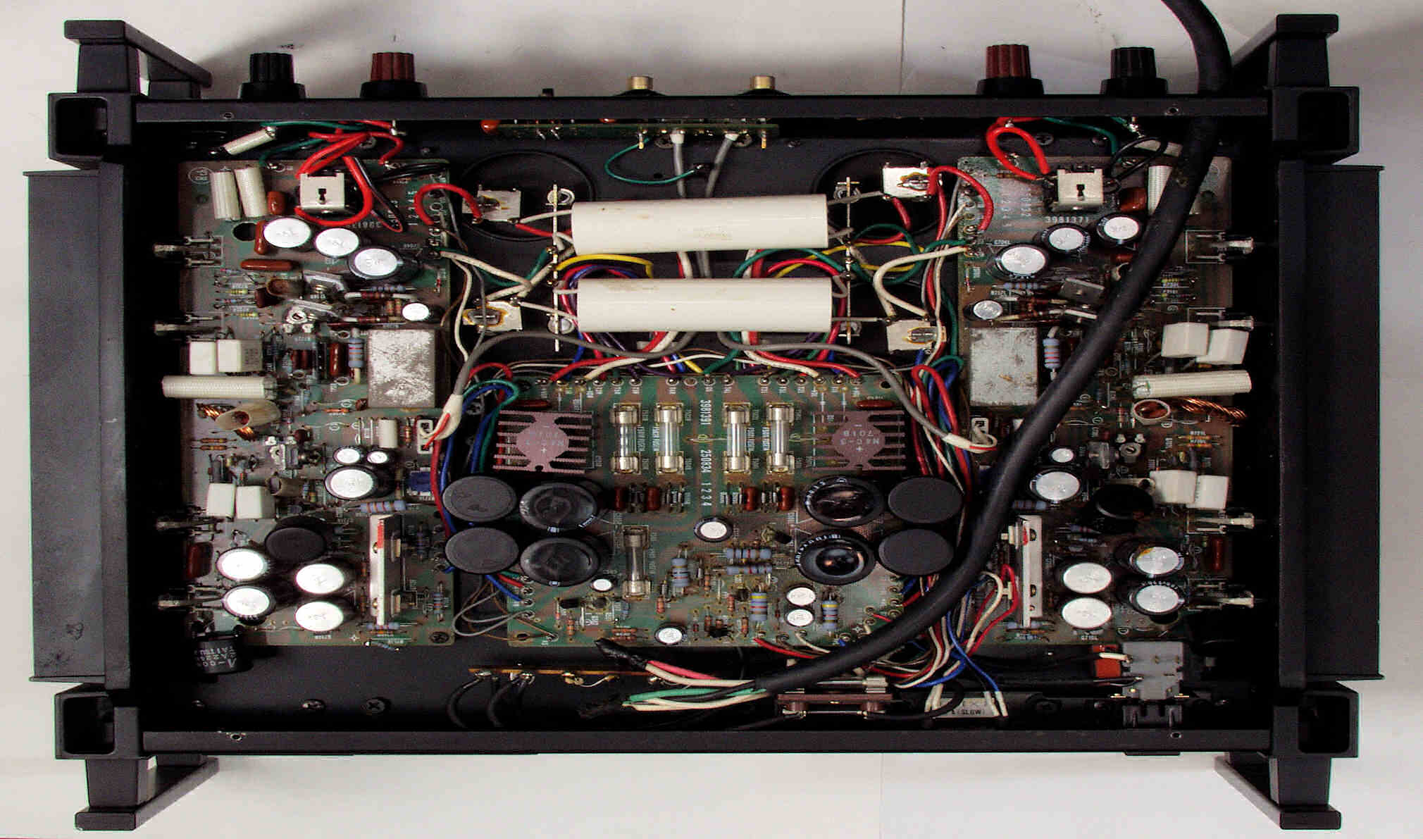 | 34. 電源SWの改良例 遅延リレー組み込み 電源部にリレーを2個新設=真ん中下に見える物 トロイダル・トランスを使用しているので、「2段階(steps)」に電源を投入する 上右=新設した制御用電源部 右端=ラッシュ・カーレント(突入電流)防止用セメント抵抗 |