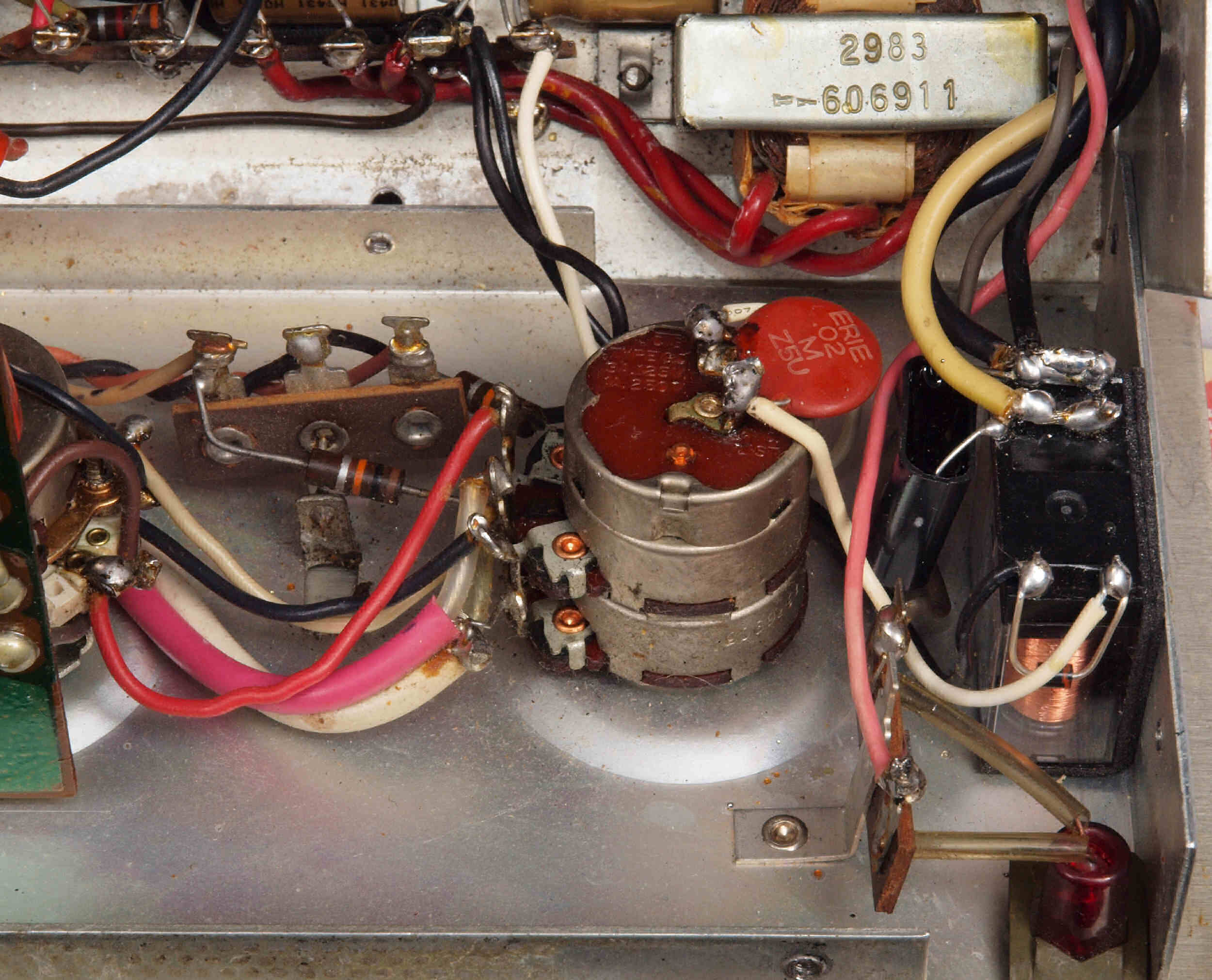 D1.前段の真空管ソケット。回りの基板にも接点復活材跡。         修理の様子はこちら