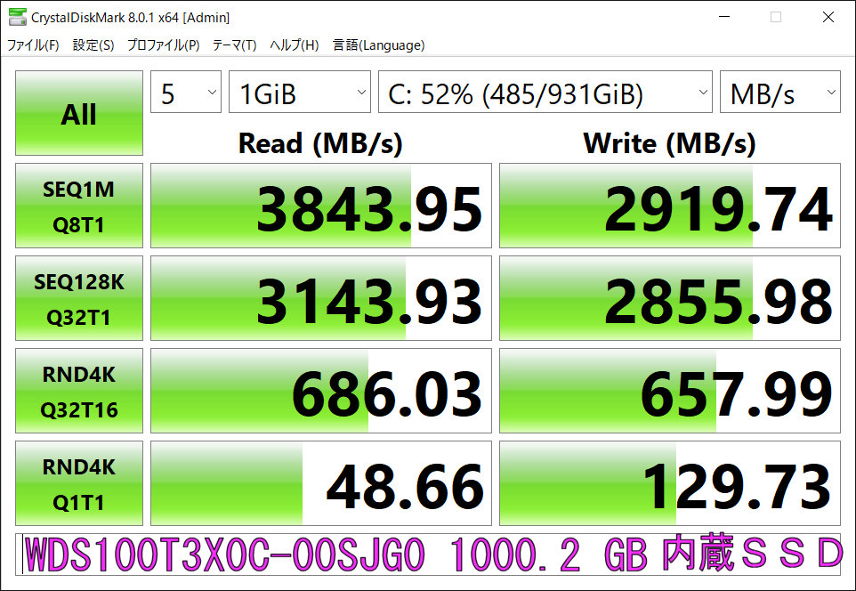 C52. WD Black SN750 NVMe WDS100T3X0C 測定。