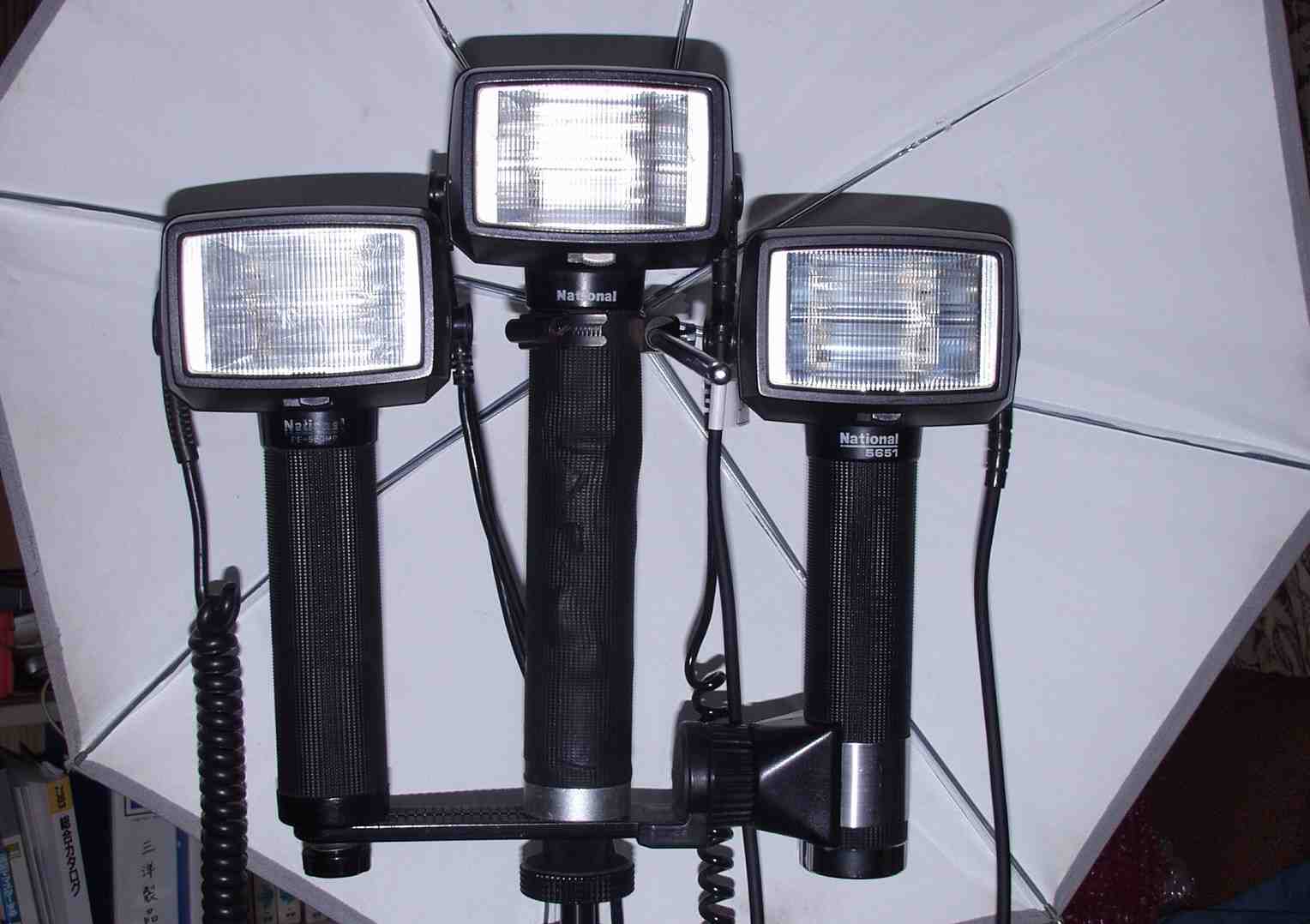 23. 撮影用ストロボ3。 National PE−5651+PE−560MG+PE−400 実際の傘は反対に取り付ける