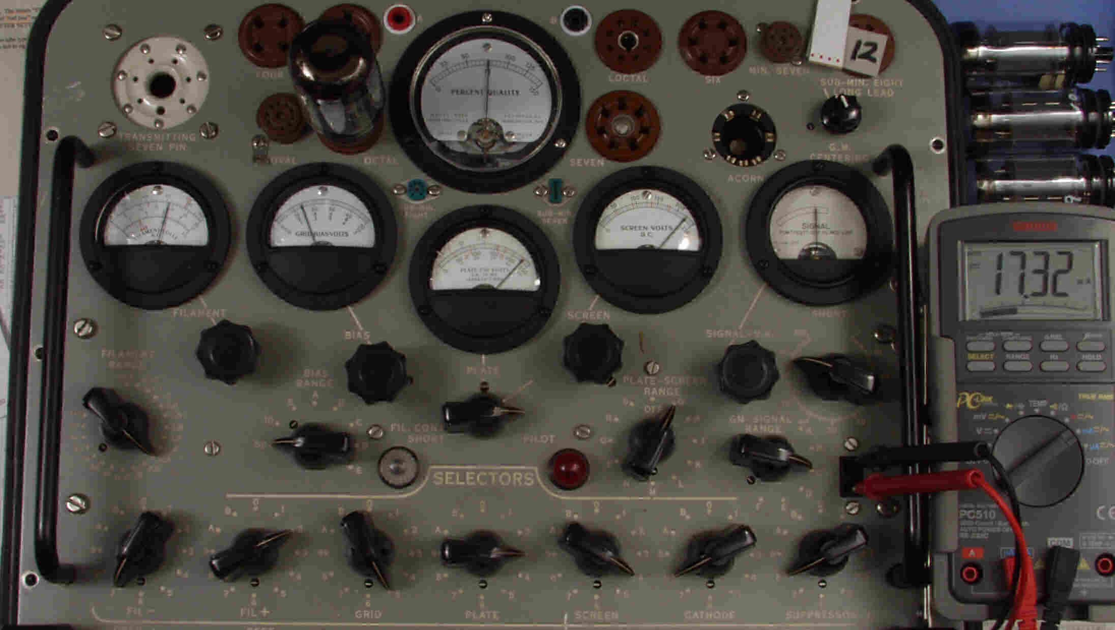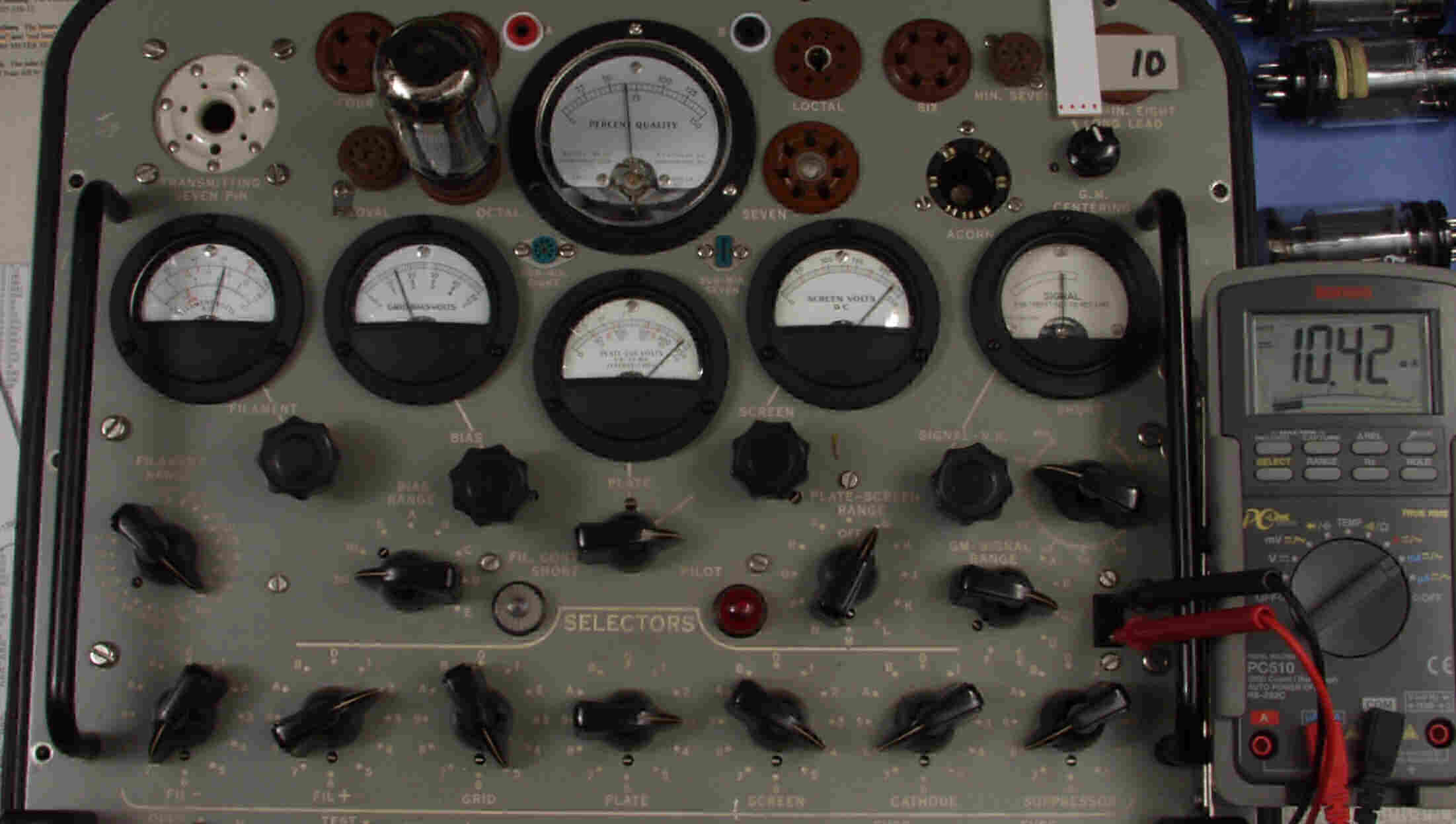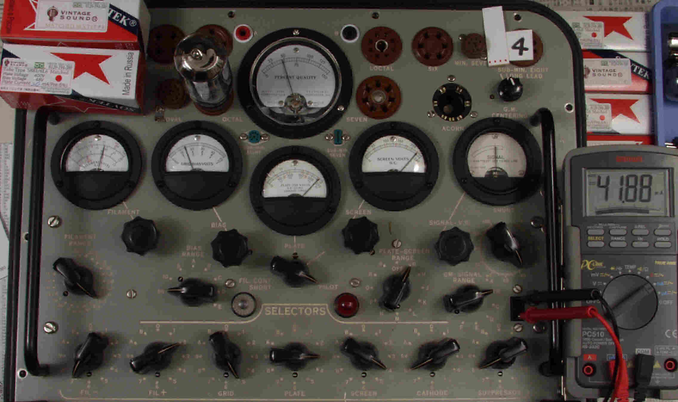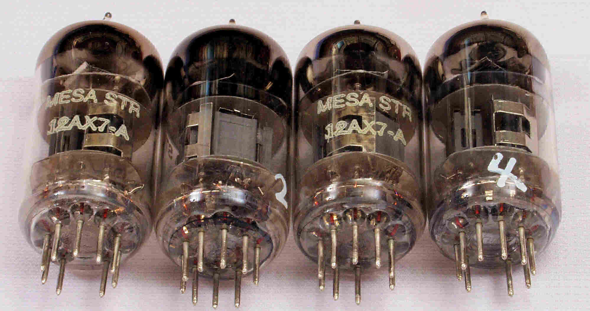 | CA10. 付属。 MESA STR 12AX7−A。 真空管ハンドブック(規格表)の値。 Dレンジ=1500μmhoレンジでの測定、「Ep=225V、Eg1=−2V」。 相互コンダクタンス=1600μmho「Ep=250V、Eg1=−2V」(1960/1962ナショナル真空管ハンドブックより)、(インプレス オーディオ用真空管マニアルより)、(RC−26、RC−30 Receiving Tube Manualより) MESA STR 12AX7−A。 左から1本目..4本目。 |