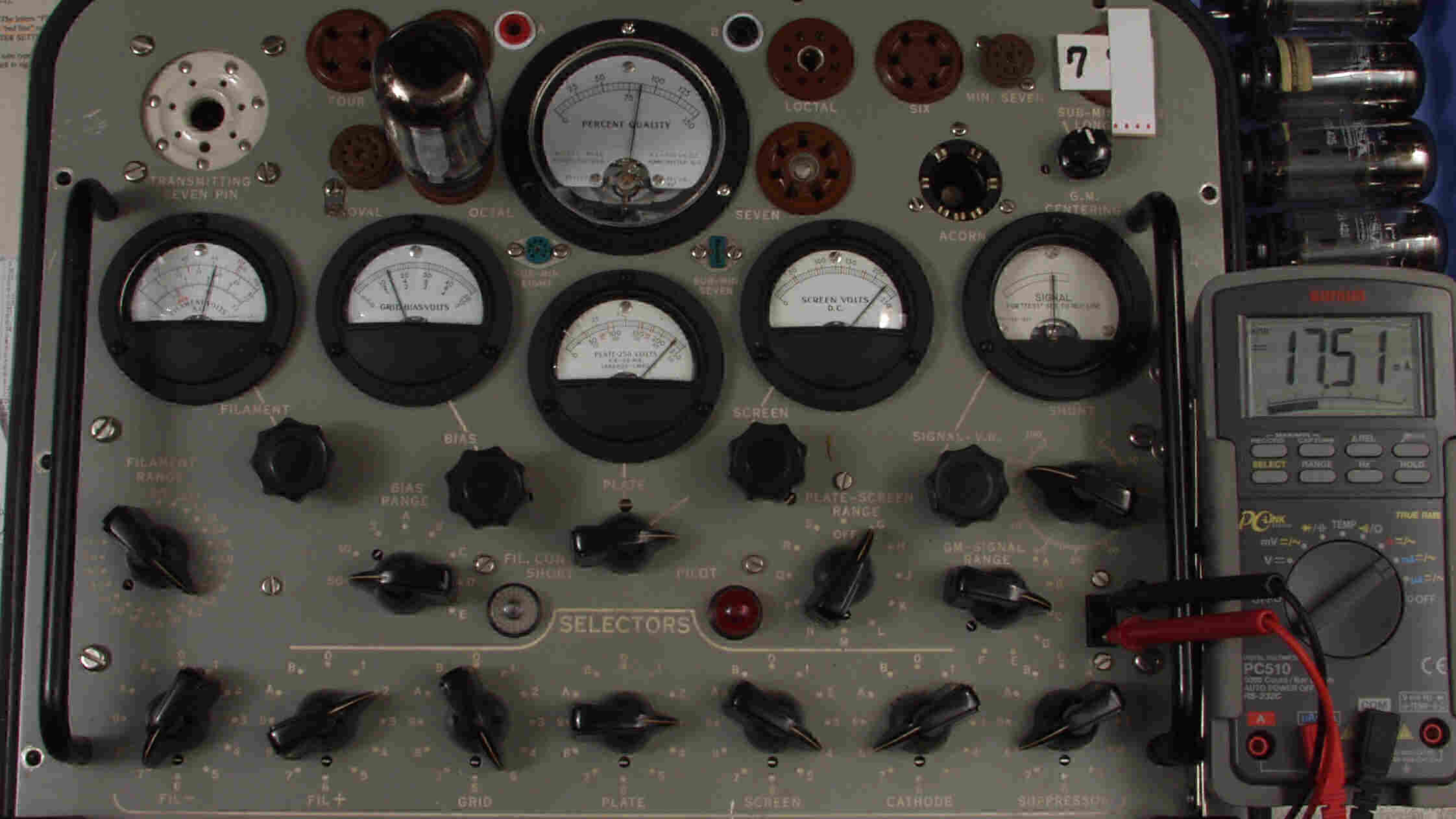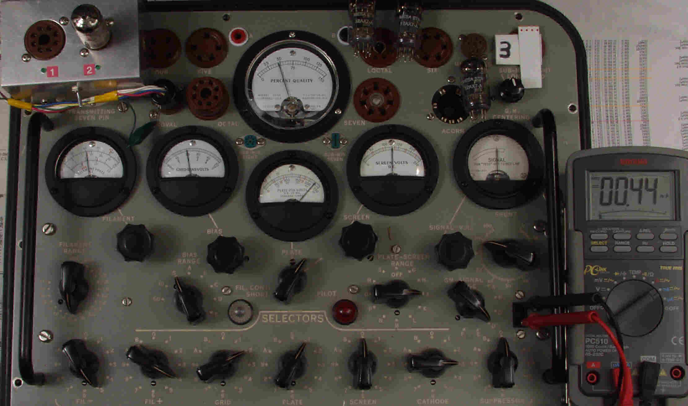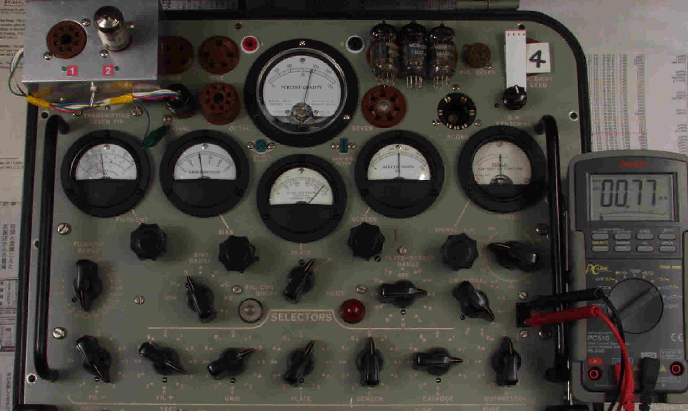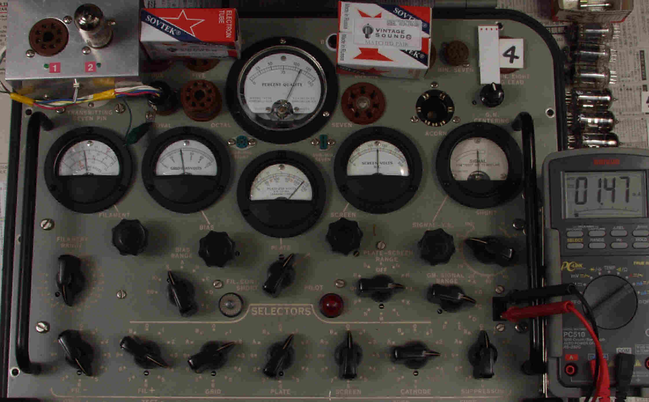 | CA10. 付属。 MESA STR 12AX7−A。 真空管ハンドブック(規格表)の値。 Dレンジ=1500μmhoレンジでの測定、「Ep=225V、Eg1=−2V」。 相互コンダクタンス=1600μmho「Ep=250V、Eg1=−2V」(1960/1962ナショナル真空管ハンドブックより)、(インプレス オーディオ用真空管マニアルより)、(RC−26、RC−30 Receiving Tube Manualより) MESA STR 12AX7−A。 左から1本目..4本目。 |