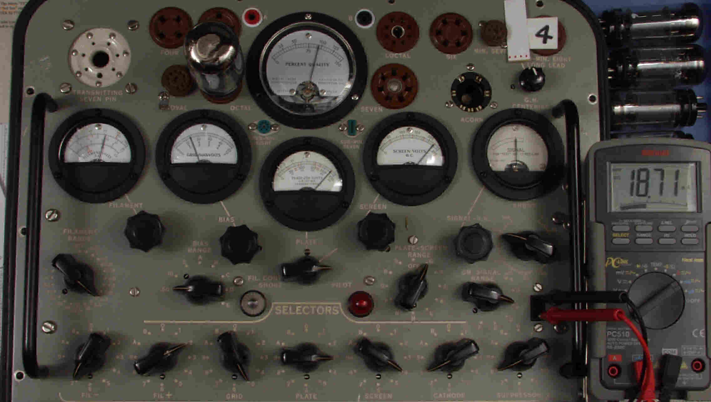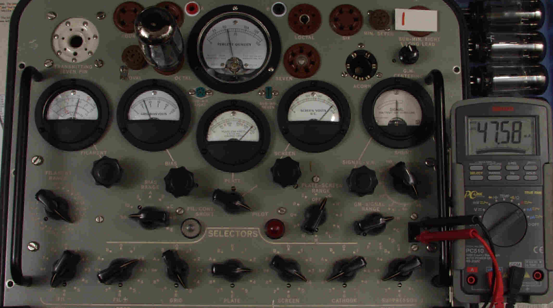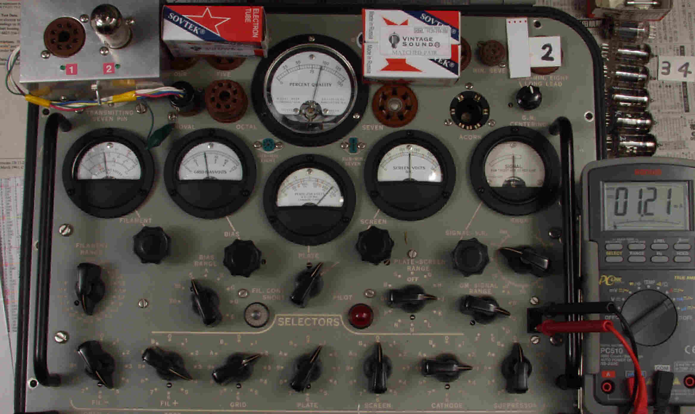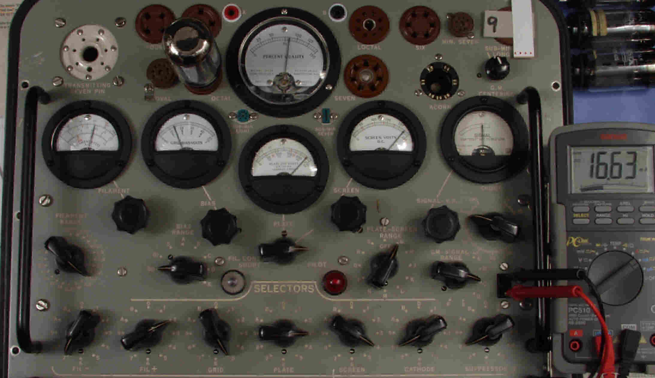 | CA10. 付属。 MESA STR 12AX7−A。 真空管ハンドブック(規格表)の値。 Dレンジ=1500μmhoレンジでの測定、「Ep=225V、Eg1=−2V」。 相互コンダクタンス=1600μmho「Ep=250V、Eg1=−2V」(1960/1962ナショナル真空管ハンドブックより)、(インプレス オーディオ用真空管マニアルより)、(RC−26、RC−30 Receiving Tube Manualより) MESA STR 12AX7−A。 左から1本目..4本目。 |