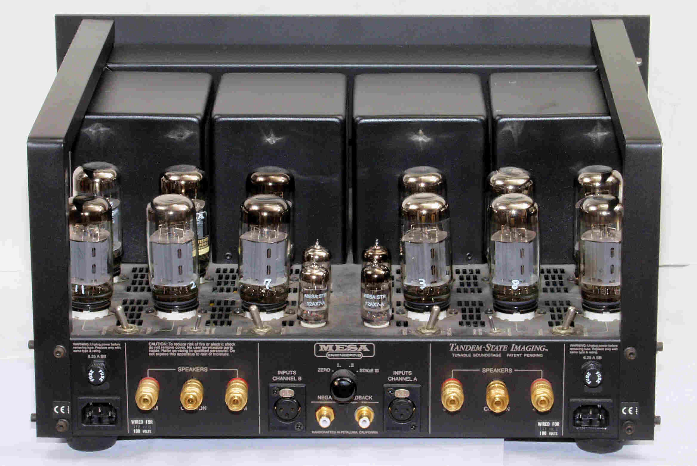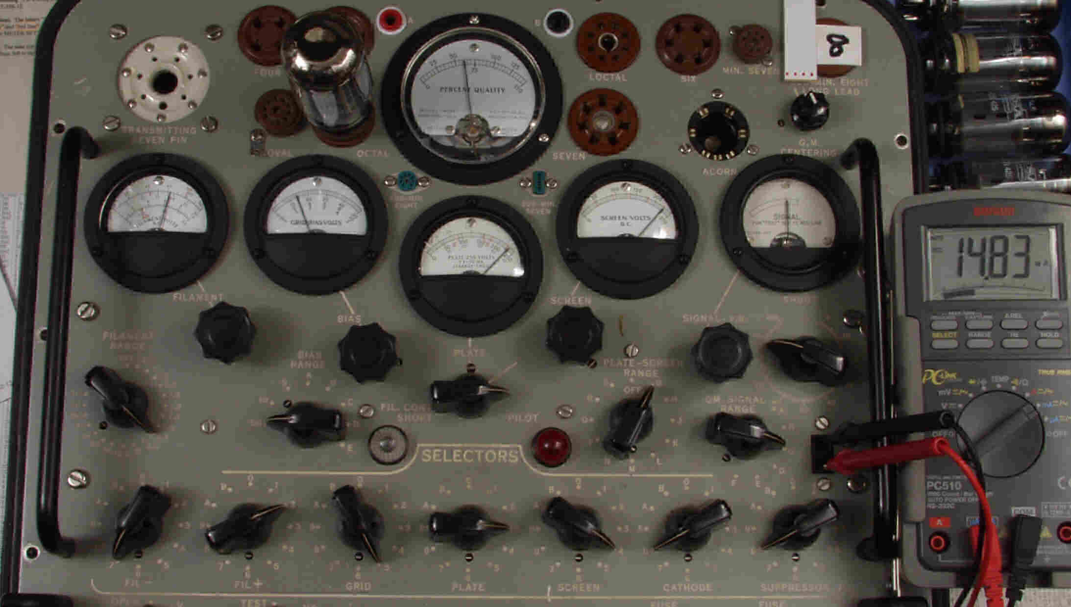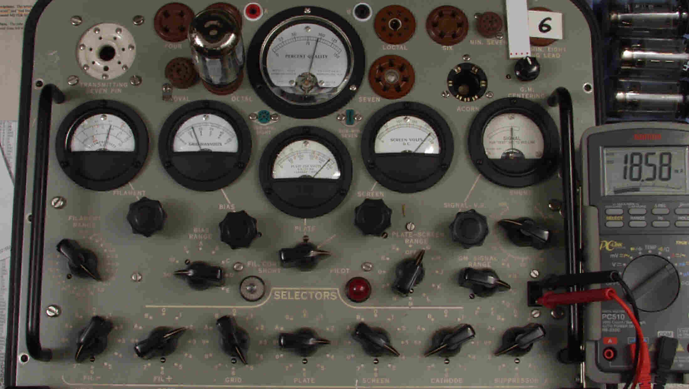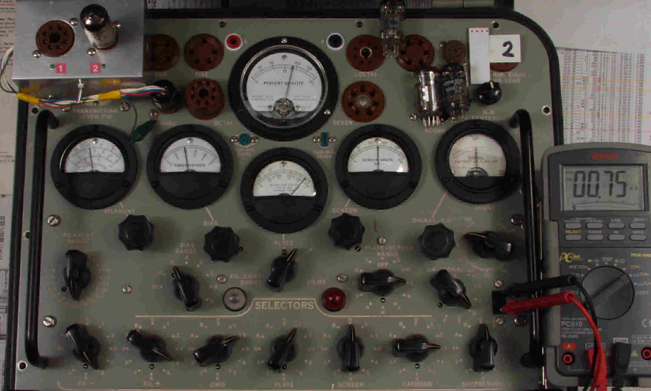 | CA10. 付属。 MESA STR 12AX7−A。 真空管ハンドブック(規格表)の値。 Dレンジ=1500μmhoレンジでの測定、「Ep=225V、Eg1=−2V」。 相互コンダクタンス=1600μmho「Ep=250V、Eg1=−2V」(1960/1962ナショナル真空管ハンドブックより)、(インプレス オーディオ用真空管マニアルより)、(RC−26、RC−30 Receiving Tube Manualより) MESA STR 12AX7−A。 左から1本目..4本目。 |