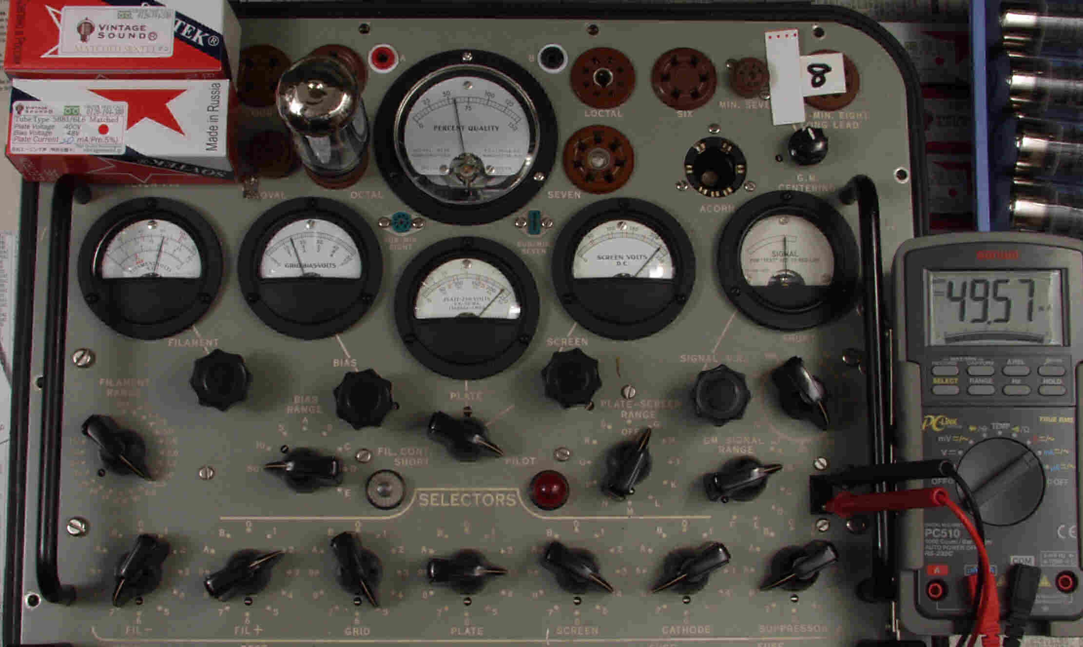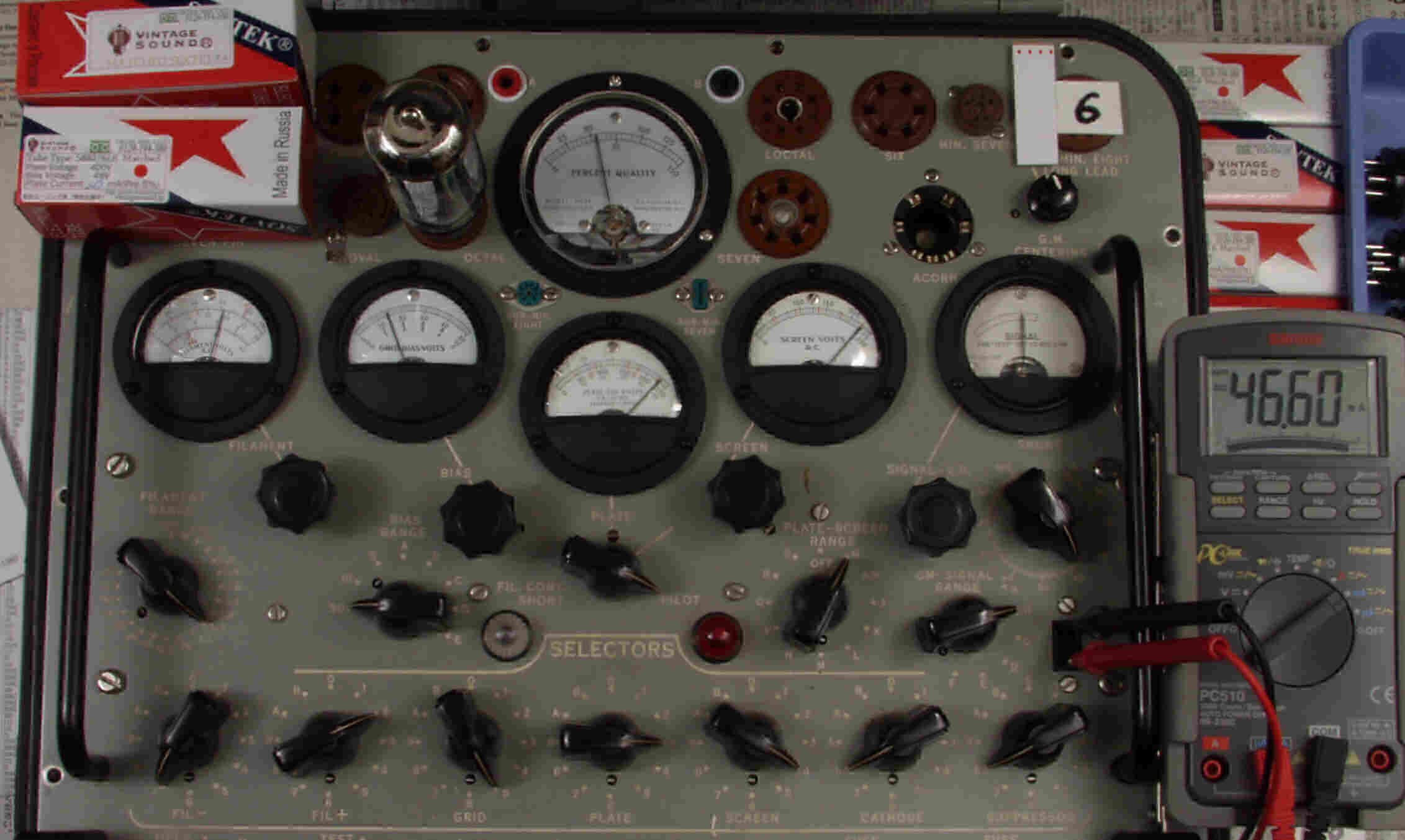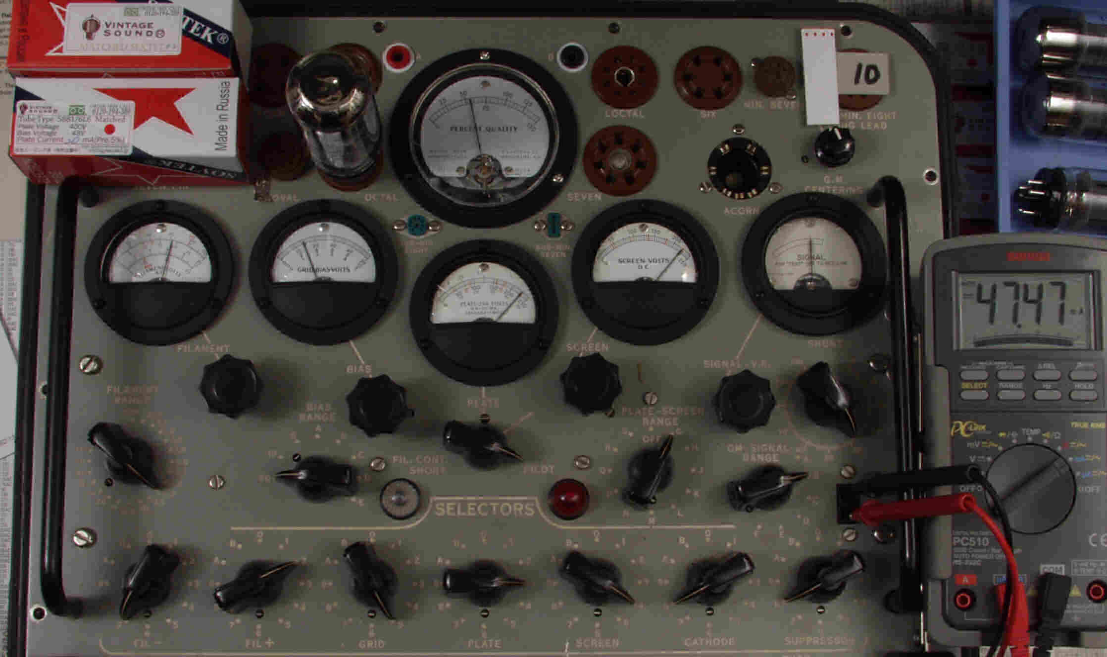 | CB57. SOVTEC 「5881=6L6WGC」7本目。 Gm=5500μ、Ip=47.7mA。 「Ep=230V、Eg2=225V、Eg1=−14V」 |