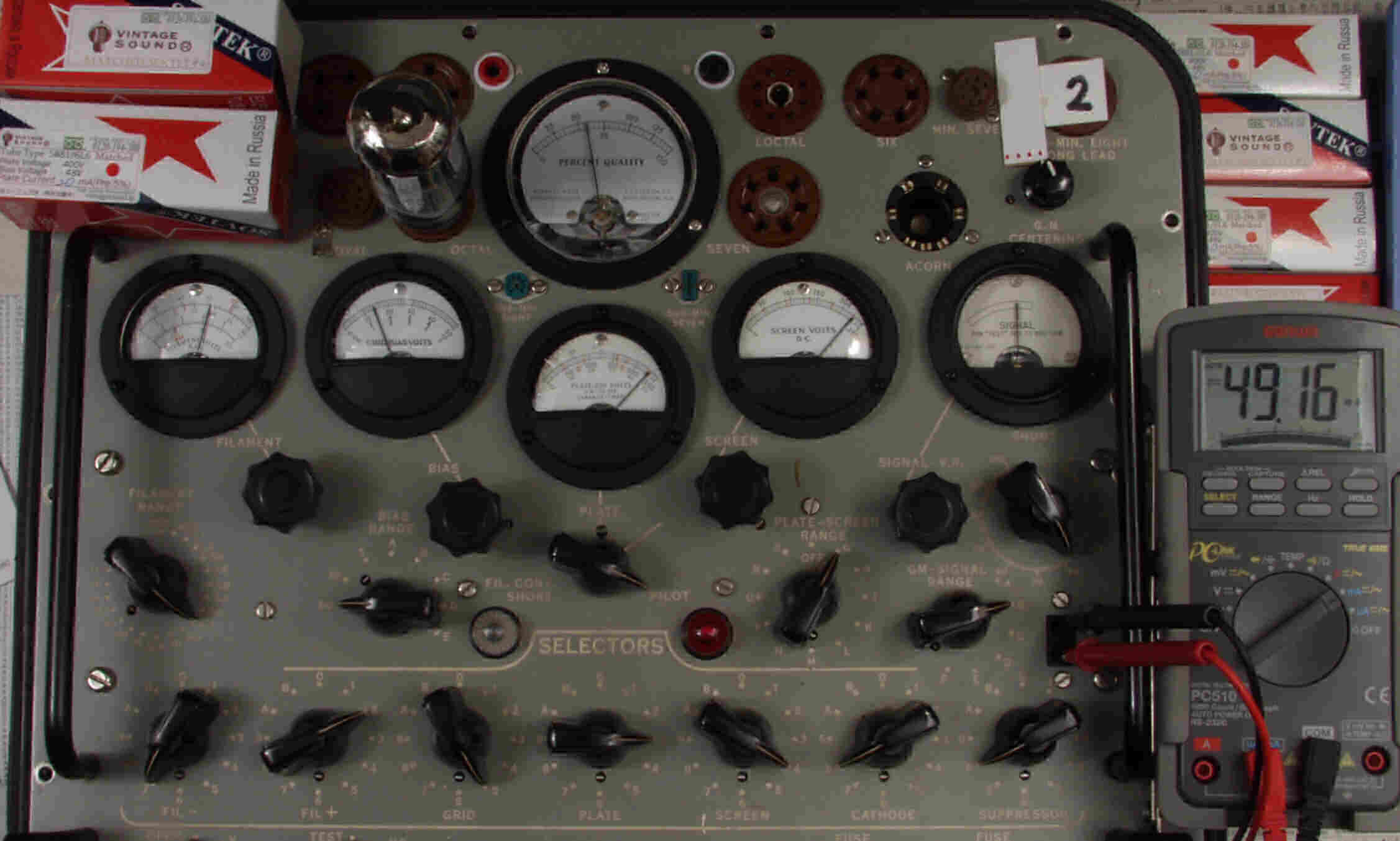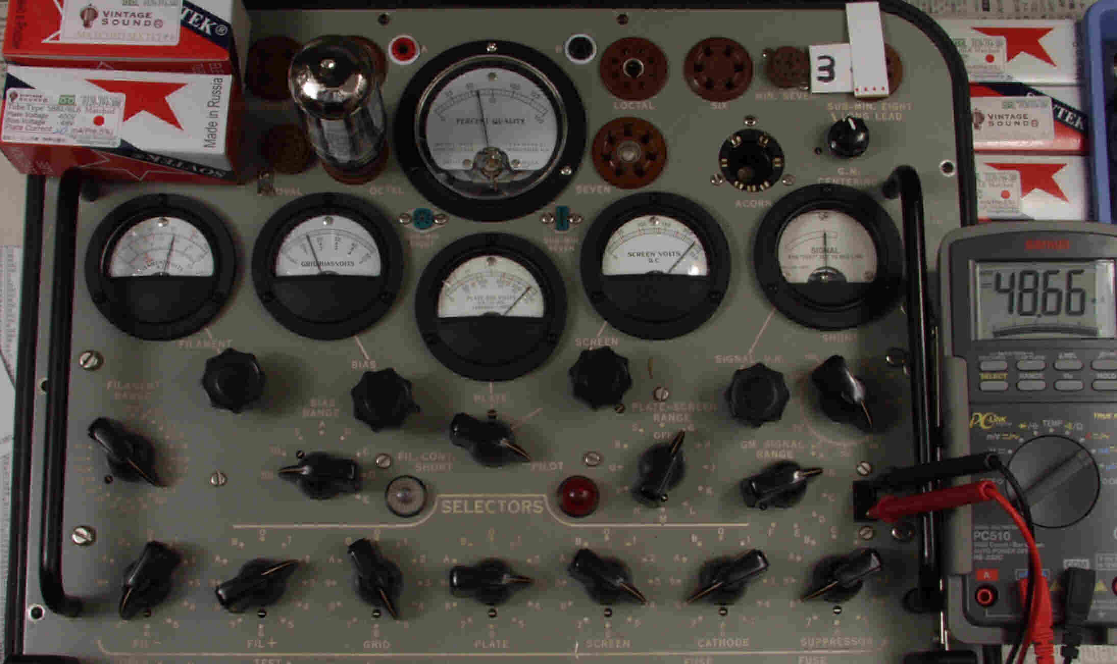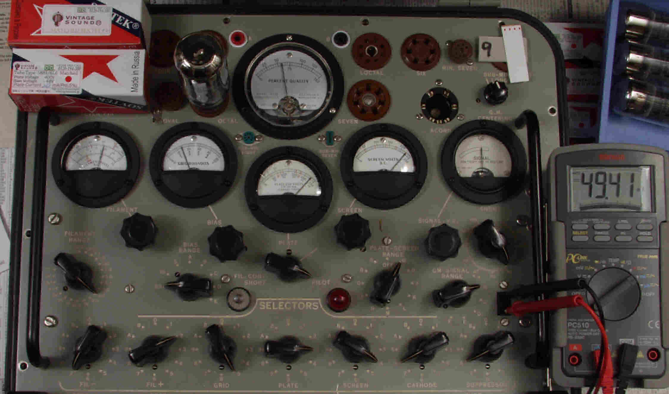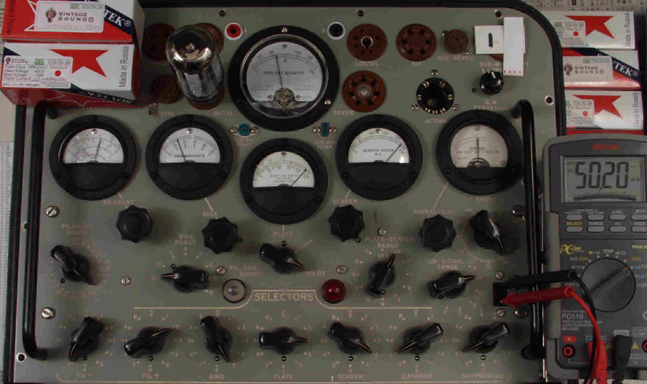 | CB57. SOVTEC 「5881=6L6WGC」7本目。 Gm=5500μ、Ip=47.7mA。 「Ep=230V、Eg2=225V、Eg1=−14V」 |