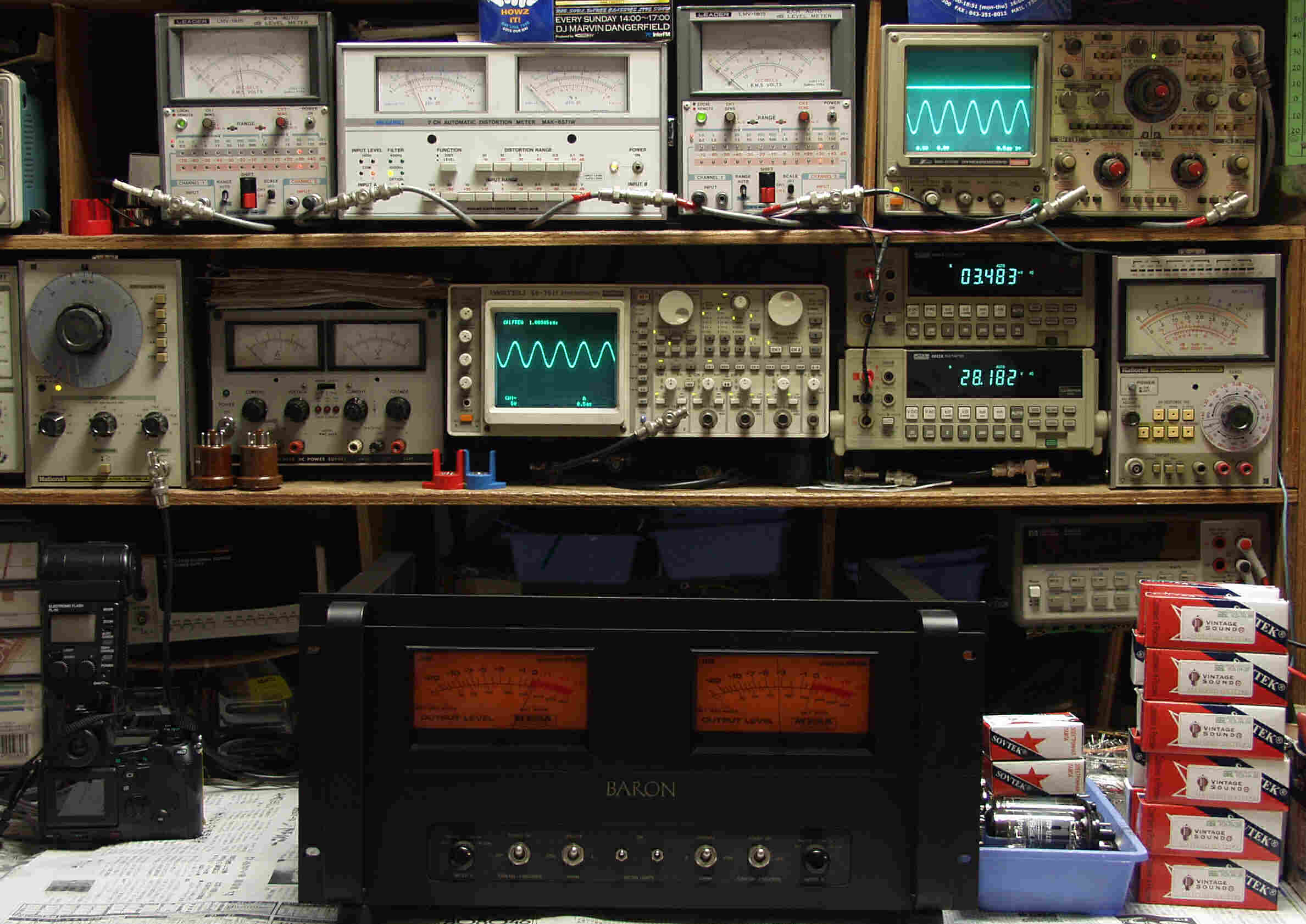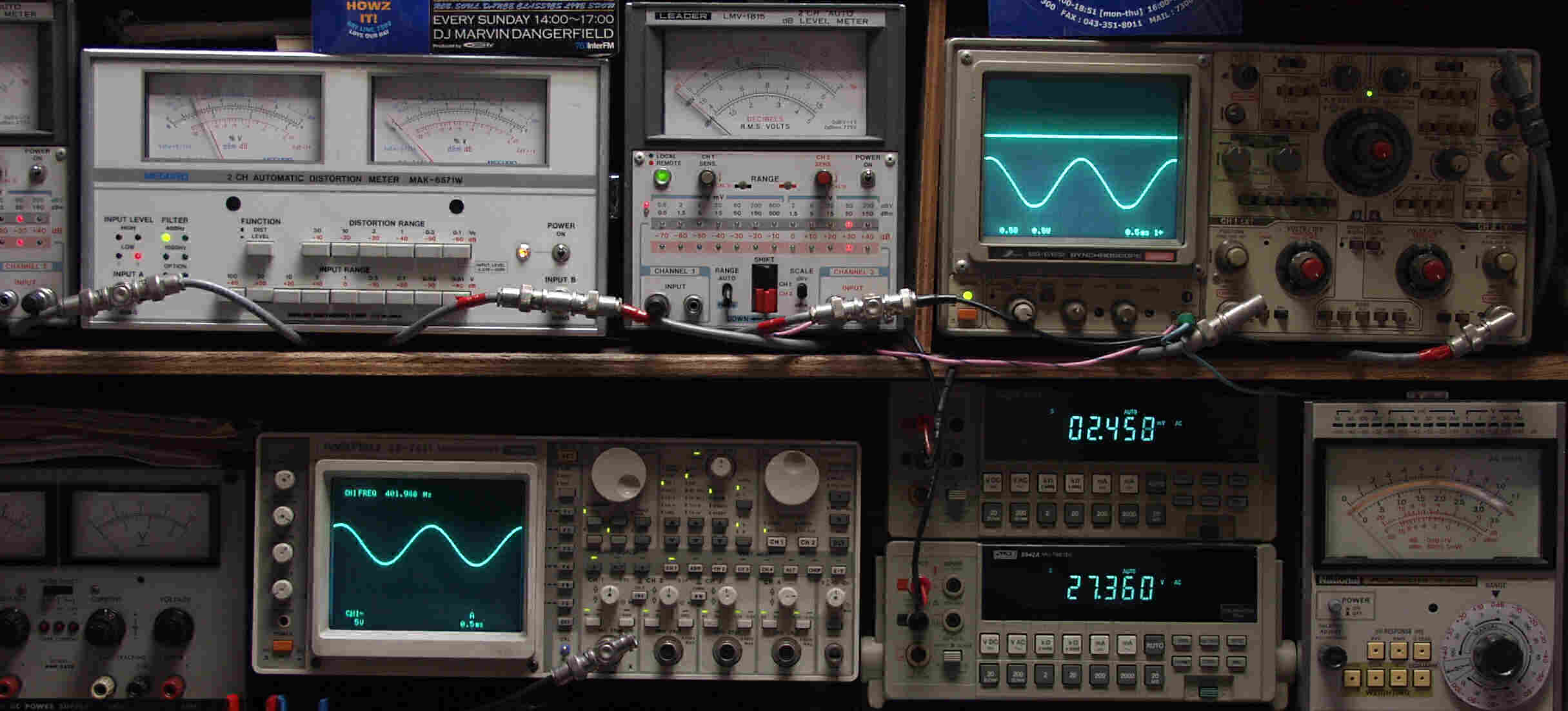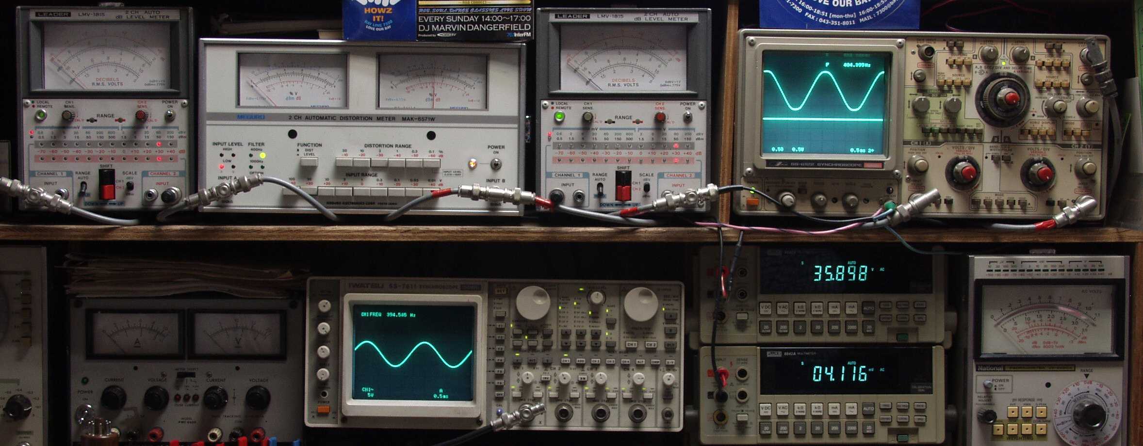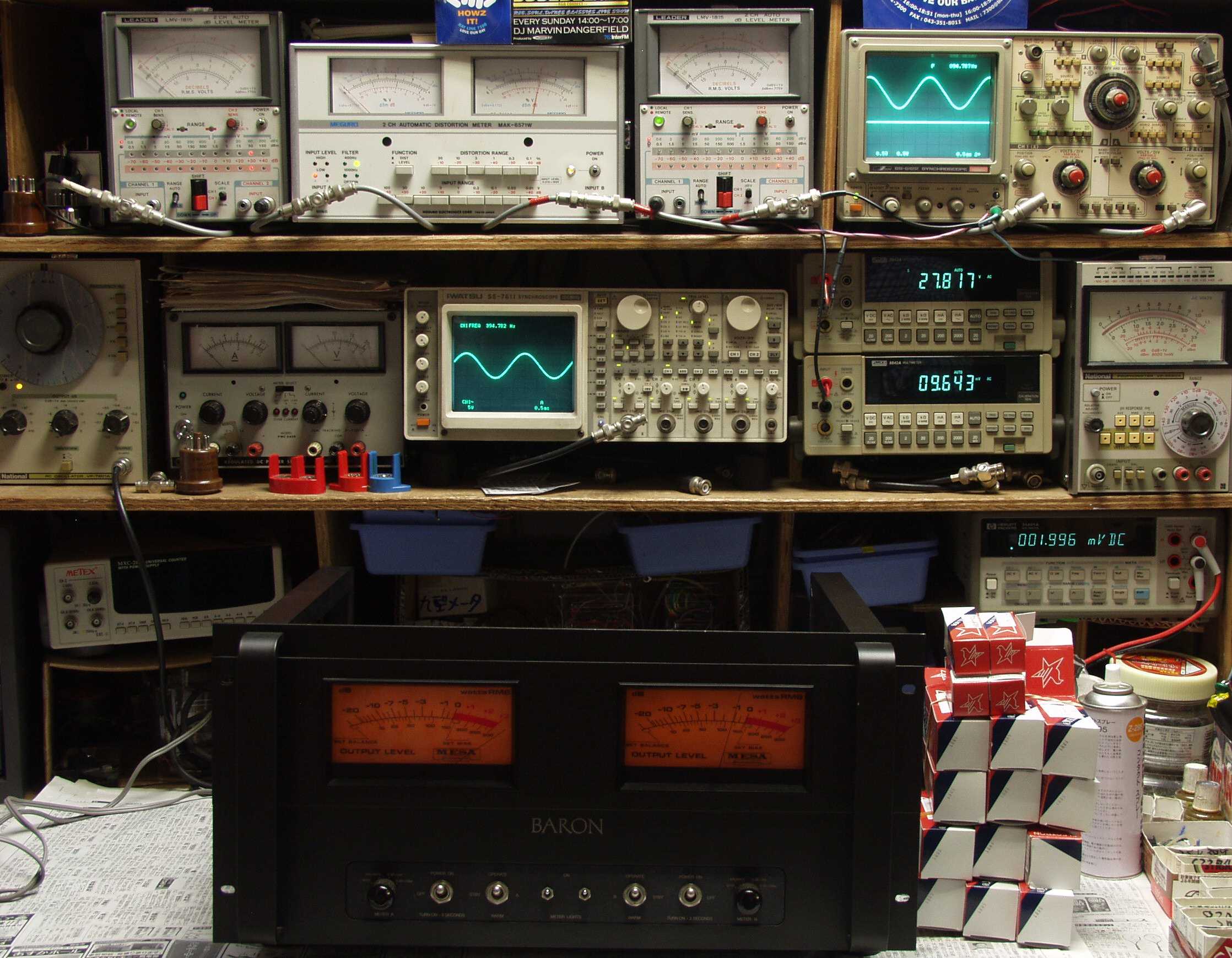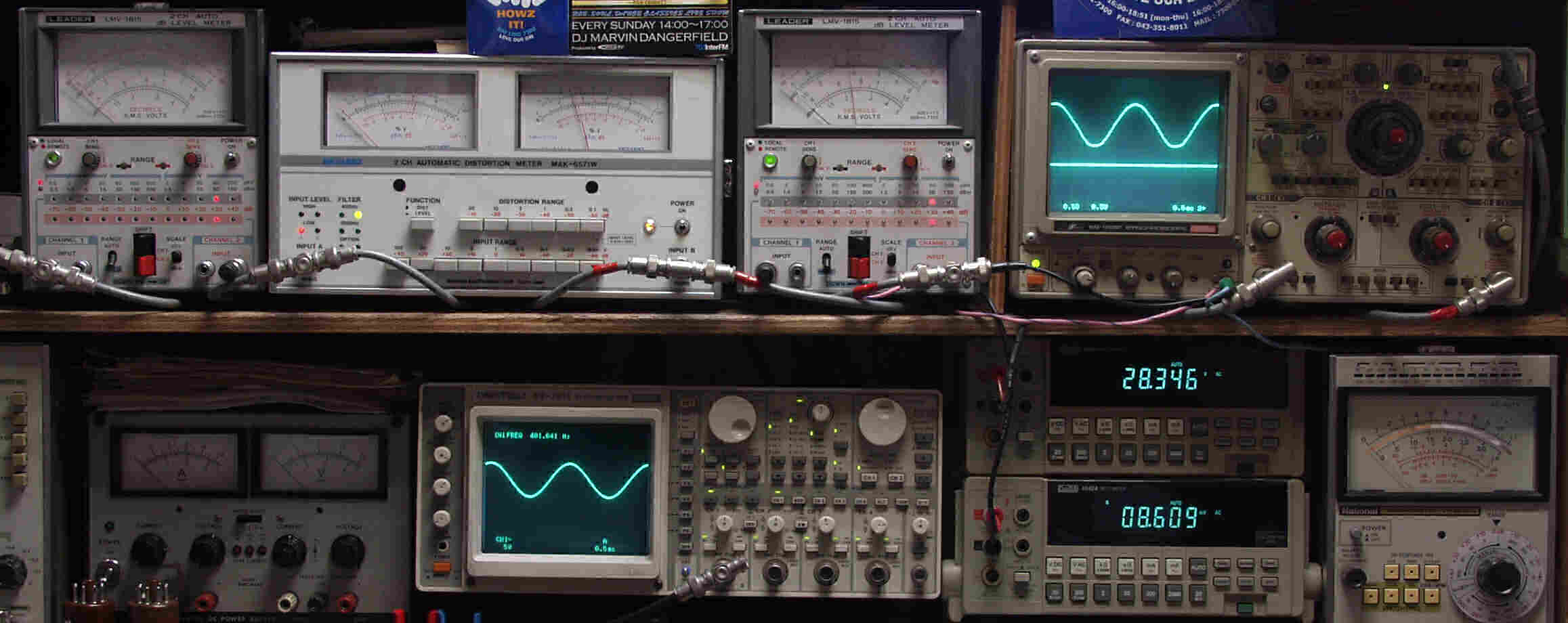 | AE. バラック修理後の新品購入真空管による測定 AE1. 出力・歪み率測定 <見方> 下段左端 オーディオ発振器より400HZ・1KHZの信号を出し(歪み率=約0.003%)これをAMPに入力し、出力を測定 下段中左 オシロ=入力波形(オーディオ発振器のTTLレベル) 下段中右上=周波数計 上段左端 電圧計=L側出力電圧測定、黒針のみ使用 上段中左 歪み率計=出力の歪み率測定 左メータ=L出力、右メータ=R出力 上段中右 電圧計=R側出力電圧測定、赤針のみ使用 上段右端 オシロ=出力波形 上=R出力、下=L出力(実際にはRL電圧計の出力「Max1V」を観測) 下段中右上 デジタル電圧計=R出力電圧測定 下段中右下 デジタル電圧計=L出力電圧測定 |