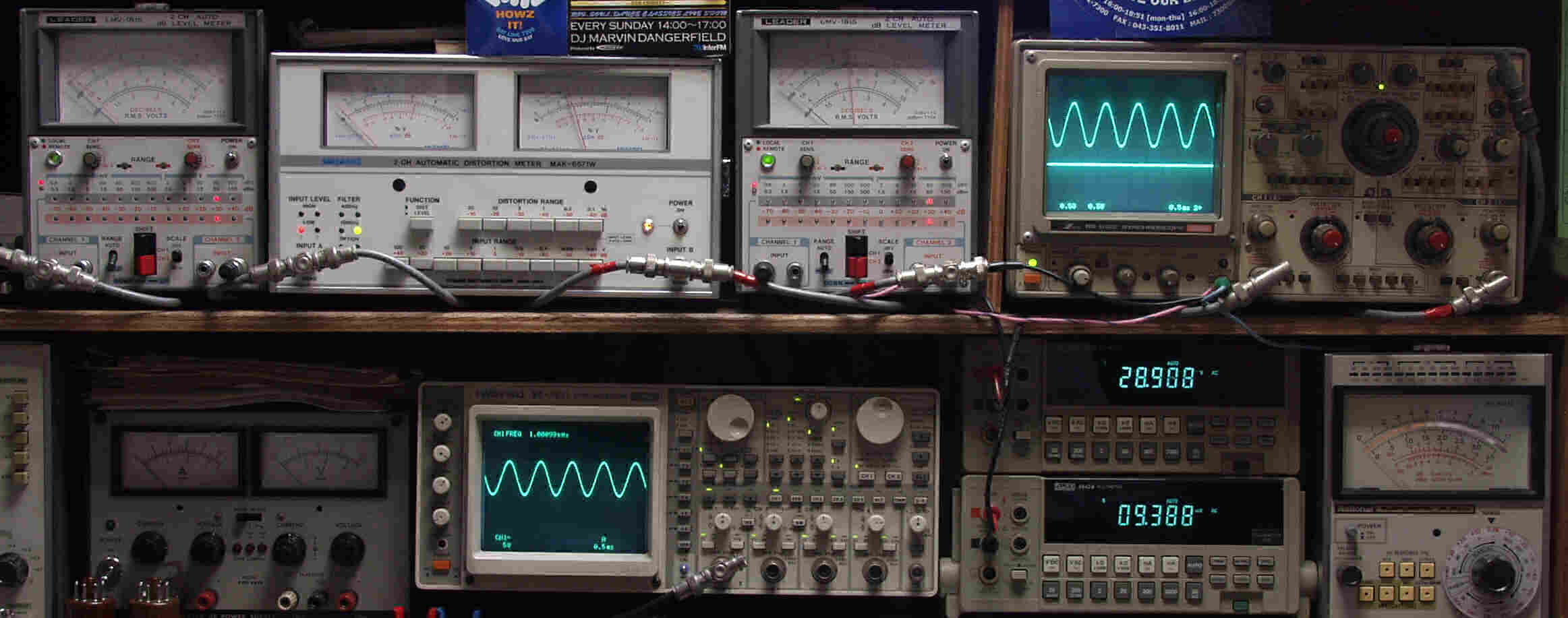 | E. 調整・測定 E1. 出力・歪み率測定・調整 <見方> 下段左端 オーディオ発振器より400HZ・1KHZの信号を出し(歪み率=約0.003%)これをAMPに入力し、出力を測定 下段中左 オシロ=入力波形(オーディオ発振器のTTLレベル) 下段中右上=周波数計 上段左端 電圧計=L側出力電圧測定、黒針のみ使用 上段中左 歪み率計=出力の歪み率測定 左メータ=L出力、右メータ=R出力 上段中右 電圧計=R側出力電圧測定、赤針のみ使用 上段右端 オシロ=出力波形 上=R出力、下=L出力(実際にはRL電圧計の出力「Max1V」を観測) 下段中右上 デジタル電圧計=R出力電圧測定 下段中右下 デジタル電圧計=L出力電圧測定 |