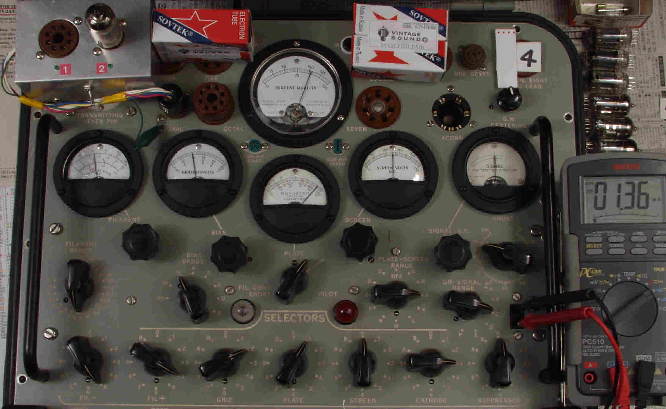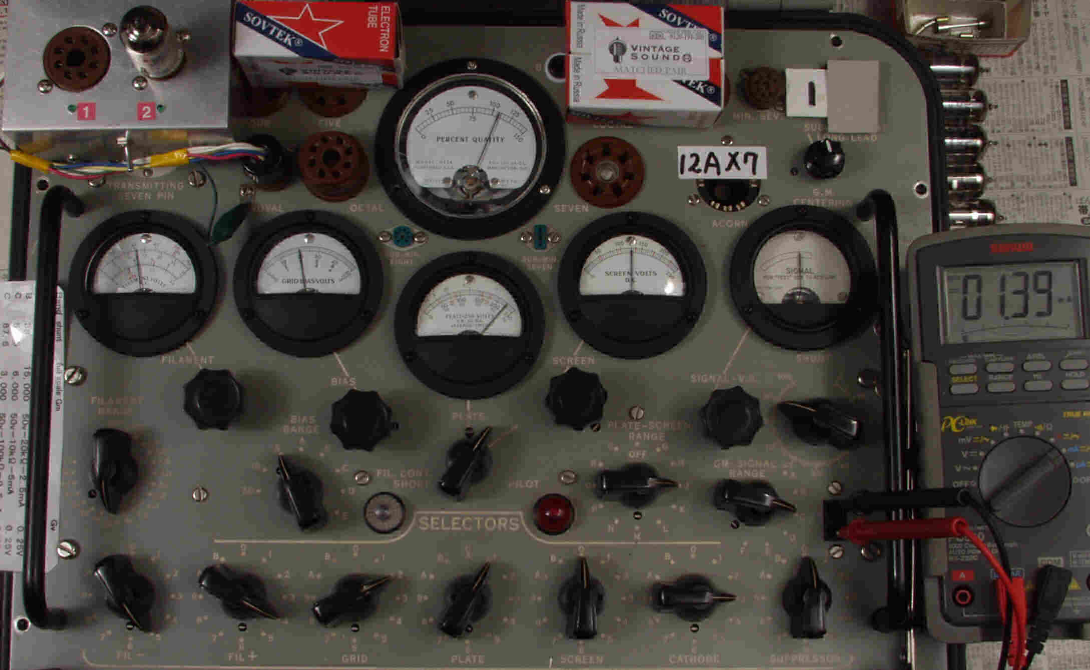 | CB10. SOVTEC 12AX7LP。 Cレンジ=3000μmhoレンジでの測定、「Ep=225V、Eg1=−2V」。 真空管ハンドブック(規格表)の値。 相互コンダクタンス=1600μmho「Ep=250V、Eg1=−2V」(1960/1962ナショナル真空管ハンドブックより)、(インプレス オーディオ用真空管マニアルより)、(RC−26,RC−30 Receiving Tube Manualより) SOVTEC 12AX7LP。 左から1本目..4本目。 |