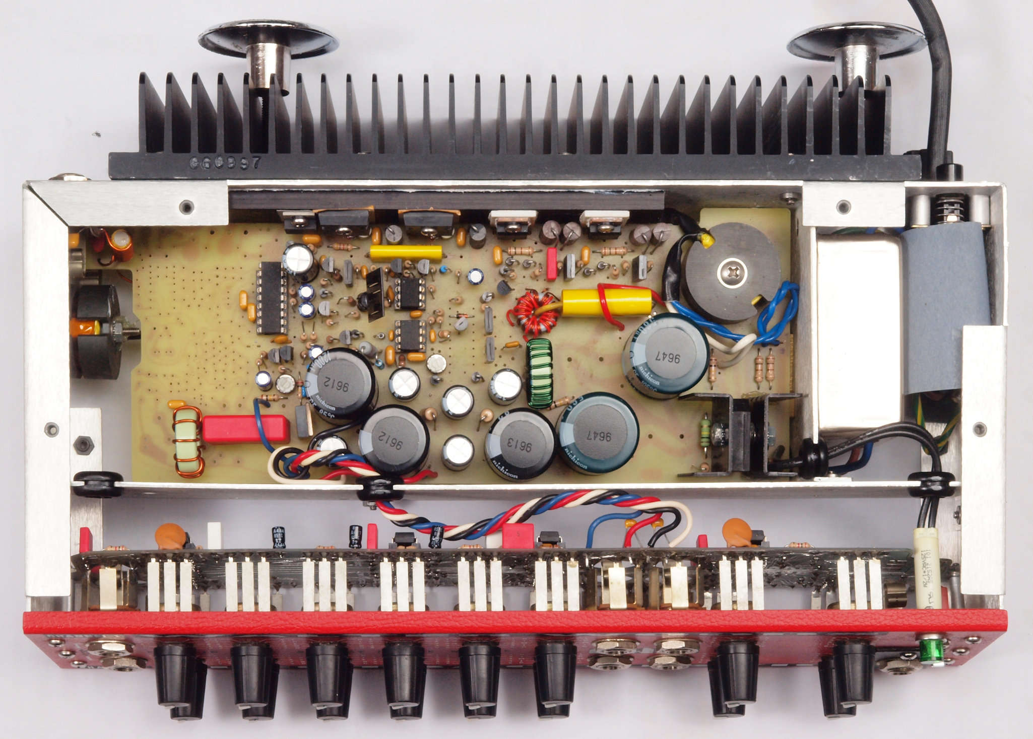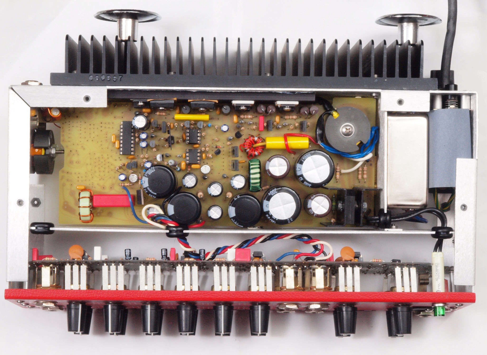 | C. 修理状況。 画像をクリックすると、大きく(横幅2050ドット)表示されます。 C11. 修理中 メインAMP基板、ICの型番は消されている。 |