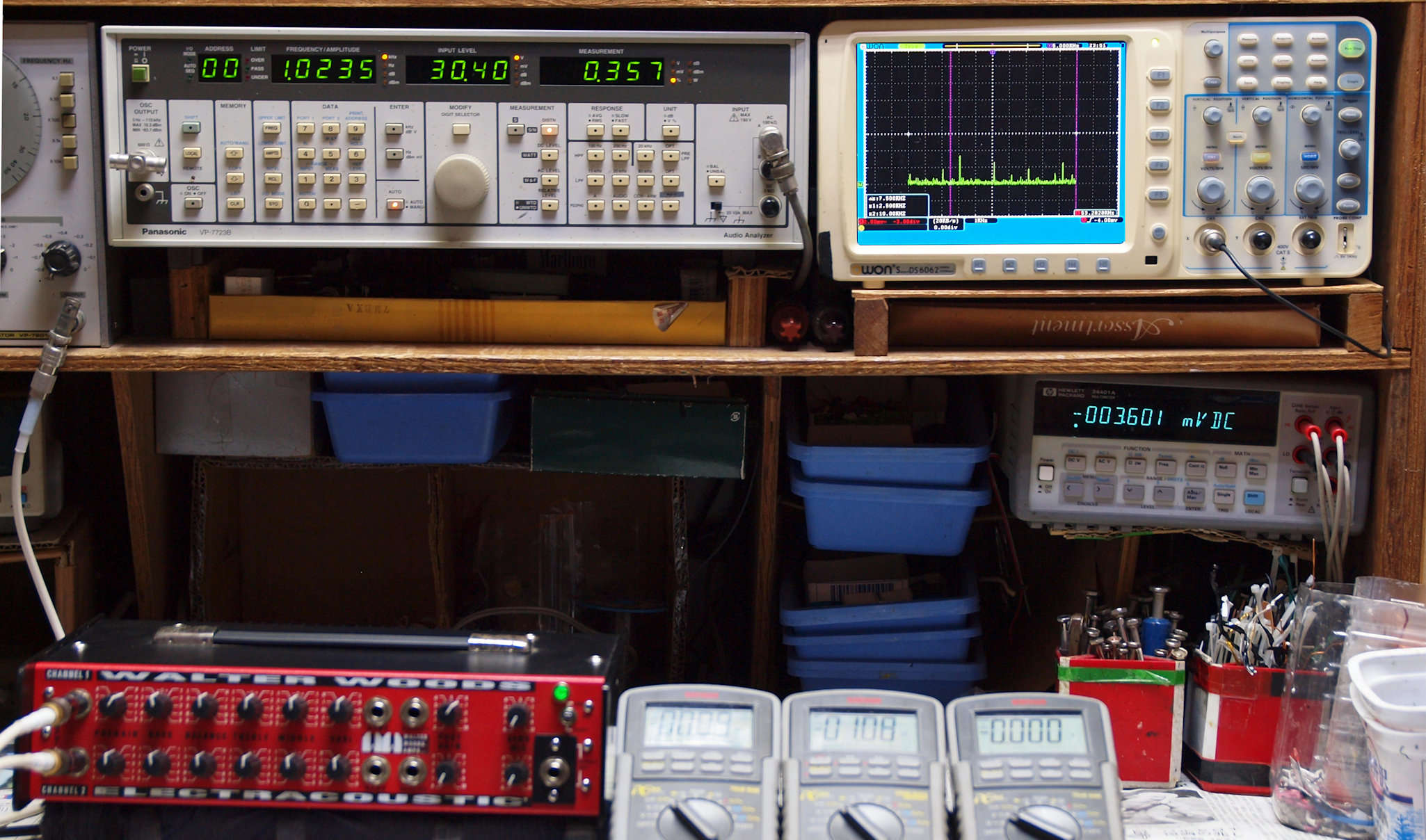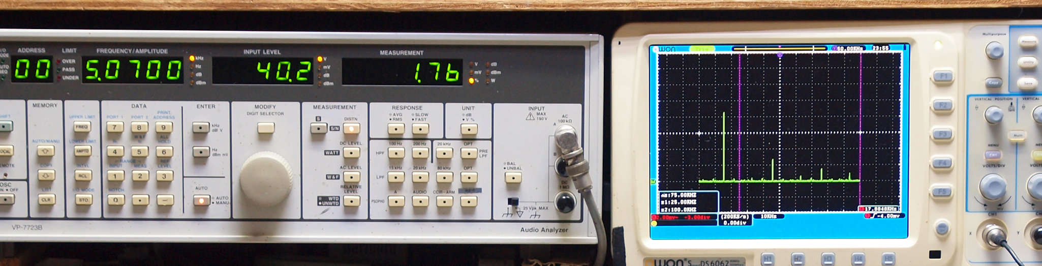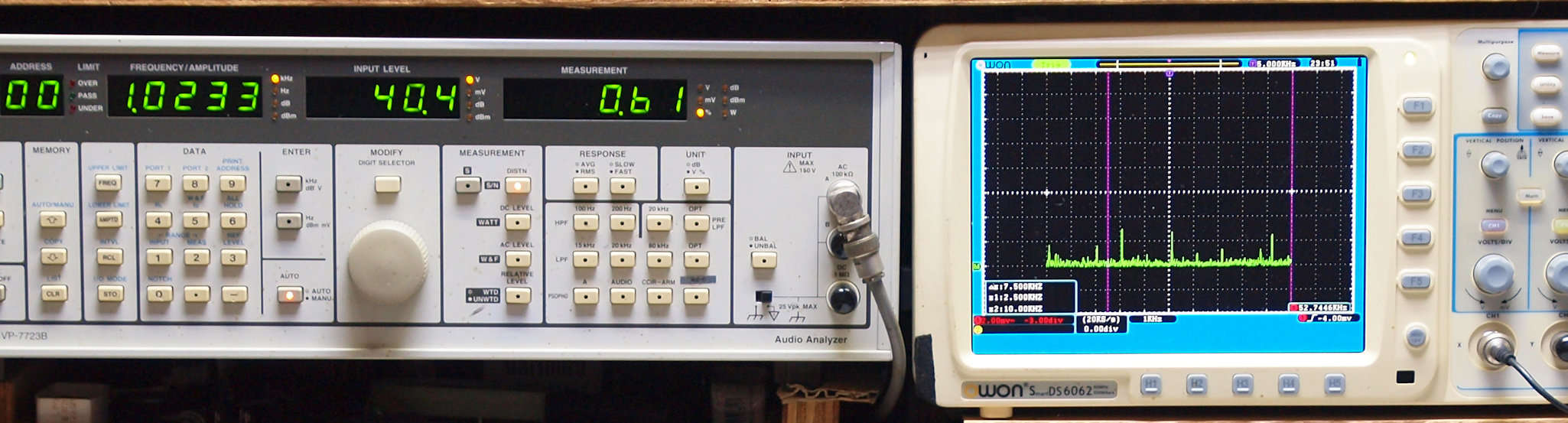 | E. 調整・測定。 画像をクリックすると、大きく(横幅2050ドット)表示されます。 E0. 出力、歪み調整・測定、電源電圧は100Vにて測定 「見方」。 中、 SP出力を「Audio Analyzer Panasonic VP−7723B」により測定。 表示LED、 左端=メモリーNo、 中左=周波数測定、 中右=出力電圧測定、 右端=歪み率測定。 右端、 VP−7723Bの基本波除去出力を「owon SDS6062(200MHZ)」で「FFT分析」表示。 左端、 オーディオ発振器 VP−7201A より50Hz〜100kHzの信号を出し(歪み率=約0.003%)、ATT+分配器を通し、AMPに入力。 よって、ダイアル設定出力レベルより低くなります。測定機器の仕様や整備の様子はこちら、「VP−7723B」「VP−7201A」。 FFT画面の見方はこちら。 |
