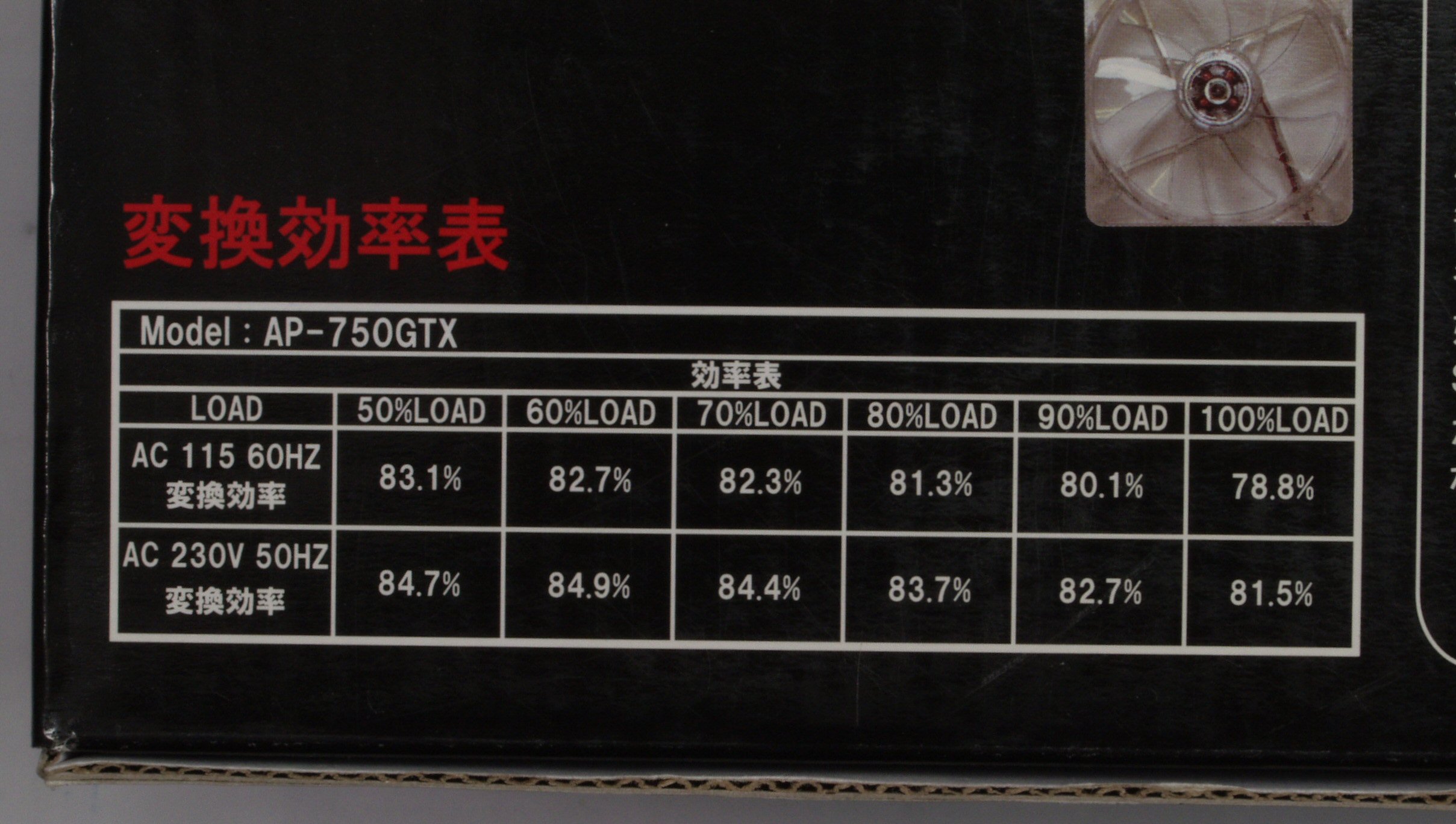 | 3. AQTIS MODELAP-750GTX、変換効率表。200V供給の方が効率が良い。 |