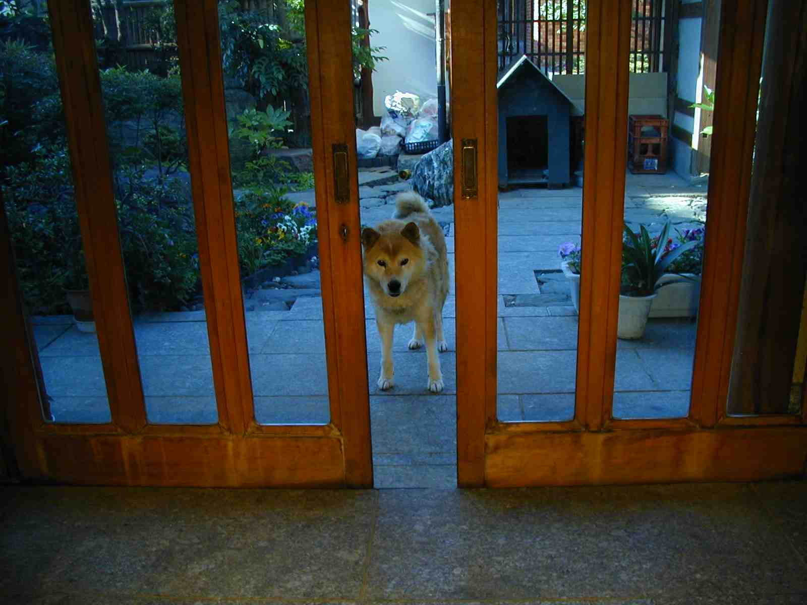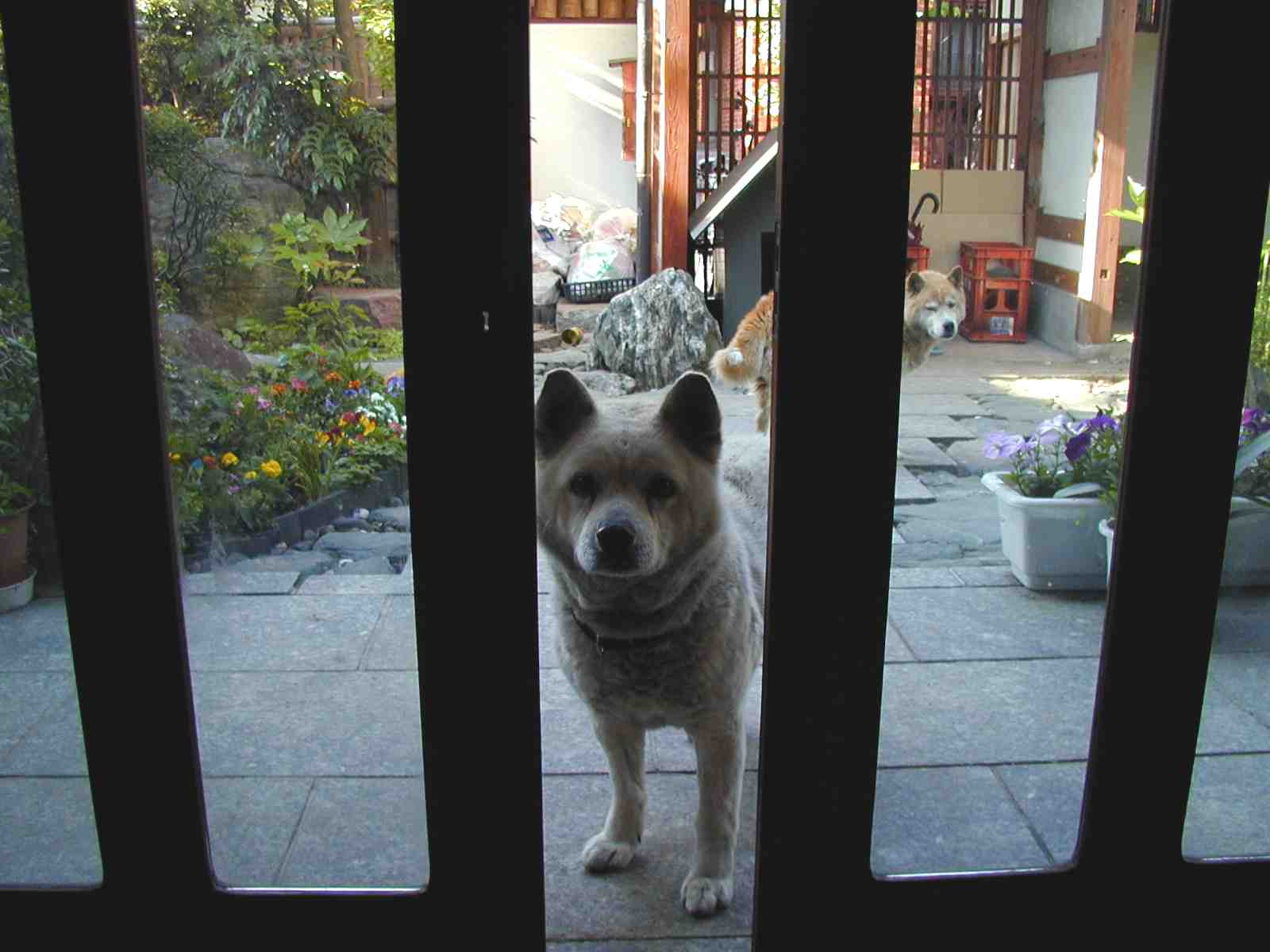 家は塀に囲まれ、門に格子戸があるので、庭と玄関に放し飼。 |