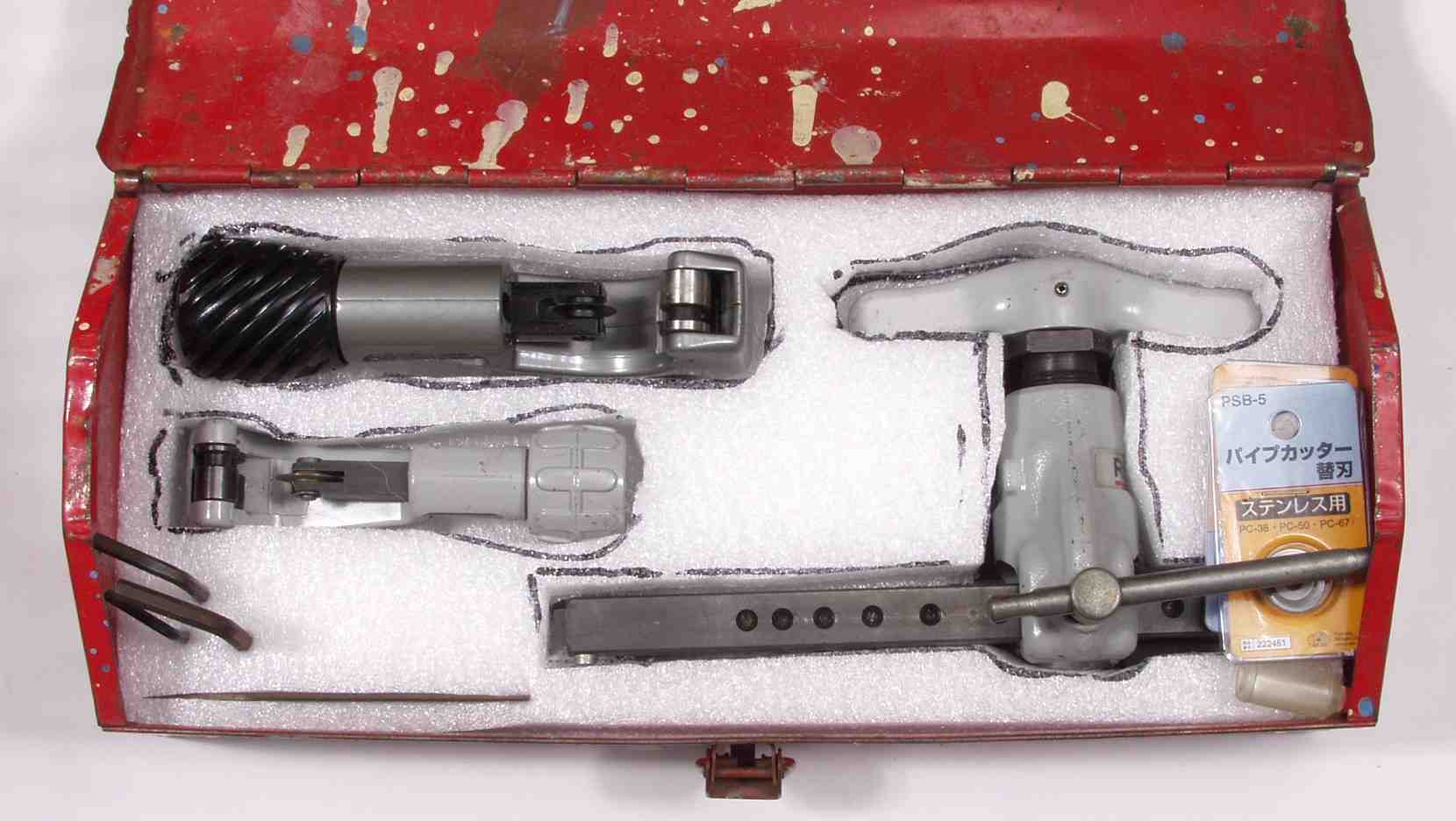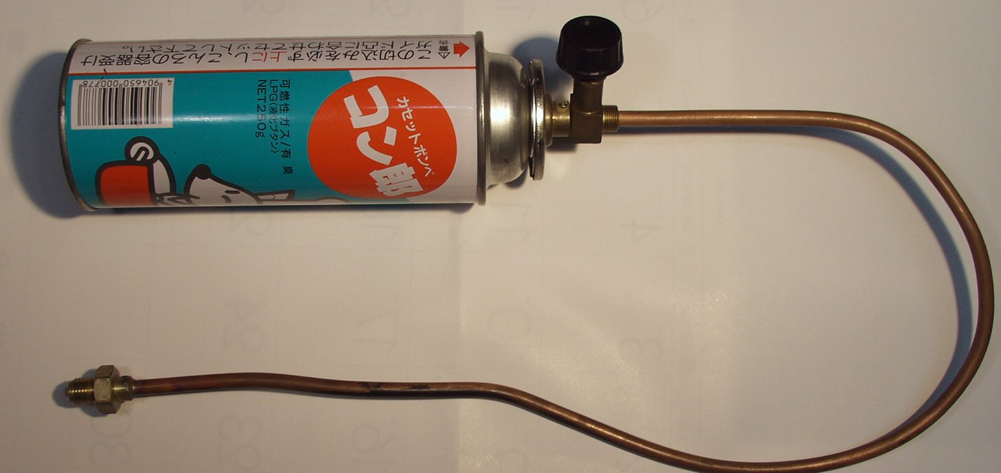 少しでもフロンの空気中の流出を防ぐため、事前に、卓上コンロ用のブタンガスで行う |