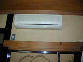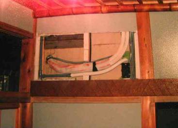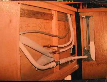 13.その壁の裏の配管、配線の様子 左端がドレイン配管、上に空気抜き。