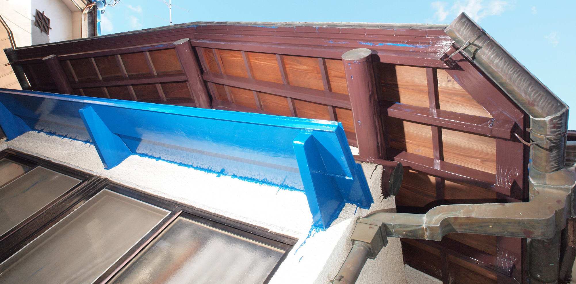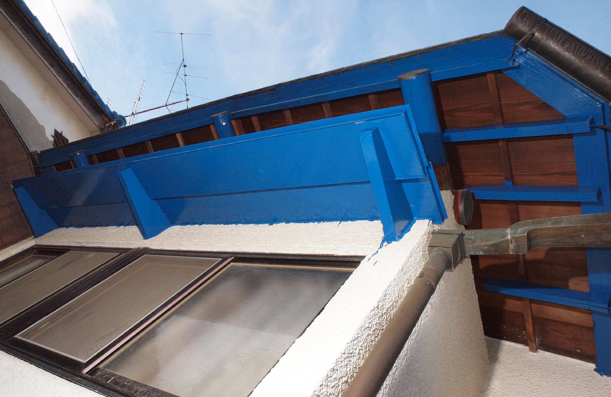 32. 塗装中 西側軒天、1回目の塗装終了。