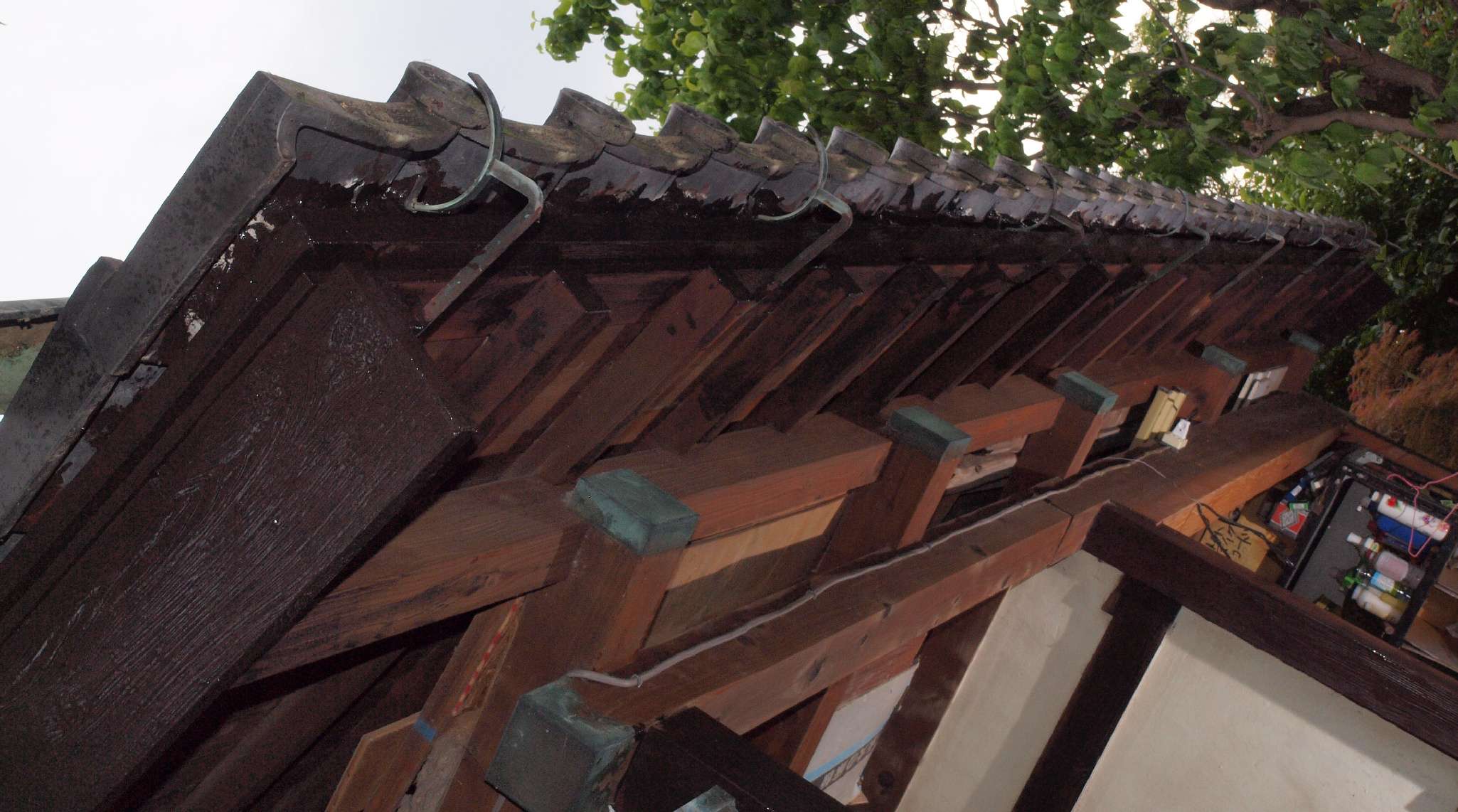 73. 平成29年塗装・修理中 北側軒天、東より。 広小舞、淀を塗装。