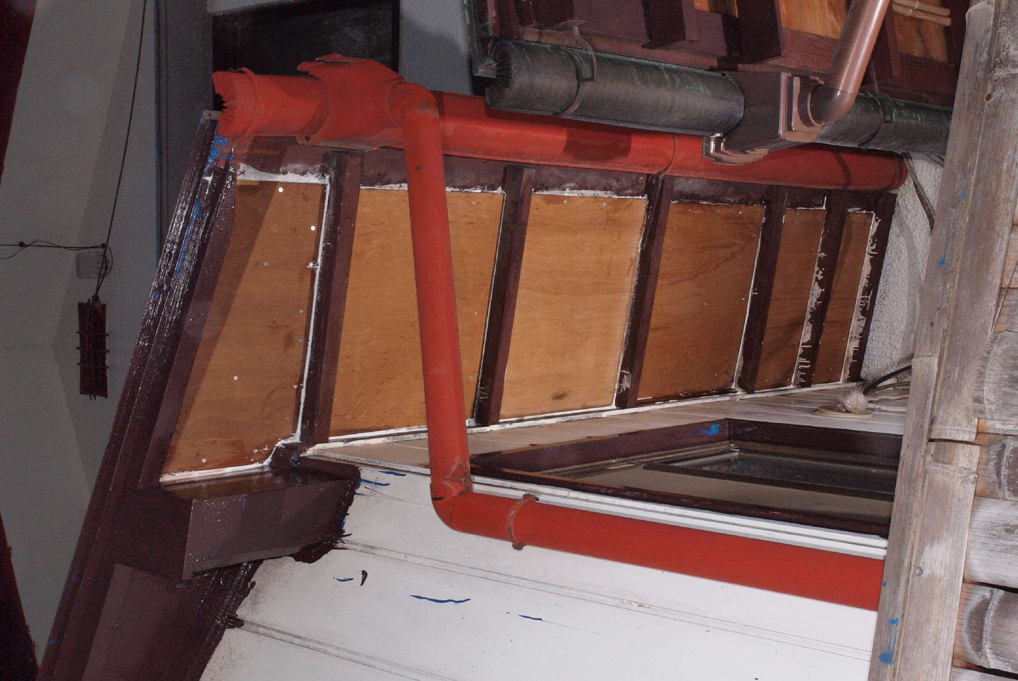 | 82. 平成25年修理中 1階南側軒天。4mmベニヤをボンドとビスで固定し、下から押し上げて接着。 |