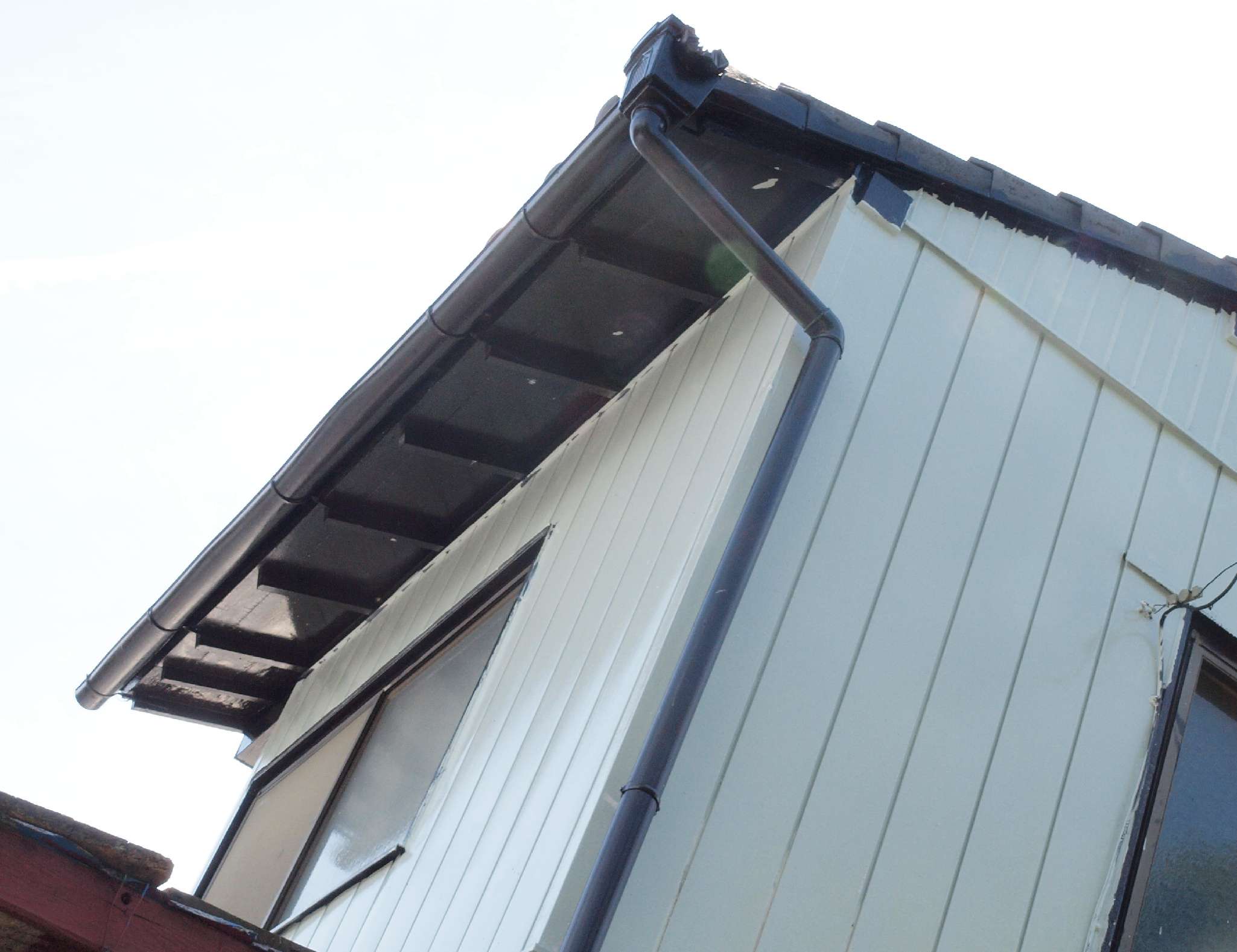 | A2. 平成29年塗装完成 2階東側。 左屋根からの樋は経路変更した。 |