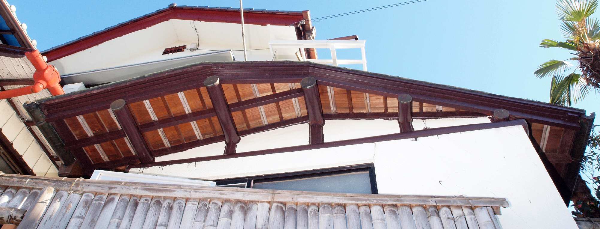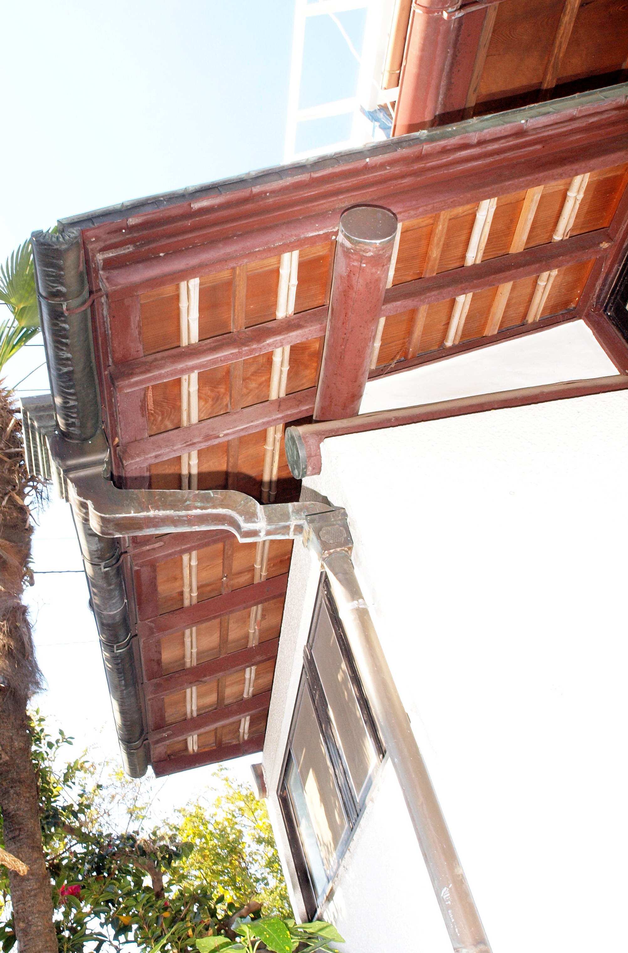 42. 平成29年塗装中 南側軒天、東側から。 樋を外し塗装する。