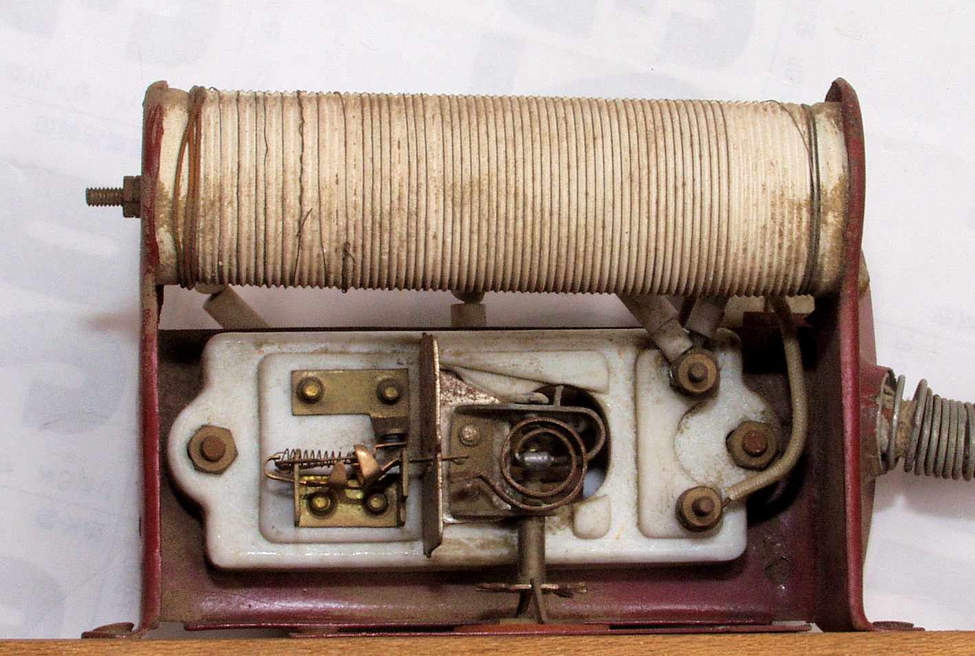 | 5.コード取り付け、ネオンランプ、温度フューズ。 発熱体ニクロム線は補修してある。 |