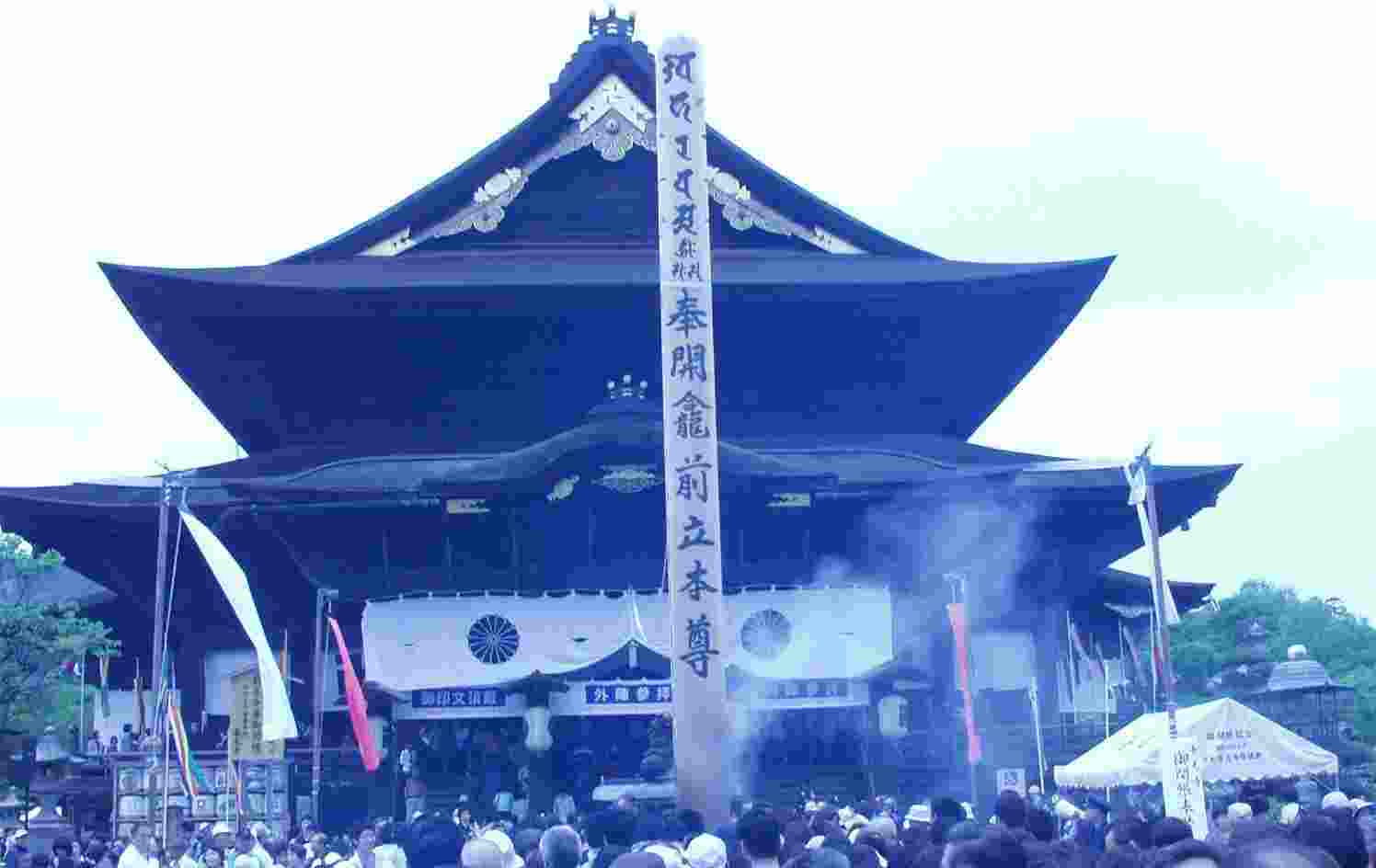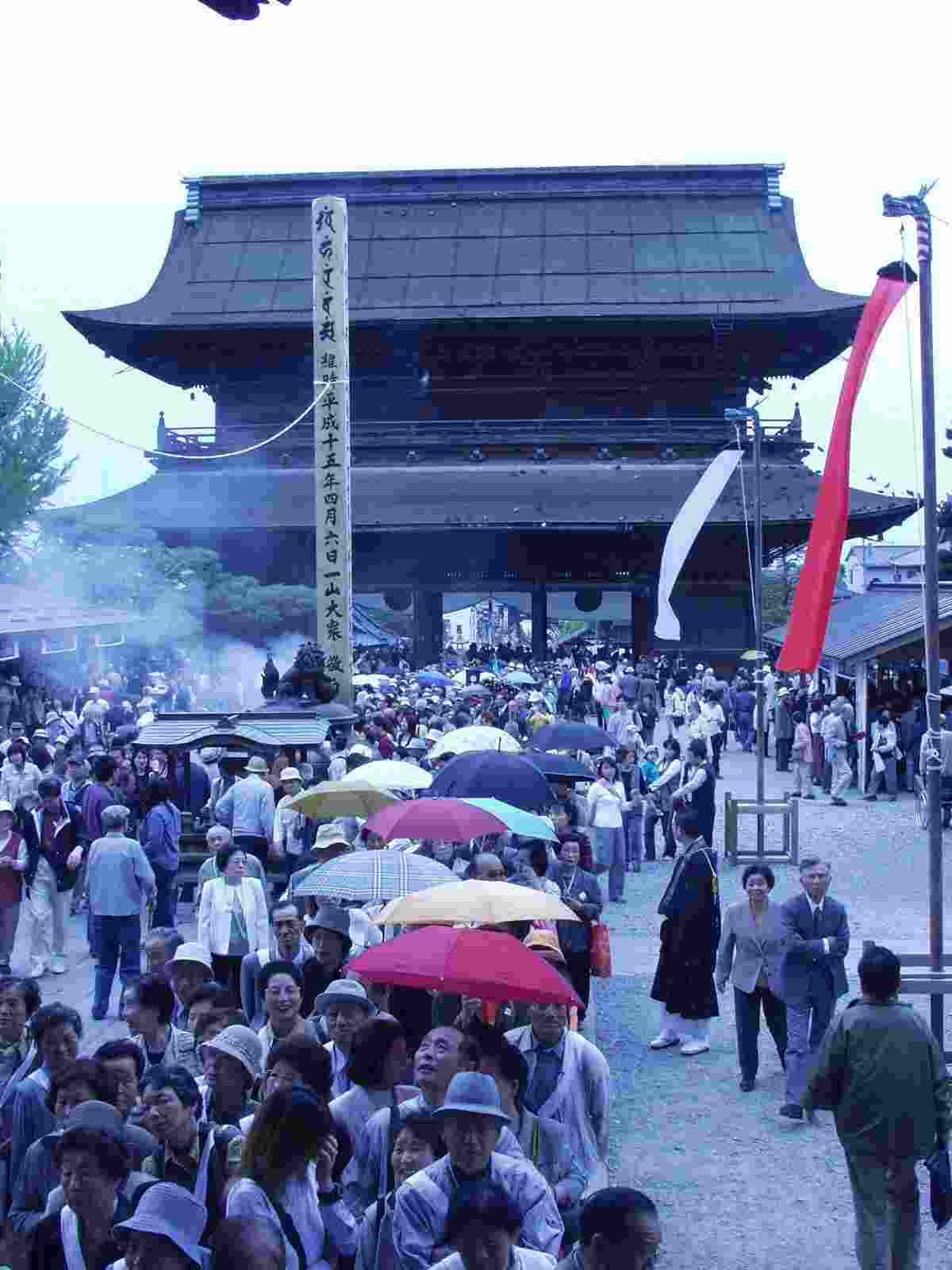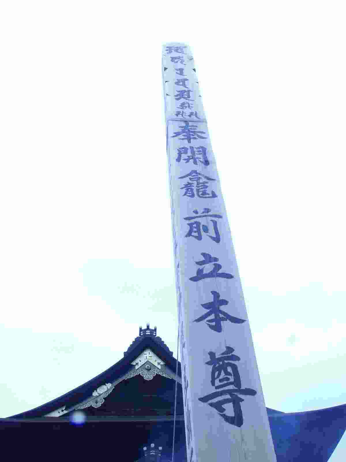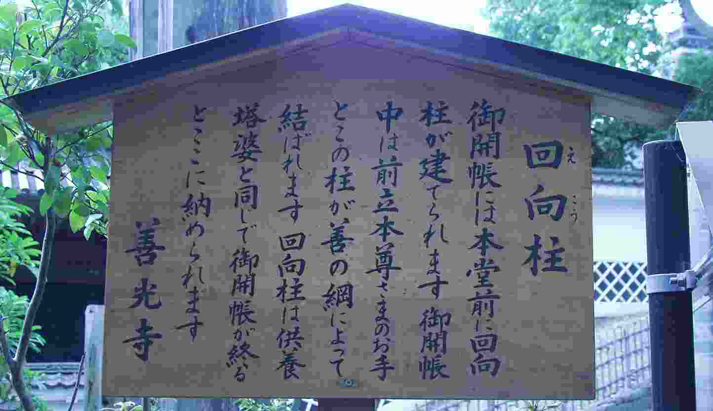 | 回向柱とは この巨大な柱は「卒塔婆」(そとば)の一種 卒塔婆とは、墓石の脇に立てる細長い板材の板塔婆を指すことが多いようですが、もともとはお釈迦さまの遺骨(仏舎利)を納めた土まんじゅう型の仏塔を表すことばでした。 大回向柱のその後 五十六日間に及ぶご開帳のシンボルとして触れられてきた大回向柱は、ご開帳が終了すると経蔵の裏手にある林の中に移動し長い月日を経て土に還って行く。 回向柱に触れるのはなぜ 柱に触れて極楽往生を祈ります 「善の綱」によって前立本尊とつながった回向柱は、如来様の命を宿すとされるためです。 如来さまと結縁(仏さまと縁ができること)してみ仏のご慈悲を受けることができるのです。 前立本尊の右手に結んだ「金糸」は本堂に向かってのび、内々陣を出て途中で「五色」に変わり、本堂を出ると 「白い布」接がれ回向柱へと続いている。 |