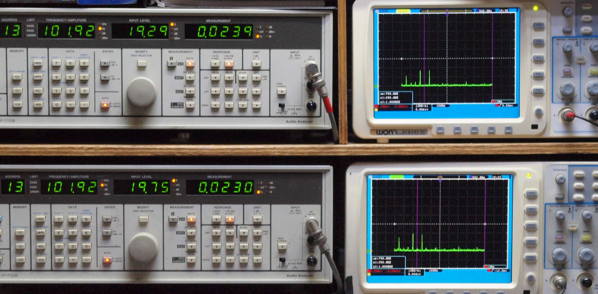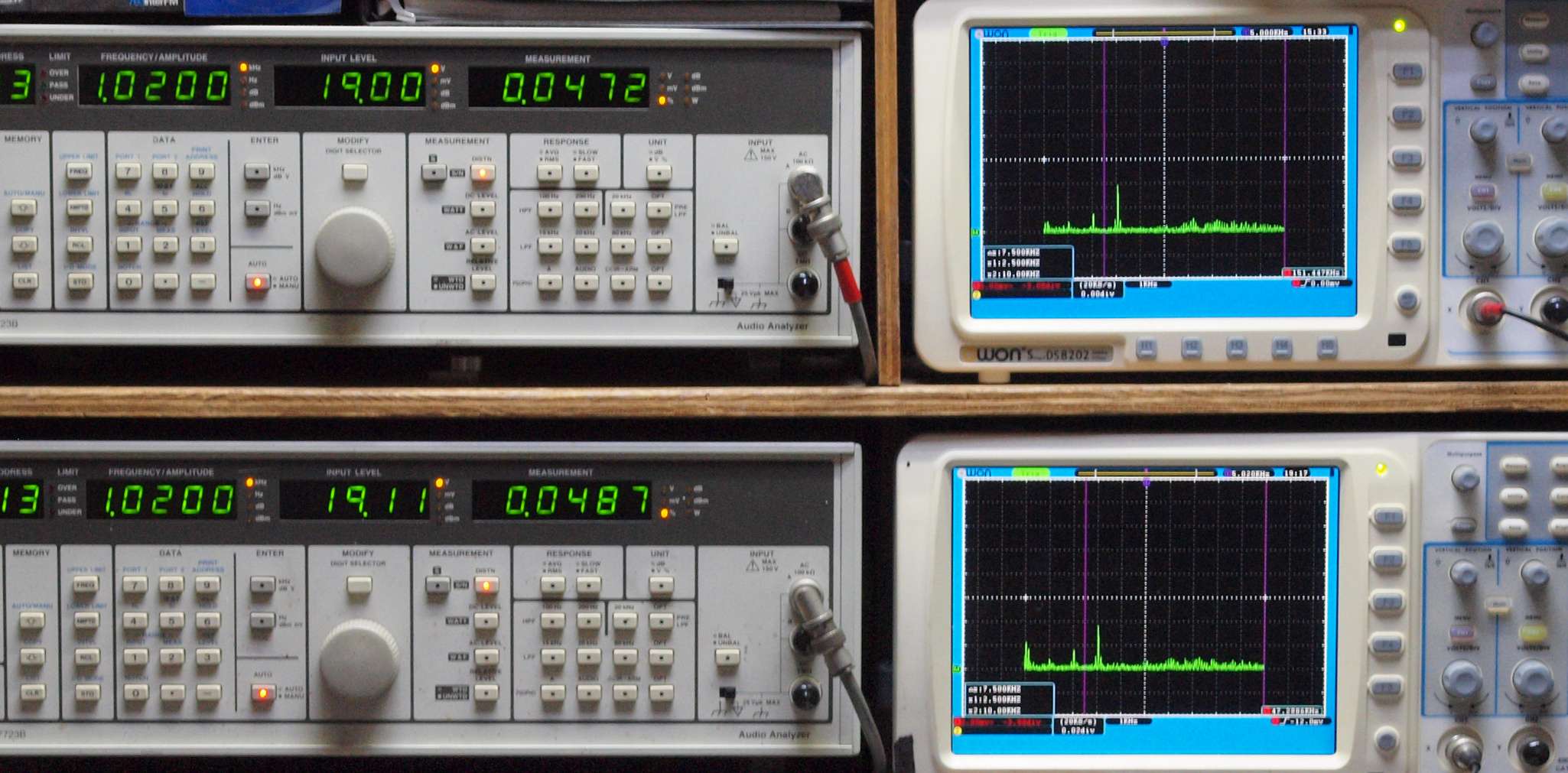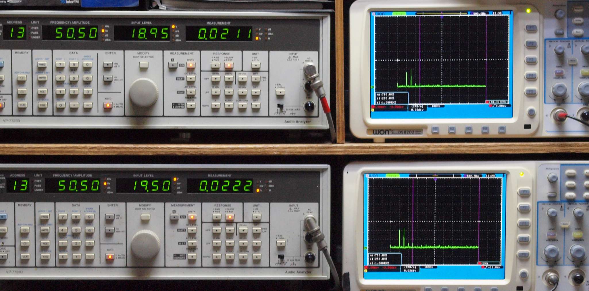 | E. 測定・調整。 画像をクリックすると、大きく(横幅2050ドット)表示されます。 E0. 出力・歪み率測定・調整 「見方」。 上段中 右側SP出力を「Audio Analyzer Panasonic VP−7723B」により測定。 表示LED、 左端=メモリーNo、 中左=周波数測定、 中右=出力電圧測定、 右端=歪み率測定。 上段右端 VP−7723Bの基本波除去出力を「owon SDS8202(200MHZ)」で「FFT分析」表示。 下段中 左側SP出力を「Audio Analyzer Panasonic VP−7723B」により測定。 表示LED、 左端=メモリーNo、 中左=周波数測定、 中右=出力電圧測定、 右端=歪み率測定。 下段右端 VP−7723Bの基本波除去出力を「owon SDS6062(200MHZ)」で「FFT分析」表示。 下段左端 オーディオ発振器 VP−7201A より50Hz〜100kHzの信号を出し(歪み率=約0.003%)、ATT+分配器を通し、AMPに入力。 よって、ダイアル設定出力レベルより低くなります。測定機器の仕様や整備の様子はこちら、「VP−7723B」「VP−7201A」。 FFT画面の見方はこちら。 |