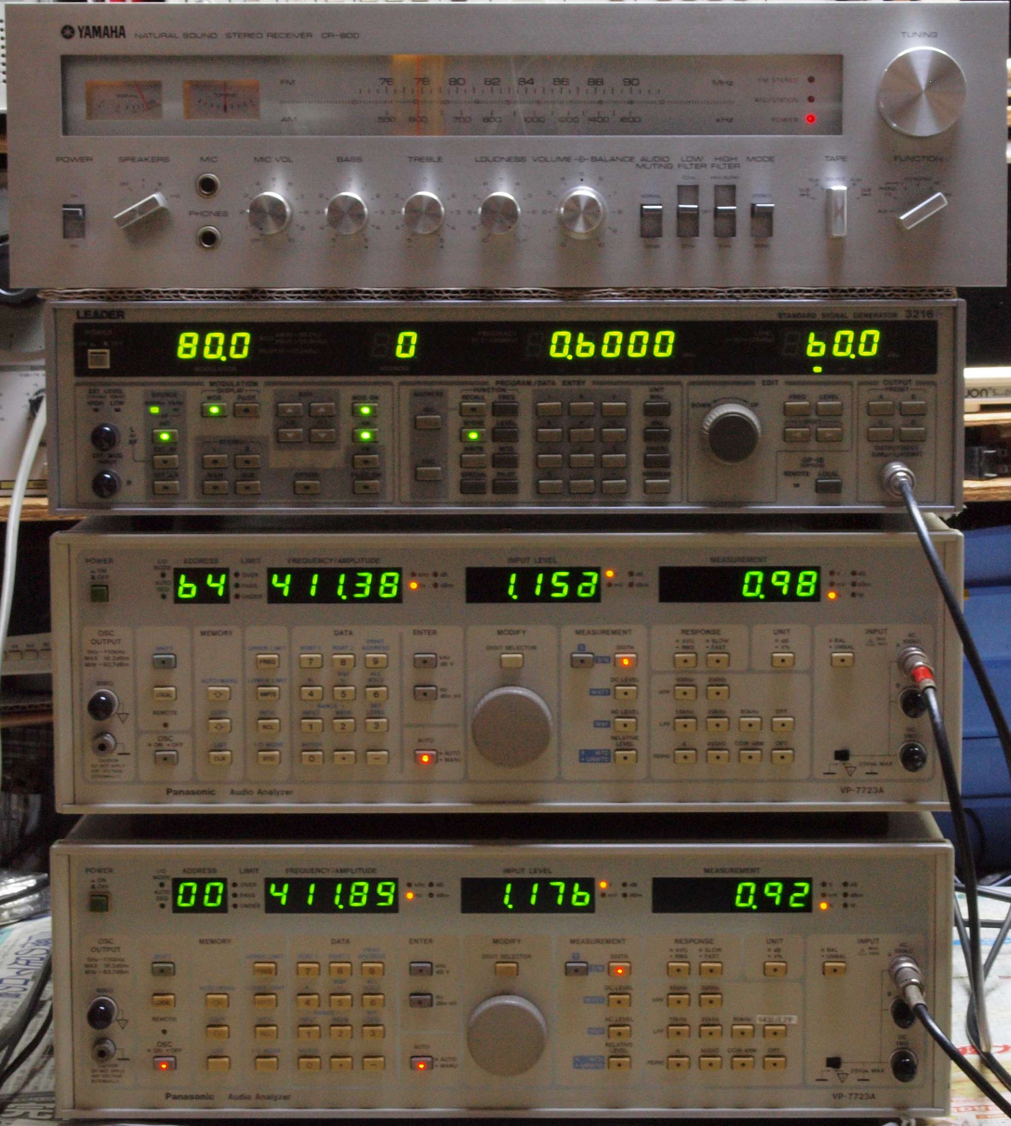 | F. チューナ測定・調整。 画像をクリックすると、大きく(横幅2050ドット)表示されます。 F0. FM受信感度、歪み、分離度測定調整 <見方> 上の「LEADER 3216P FM ステレオ信号発信器」より信号を出す。 これを受信し出力を測定する。 表示LED、 左端=変調度、 中左=メモリNo、 中右=出力周波数、 右端=出力レベル。 中=RR側テープ録音出力測定。 「Audio Analyzer Panasonic VP−7723B」より測定。 表示LED、 左端=メモリーNo、 中左=周波数測定、 中右=出力電圧測定、 右端=歪み率測定。 下=LR側テープ録音出力測定。 「Audio Analyzer Panasonic VP−7723B」より測定。 表示LED、 左端=メモリーNo、 中左=周波数測定、 中右=出力電圧測定、 右端=歪み率測定。 |
