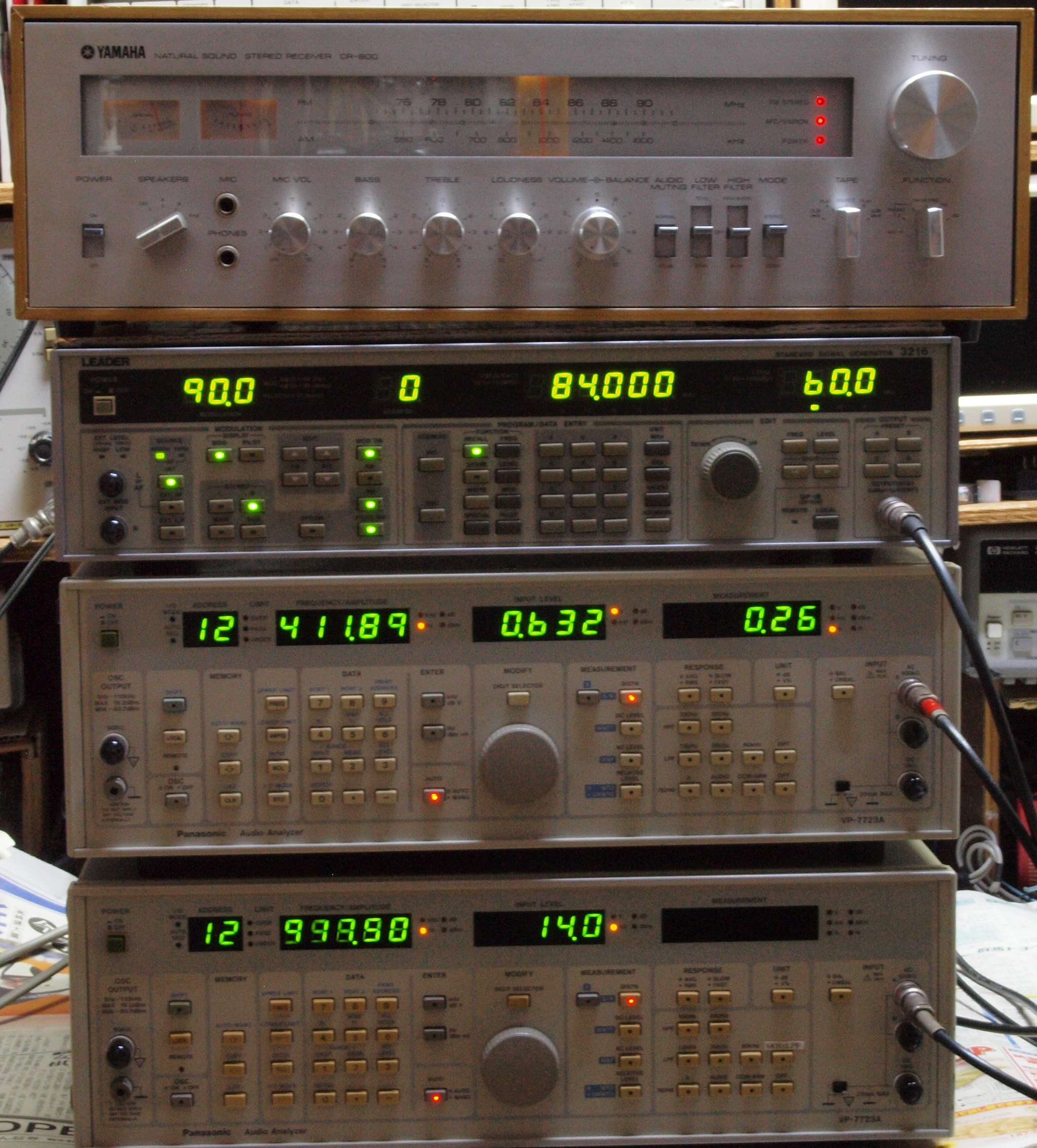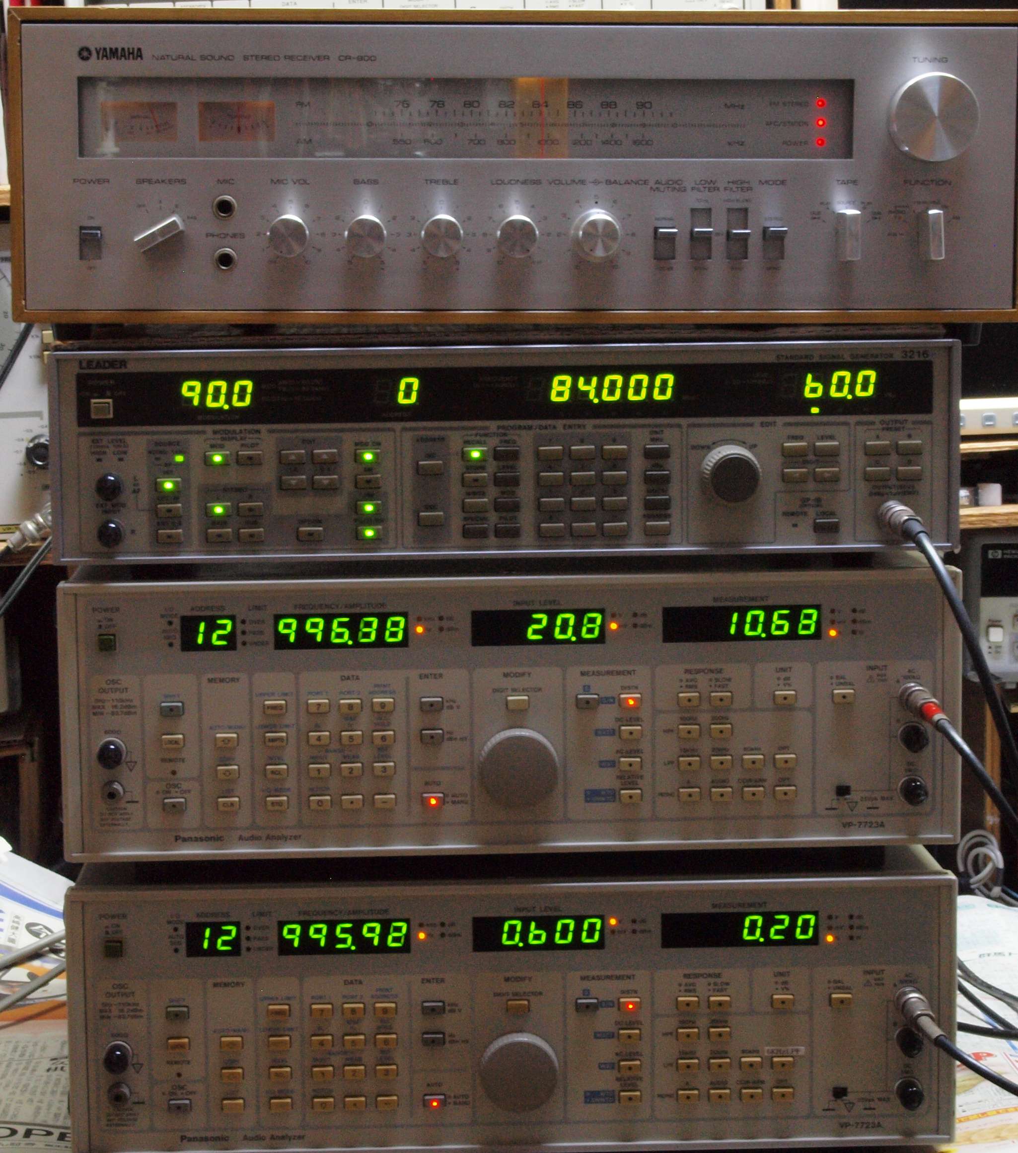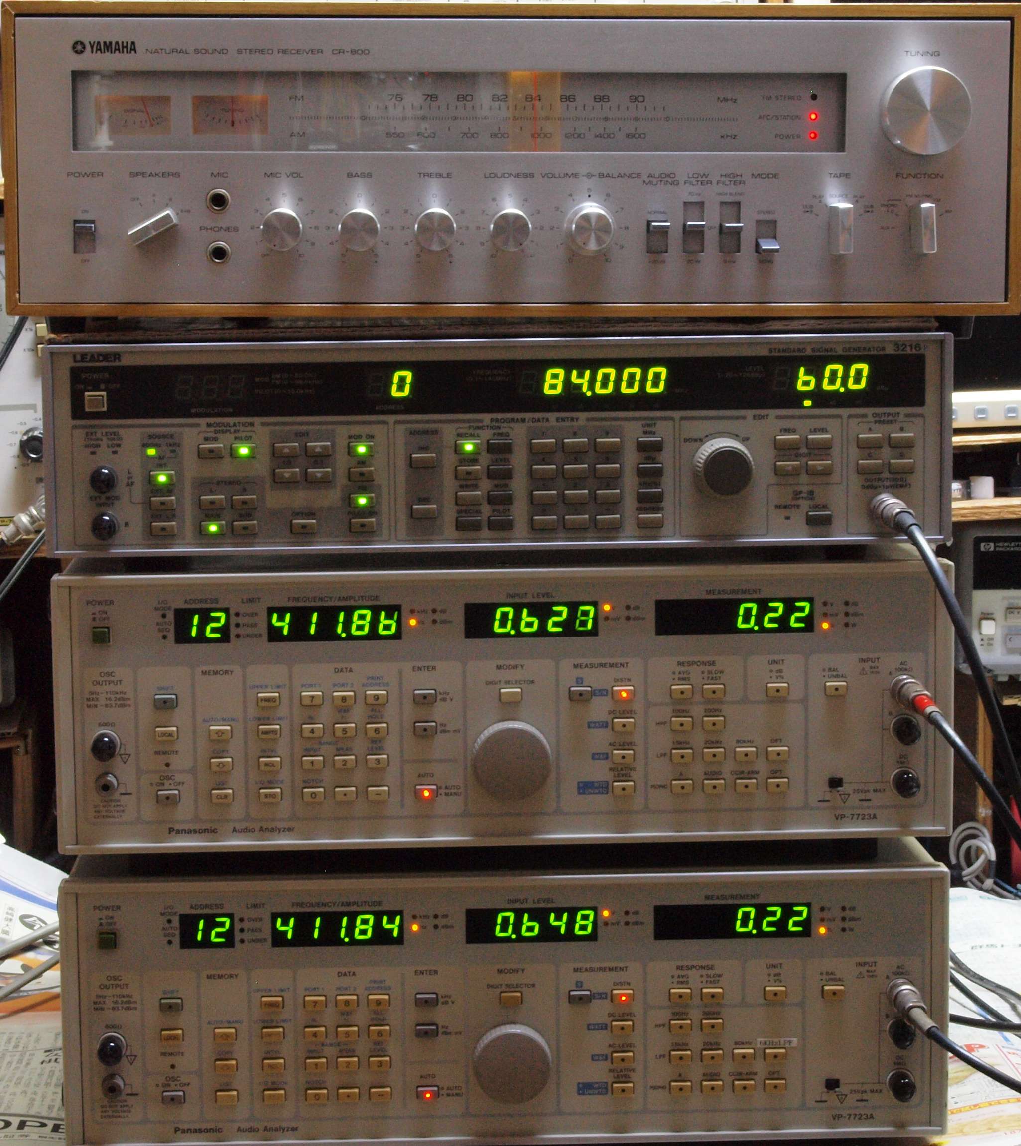 | F51. FM ステレオ受信RL分離度測定。。Log632/14=33.1dB。 <見方> 中上の「LEADER 3216P FMステレオ信号発信器」より「R側信号」を出す。 これを受信し出力を測定する。 変調周波数=400Hz、変調度=90%、 出力周波数=84MHZ、 出力レベル=60dB。 中下=R側テープ録音出力測定。 「Audio Analyzer Panasonic VP−7723A」より測定。 出力電圧=632mV、 歪み率=0.26%。 下=L側テープ録音出力測定。 「Audio Analyzer Panasonic VP−7723A」より測定。 出力電圧=14mV、 歪み率=測定不可。 |