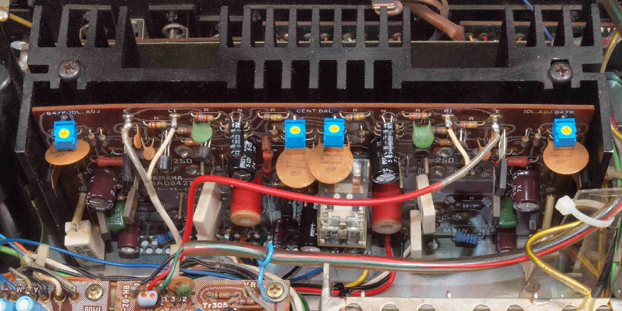 | C22. 修理後 メインアンプ基板。 半固定VR4個、足黒TR(トランジスター)6個、電解コンデンサー11個交換 | ||||||||||||||||||||||||||||||||||||||||||||||||||||||||||||||||||||||||||||||||||||||||||||||||||||||