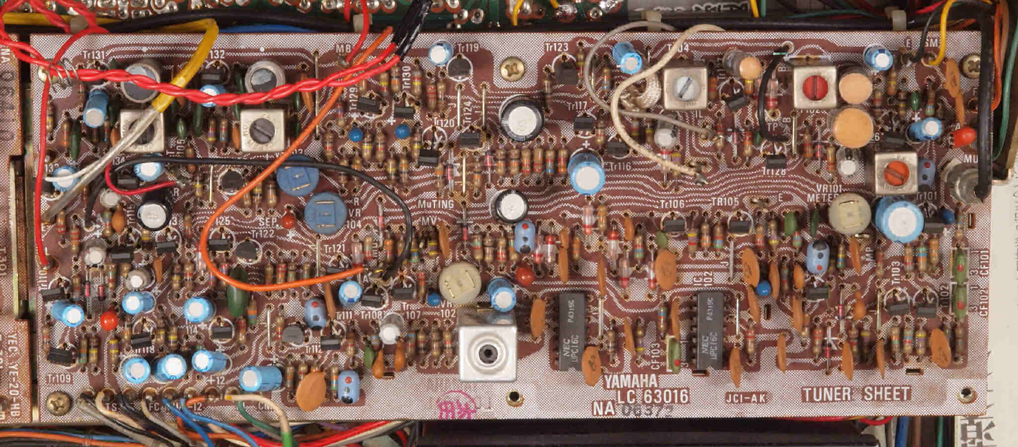 | C72. 修理後 FM受信基板。 電解コンデンサー個27、全TR(トランジスター)、半固定VR4個、フイルムコンデンサー個交換 | ||||||||||||||||||||||||||||||||||||||||||||||||||||||||||||||||||||||||||||||||||||||||||||||||||||||