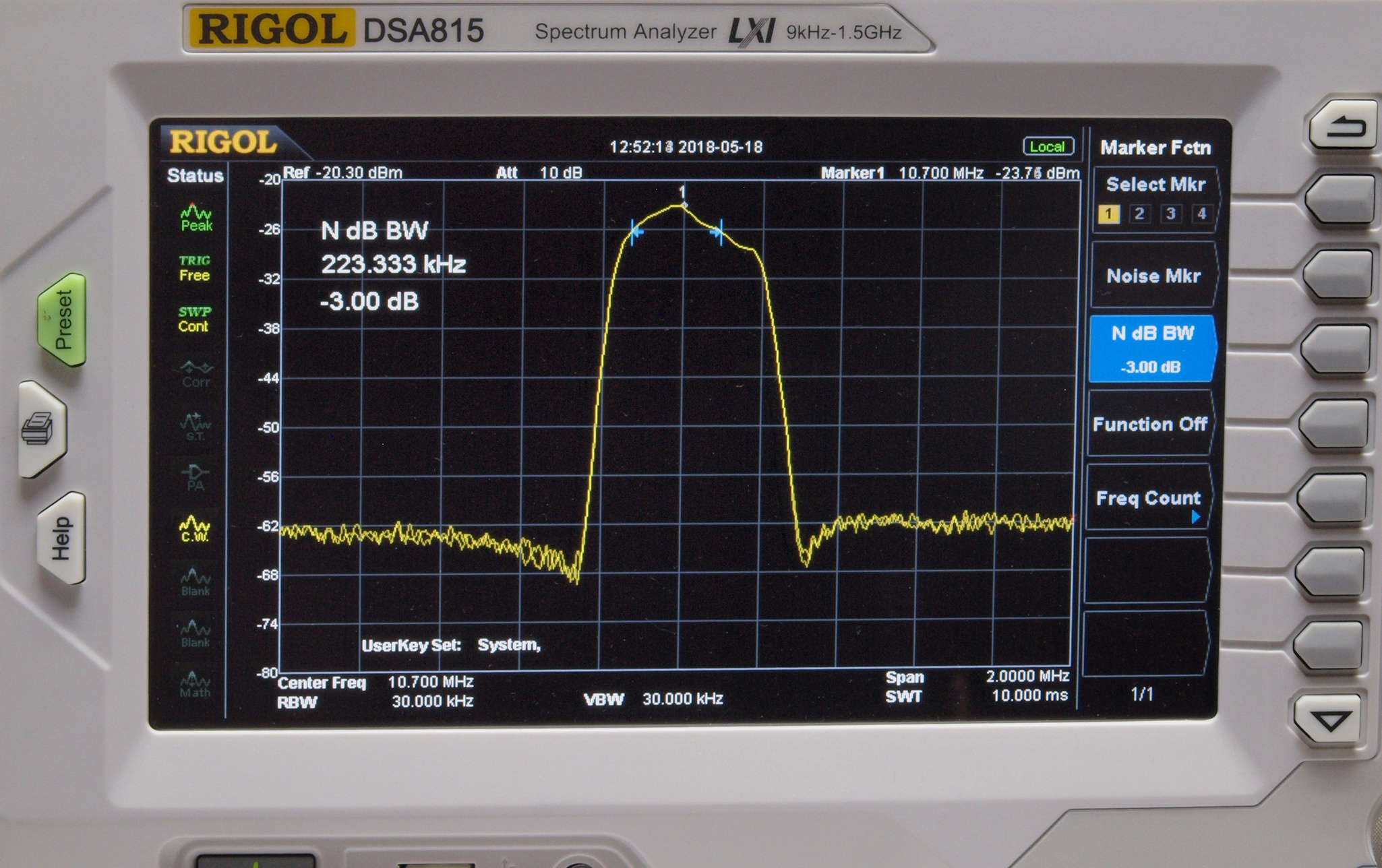 | F6. FM IF帯域測定。 Spectrum analyzer RIGOL DS815で測定。−3dBの所で223.333kHZの幅。 | ||||||||||||||||||||||||||||||||||||||||||||||||||||||||||||||||||||||||||||||||||||||||||||||||||||||