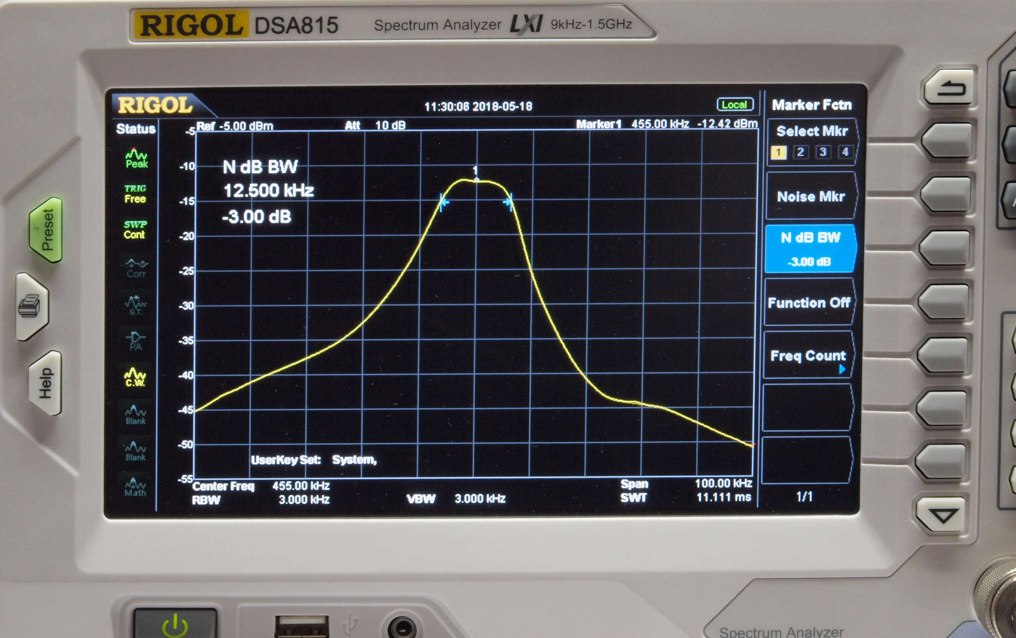 | FA4. AM IF帯域測定。 Spectrum analyzer RIGOL DS815で測定。−3dBの所で12.5kHZの幅。 | ||||||||||||||||||||||||||||||||||||||||||||||||||||||||||||||||||||||||||||||||||||||||||||||||||||||