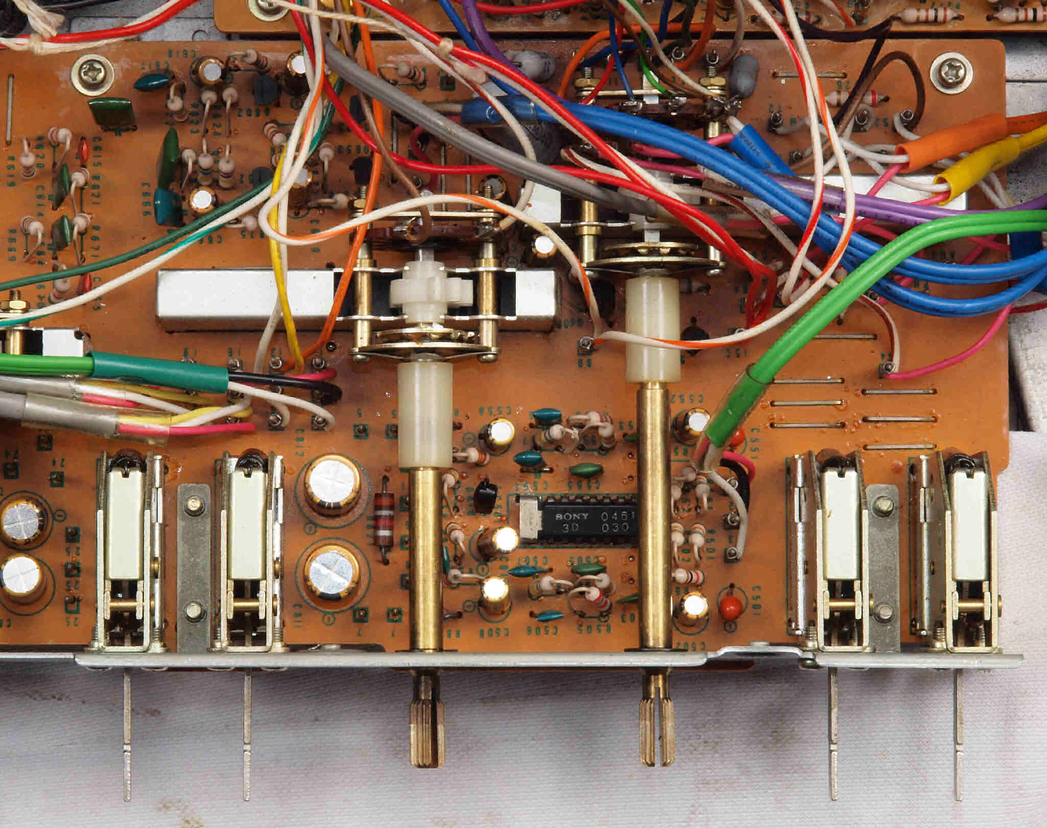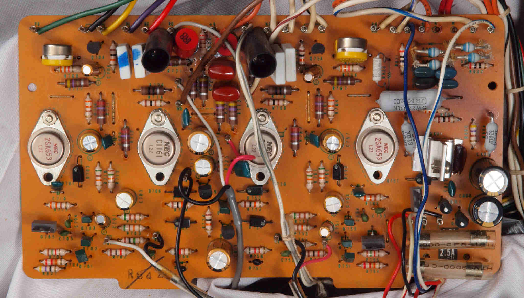 | C12. 修理後 メインAMP基板。 電解コンデンサー13個、半固定VR4個交換。 | ||||||||||||||||||||||||||||||||||||||||||||||||||||||||||||||||||||||||||||||||||||||||||||||||||||||||||
