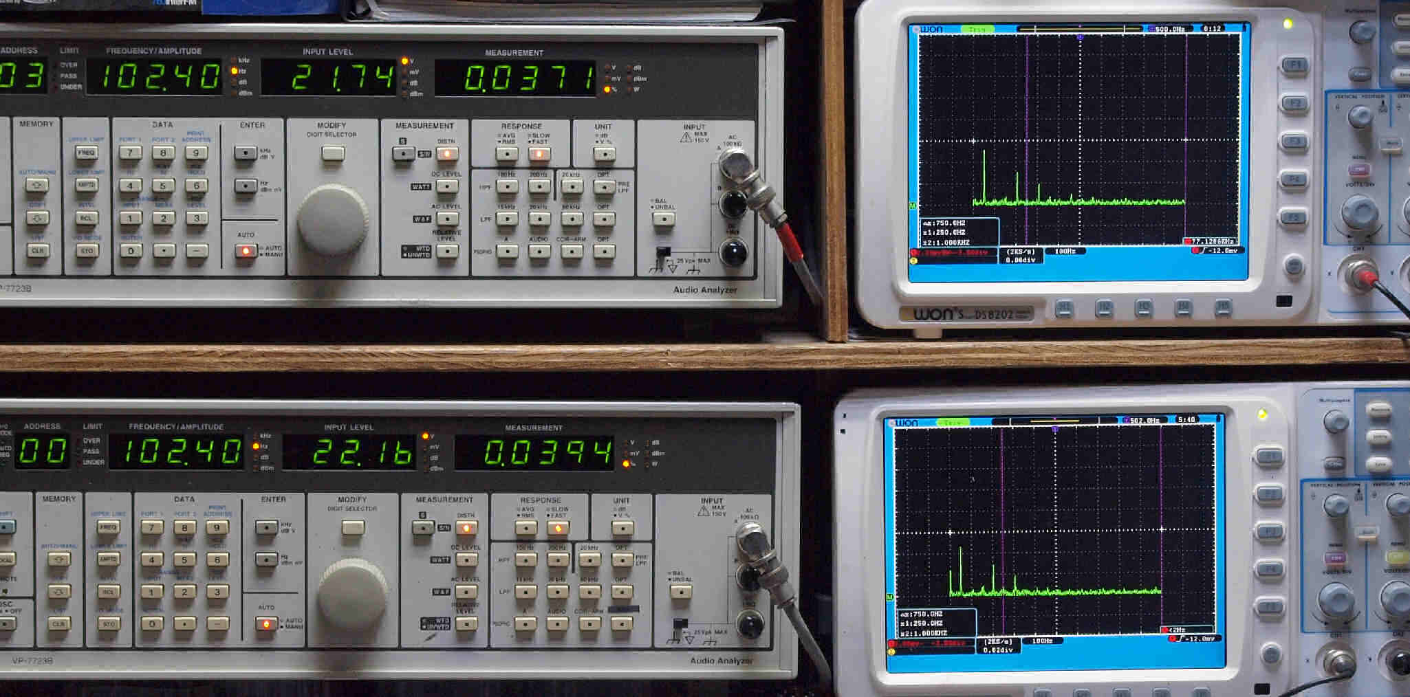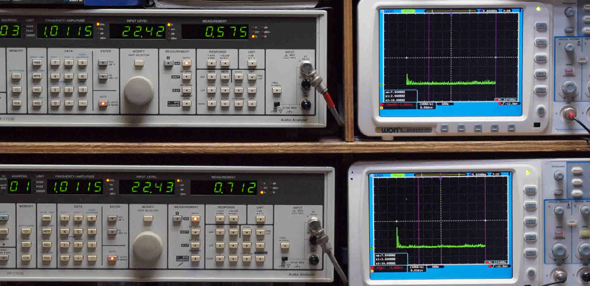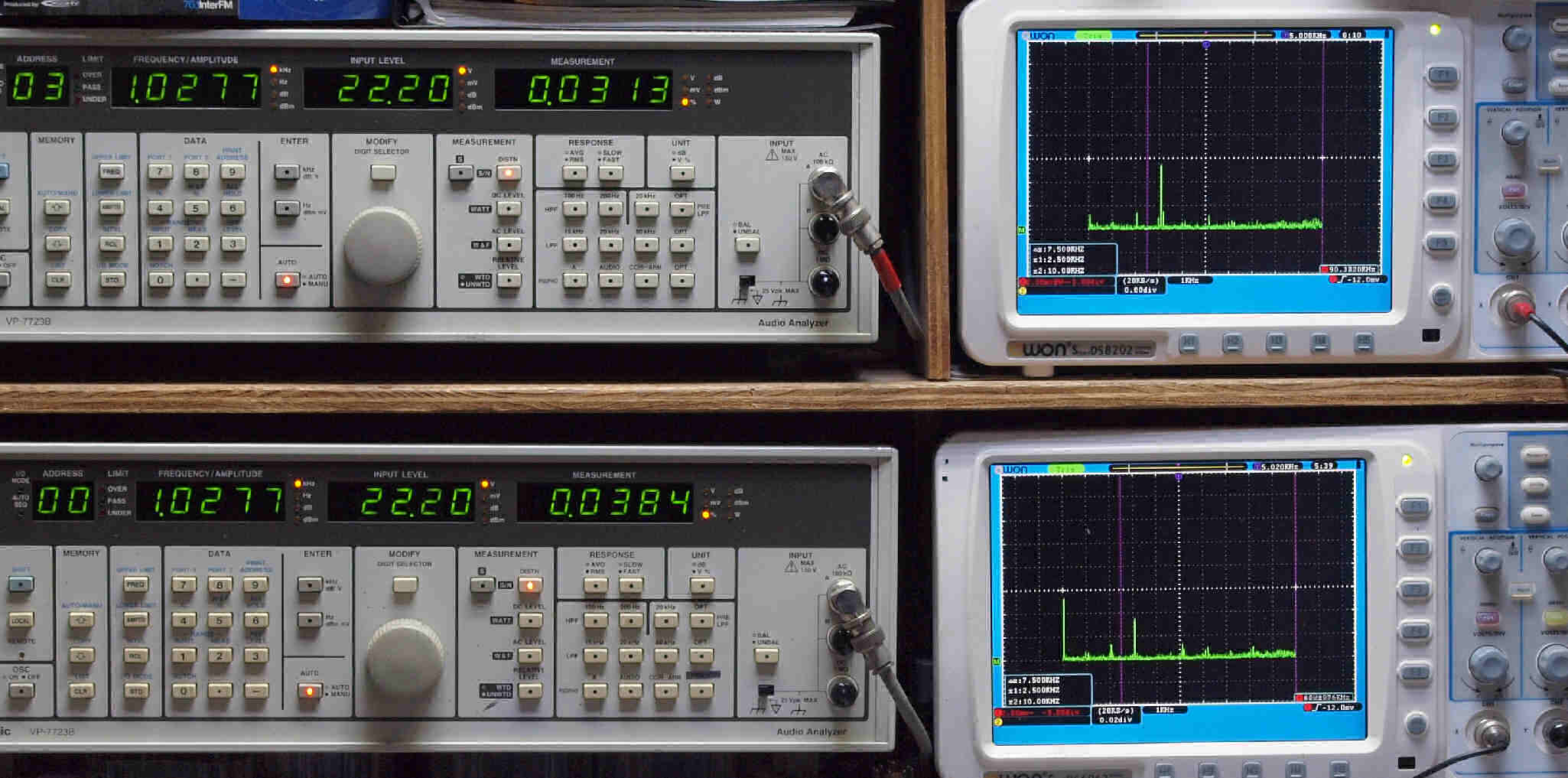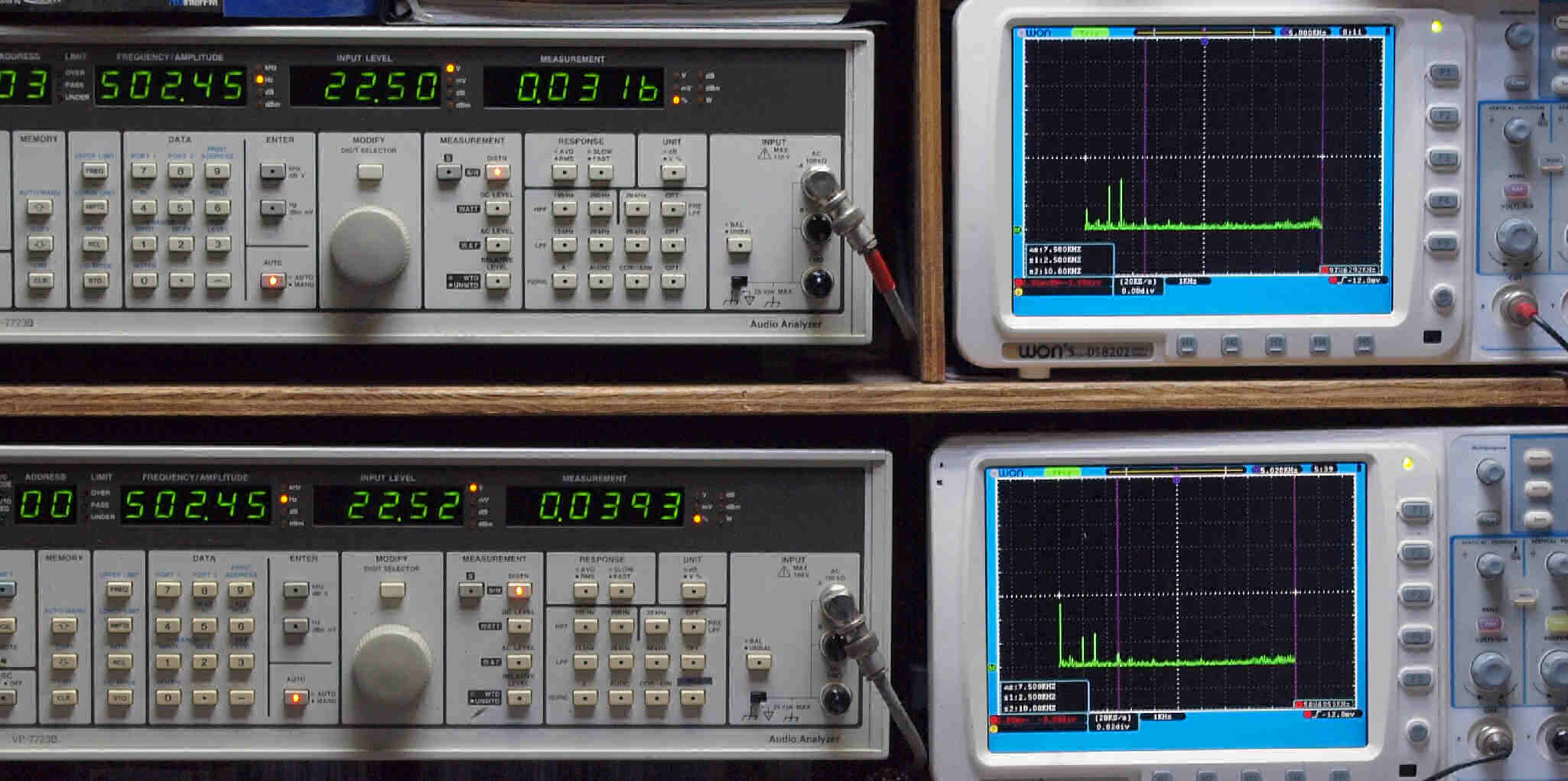 | E. 測定・調整 E1. 出力・歪み率測定・調整 「見方」。 上段中 右側SP出力を「Audio Analyzer Panasonic VP−7723B」により測定。 表示LED、 左端=メモリーNo、 中左=周波数測定、 中右=出力電圧測定、 右端=歪み率測定。 上段右端 VP−7723Bの基本波除去出力を「owon SDS8202(200MHZ)」で「FFT分析」表示。 下段中 左側SP出力を「Audio Analyzer Panasonic VP−7723B」により測定。 表示LED、 左端=メモリーNo、 中左=周波数測定、 中右=出力電圧測定、 右端=歪み率測定。 下段右端 VP−7723Bの基本波除去出力を「owon SDS6062(200MHZ)」で「FFT分析」表示。 下段左端 オーディオ発振器 VP−7201A より50Hz〜100kHzの信号を出し(歪み率=約0.003%)、ATT+分配器を通し、AMPに入力。 よって、ダイアル設定出力レベルより低くなります。測定機器の仕様や整備の様子はこちら、「VP−7723B」「VP−7201A」。 FFT画面の見方はこちら。 |